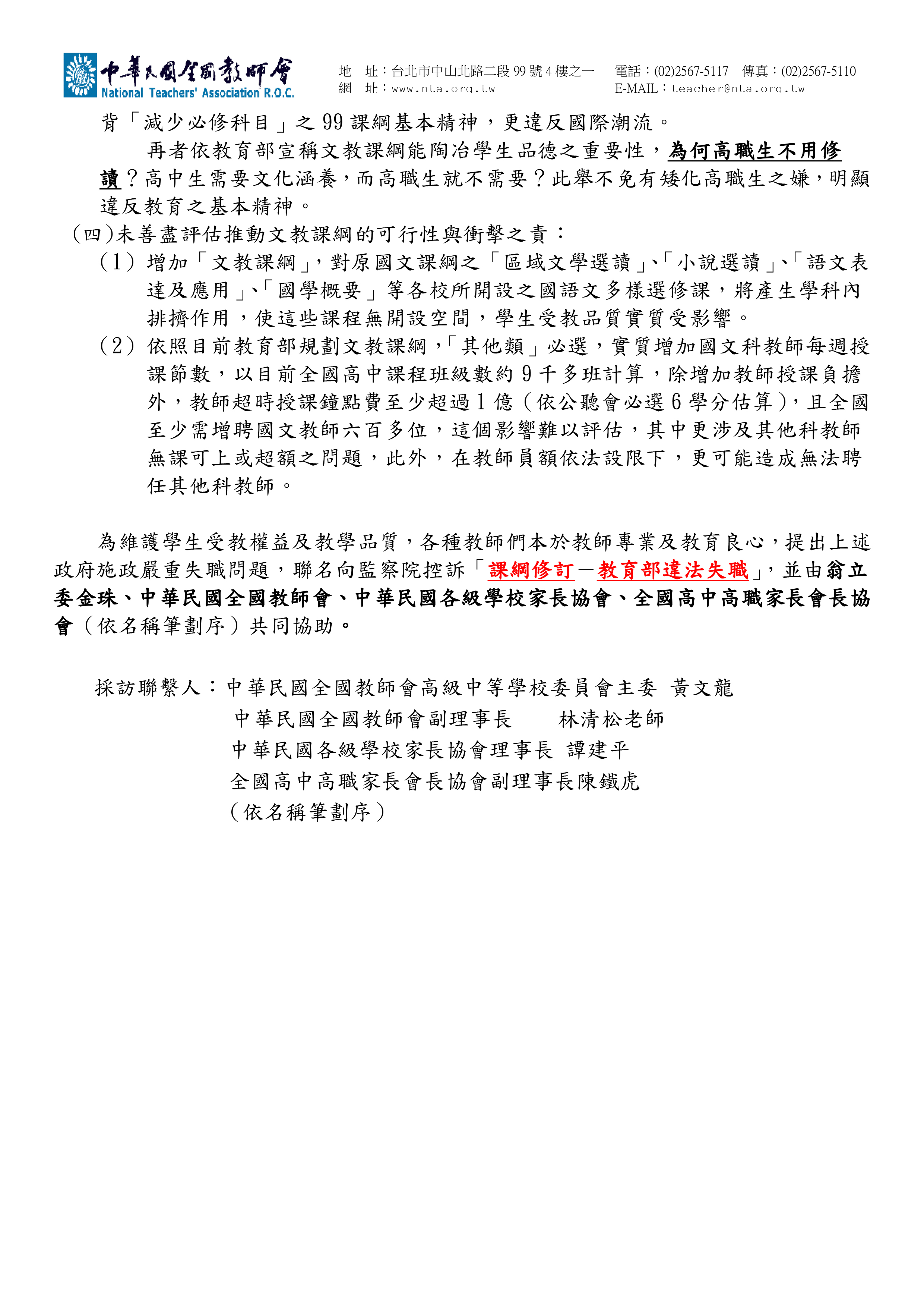 教育部於今(2011)年農曆春節前後,短短三星期時間,快速通過「普通高級中學中華文化基本教材課程綱要(草案)」(以下簡稱文教課綱),與以往課綱制定時間最短也要兩年,最長要三、五年相比,展現驚人的政府效能。將文教課綱列為「其他類」及「必選」,造成高中教學配課的困擾,學生毫無選修空間,更使教育多元選修的理想消失,激起教師、家長及學生的反對聲浪。全國教師會除於3月14日收到部分教師反對的連署書以外,3月29日收到部分學校學生及家長近9000份「反對中華文化基本教材列為必選,要求改列語文類選修」的連署文件。臉書上更出現兩千三百多位連署【救救高中生】-「反對中華文化基本教材列入非考科選修」,反對聲浪一波接一波,值得教育主管機關審慎而後行。為維護學生受教權益及教學品質,今(5月5日)有現職高中各科教師本於教師專業及教育良心,提出此次課綱修訂教育部有四項違法失職的論述,由本會(中華民國全國教師會)及翁立委金珠、中華民國各級學校家長協會、全國高中高職家長會長協會共同協助,向監察院陳訴。