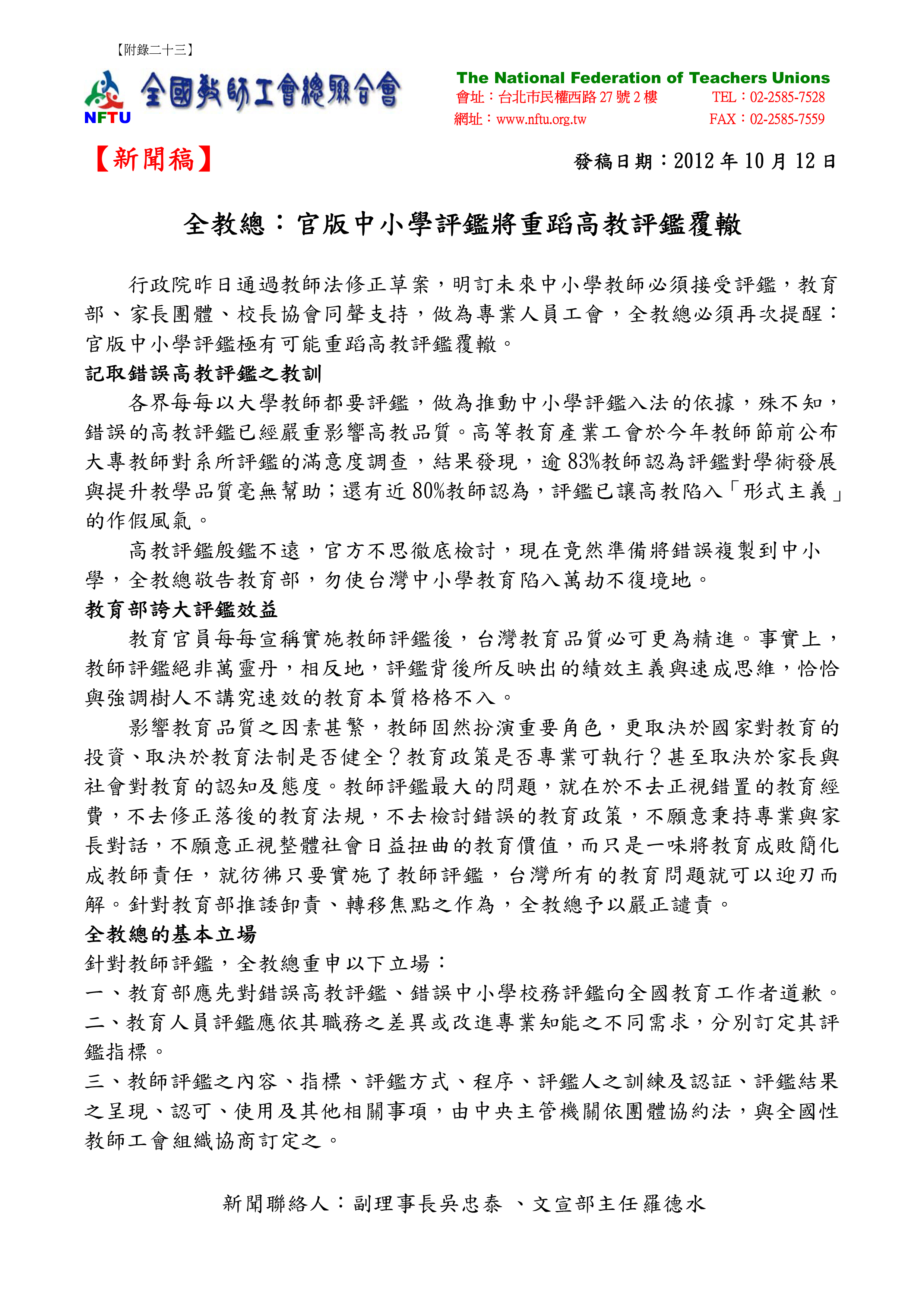 20121012【新聞稿】全教總:官版中小學評鑑將重蹈高教評鑑覆轍