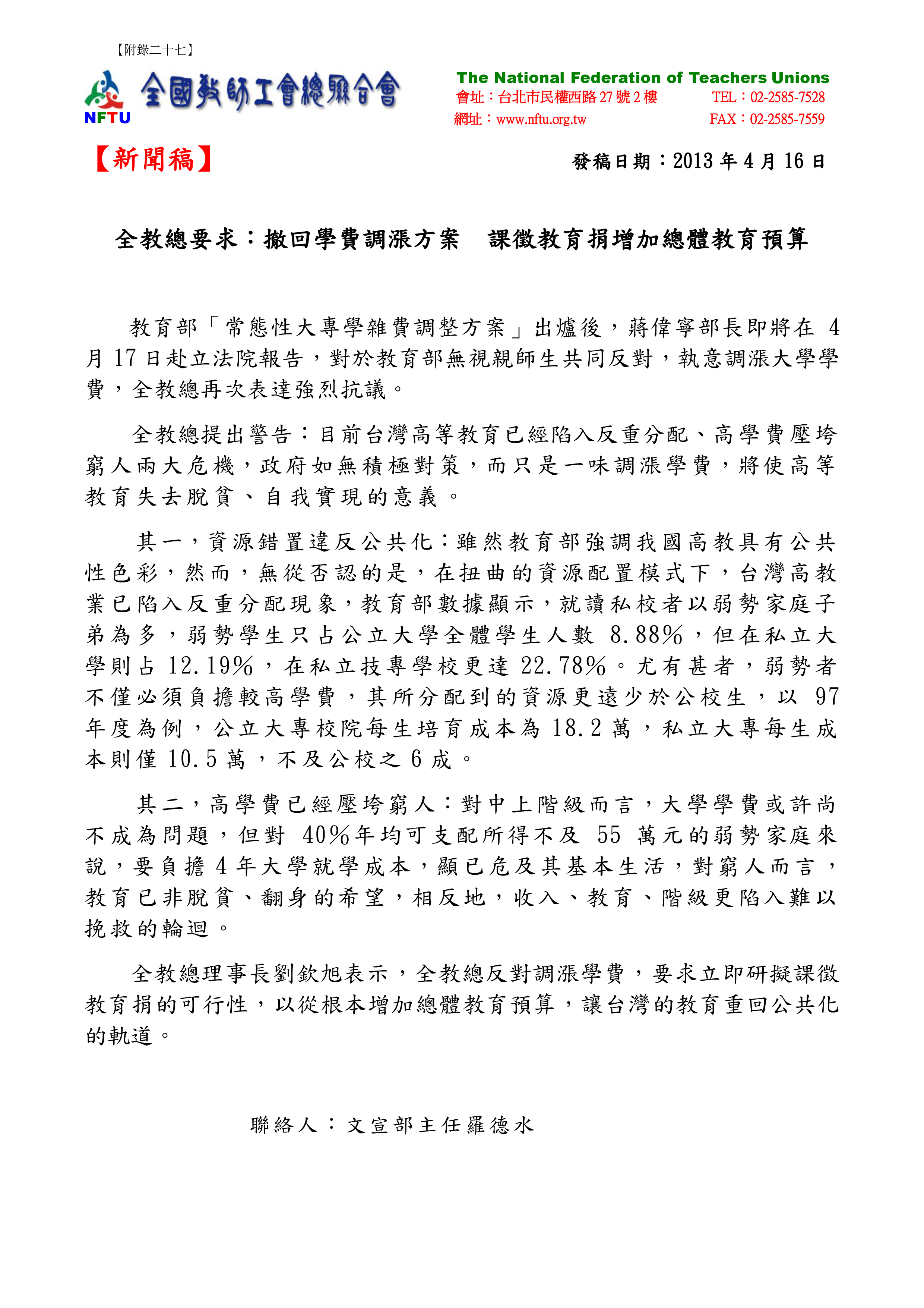 20130416【新聞稿】全教總要求:撤回學費調漲方案 課徵教育捐增加總體教育預算