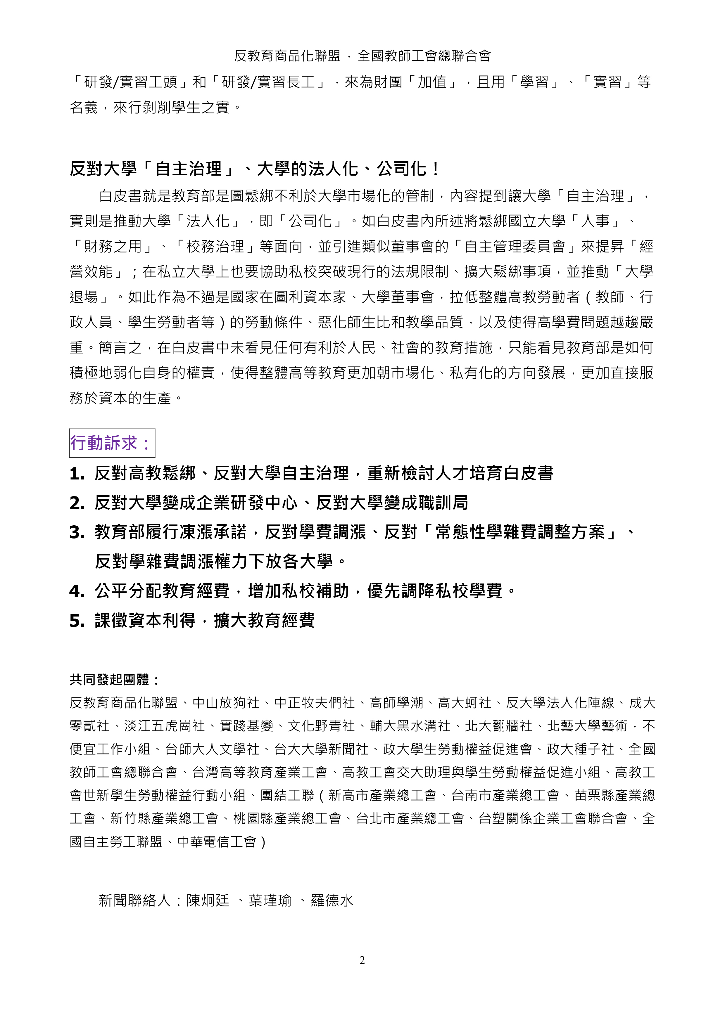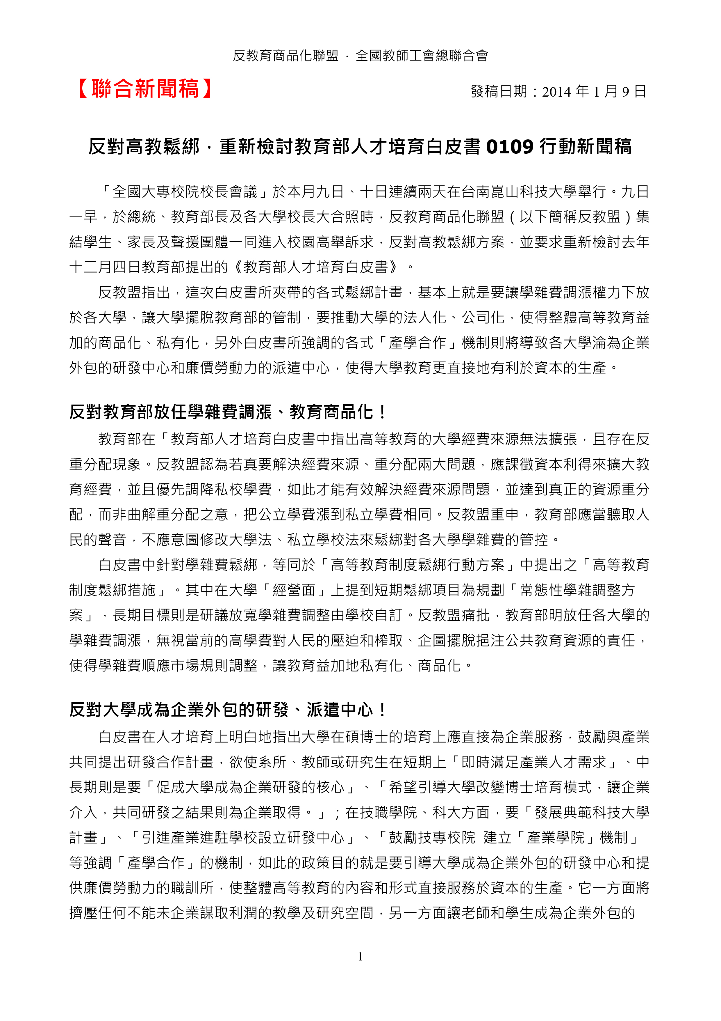 20140109【聯合新聞稿】反對高教鬆綁,重新檢討教育部人才培育白皮書0109行動