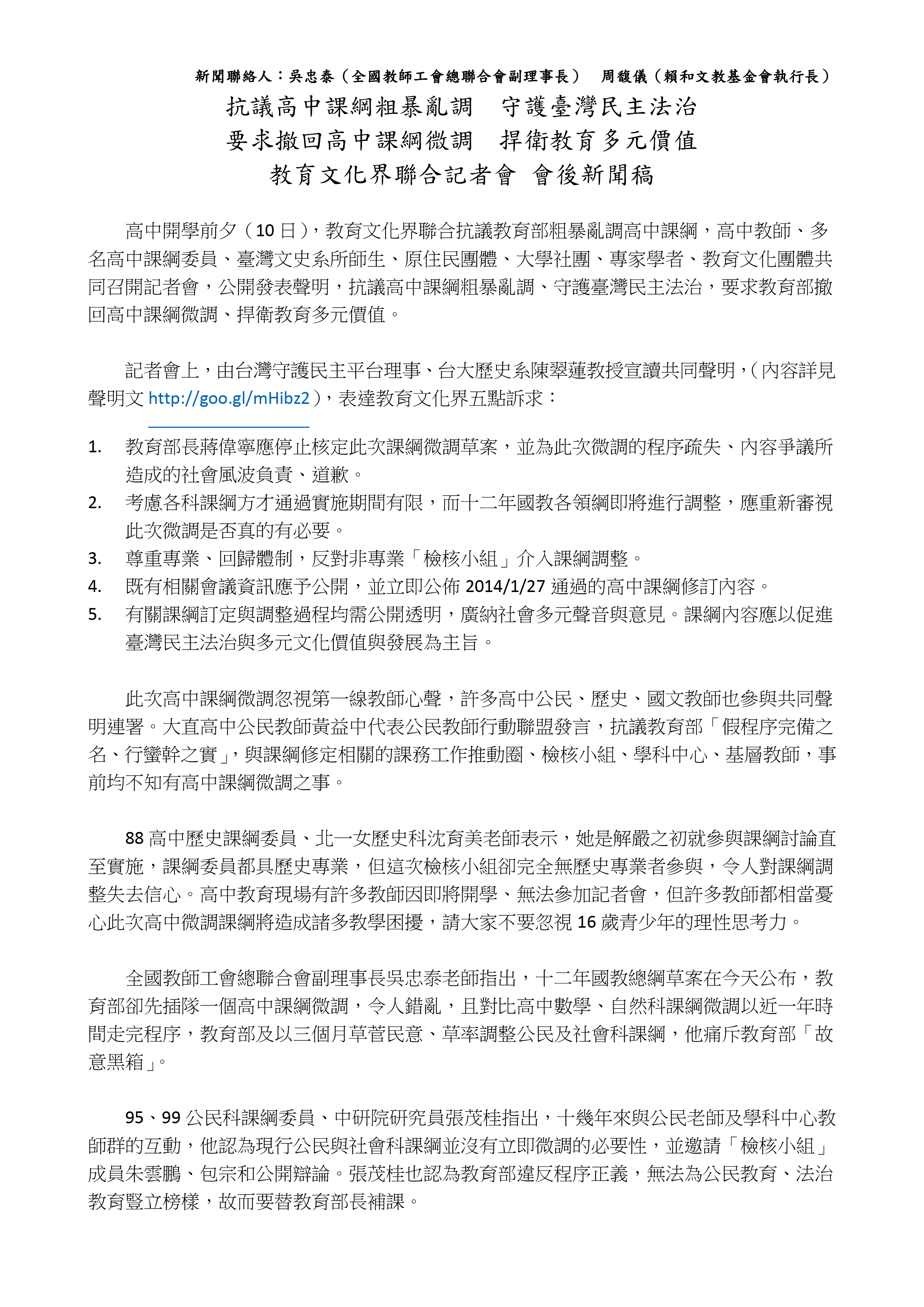 20140209【聯合新聞稿】抗議高中課綱粗暴亂調 守護臺灣民主法治 要求撤回高中課綱微調 捍衛教育多元價值