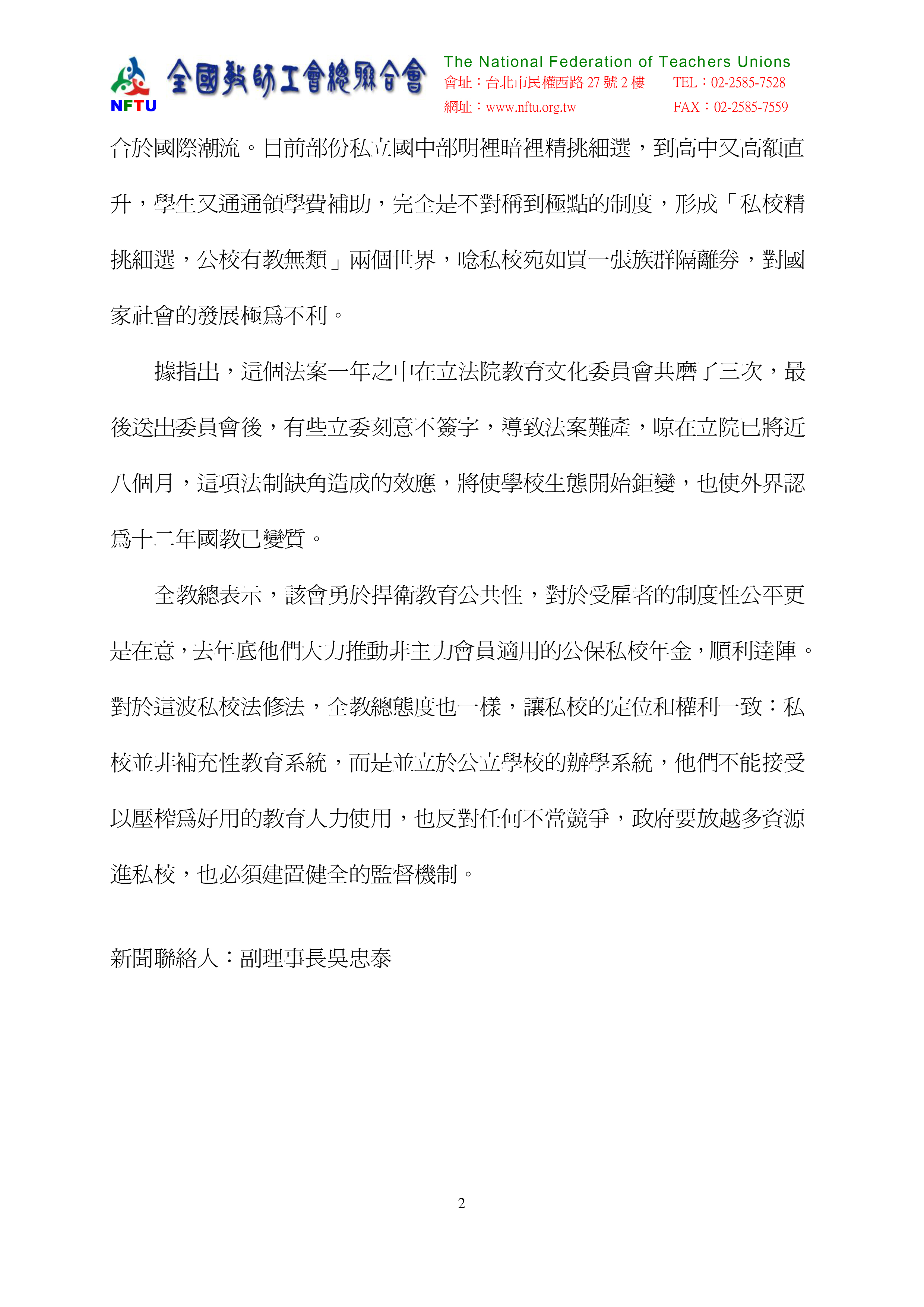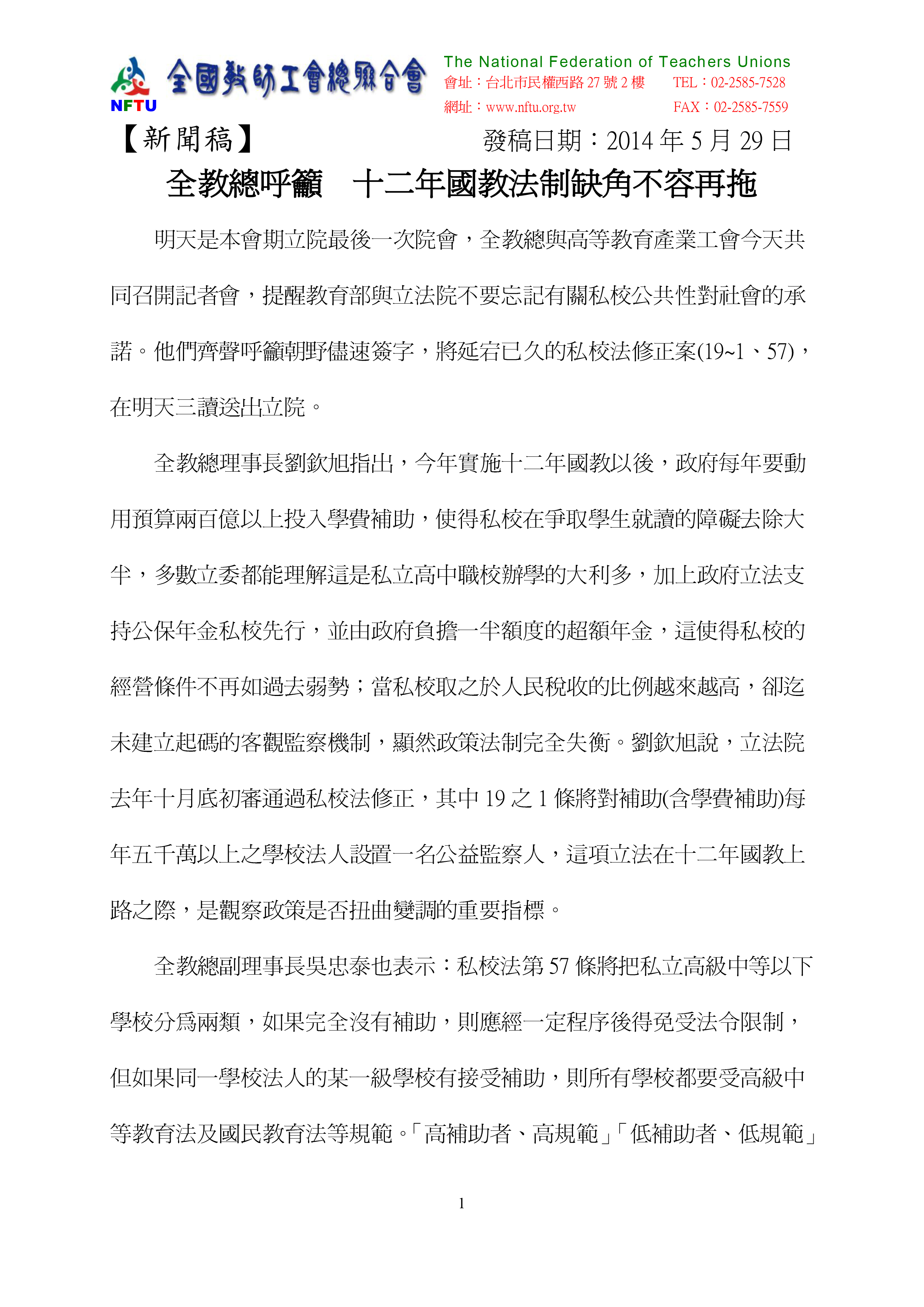 全教總與高等教育產業工會於2014年5月29日共同召開記者會,齊聲呼籲朝野儘速簽字,將延宕已久的私校法修正案(19~1、57),更應三讀送出立院。全教總指出2014年實施十二年國教後,政府每年要動用預算兩百億以上投入學費補助私校,加上支持私校公保年金政府負擔一半額度的超額年金;當私校取之於人民稅收的比例越來越高,但立法院去年十月底初審通過私校法修正,其中19之1條將對補助(含學費補助)每年五千萬以上之學校法人設置一名公益監察人,卻迄未建立起碼的客觀監察機制,顯然政策法制完全失衡。