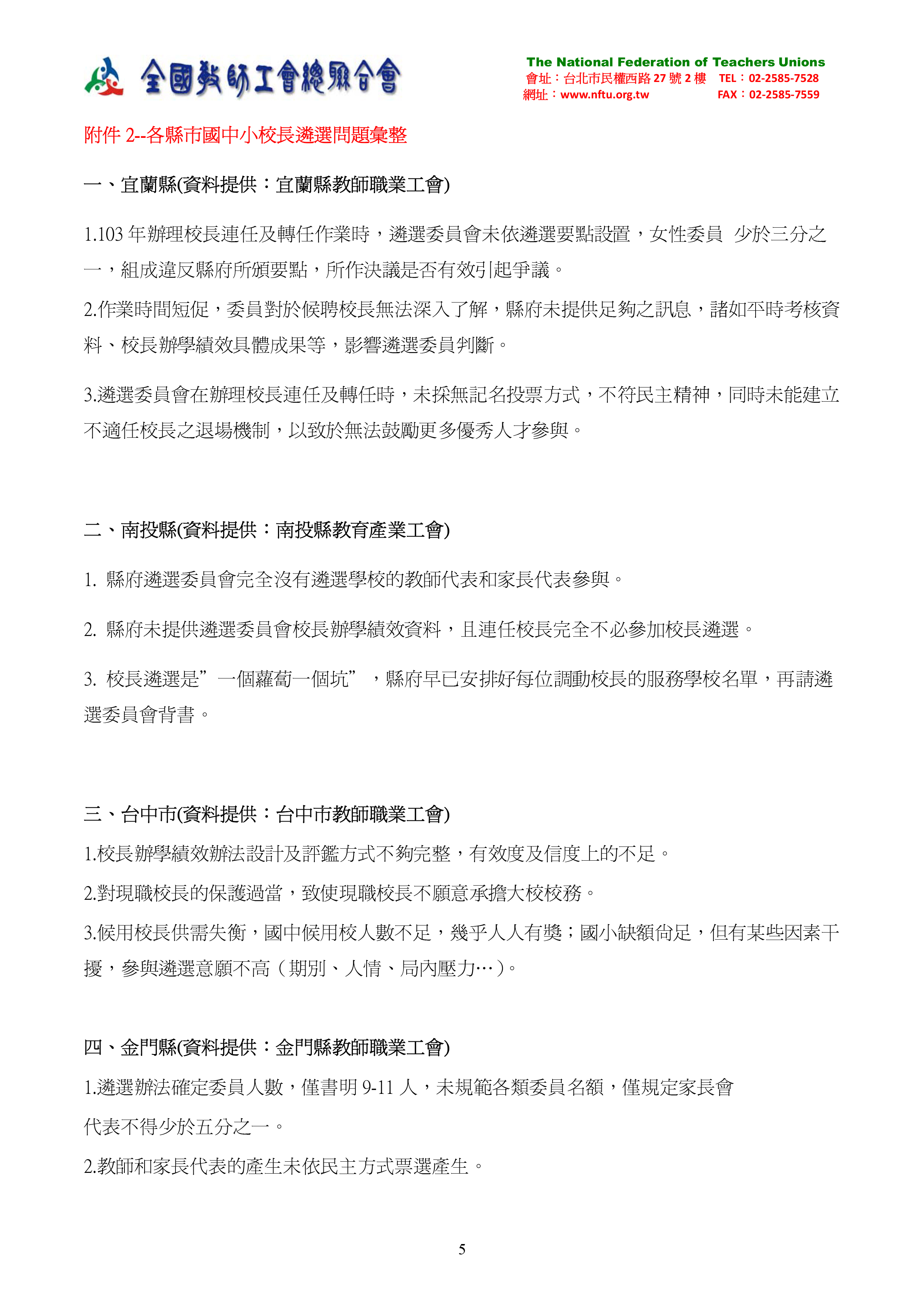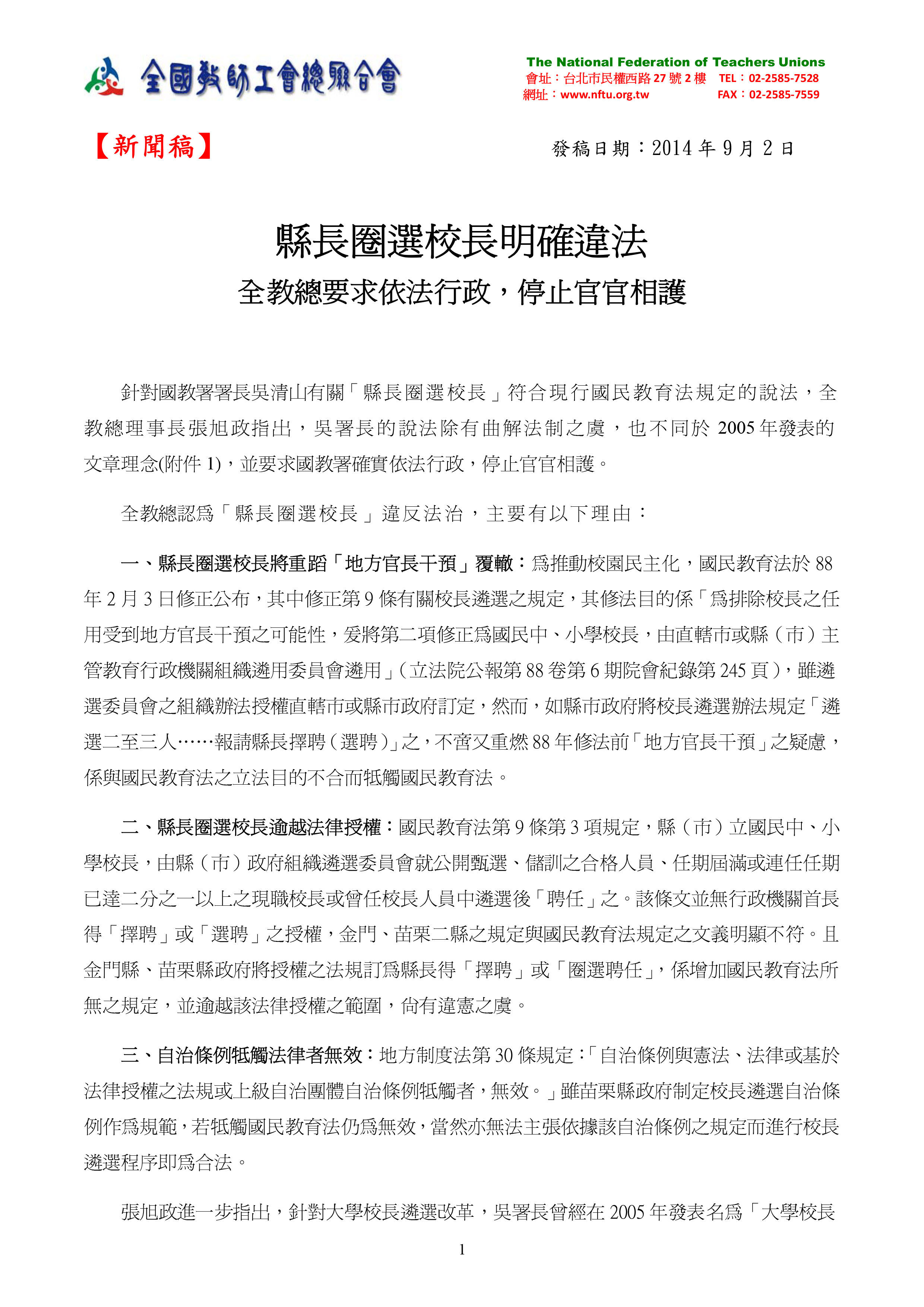 全教總認為「縣長圈選校長」違反法治,主要有以下理由:1、縣長圈選校長將重蹈「地方官長干預」覆轍:為推動校園民主化,國民教育法於1999年修正第9條其修法目的係「為排除校長之任用受到地方官長干預之可能性,爰將第二項修正為國民中、小學校長,由直轄市或縣(市)主管教育行政機關組織遴用委員會遴用」(立法院公報第88卷第6 期院會紀錄第245 頁);2、縣長圈選校長逾越法律授權:國民教育法第9 條第3 項規定,該條文並無行政機關首長得「擇聘」或「選聘」之授權,金門、苗栗二縣之規定與國民教育法規定之文義明顯不符並逾越該法律授權之範圍,尚有違憲之虞;3、自治條例牴觸法律者無效:雖苗栗縣政府制定校長遴選自治條例作為規範,若牴觸國民教育法仍為無效,當然亦無法主張依據該自治條例之規定而進行校長遴選程序即為合法。