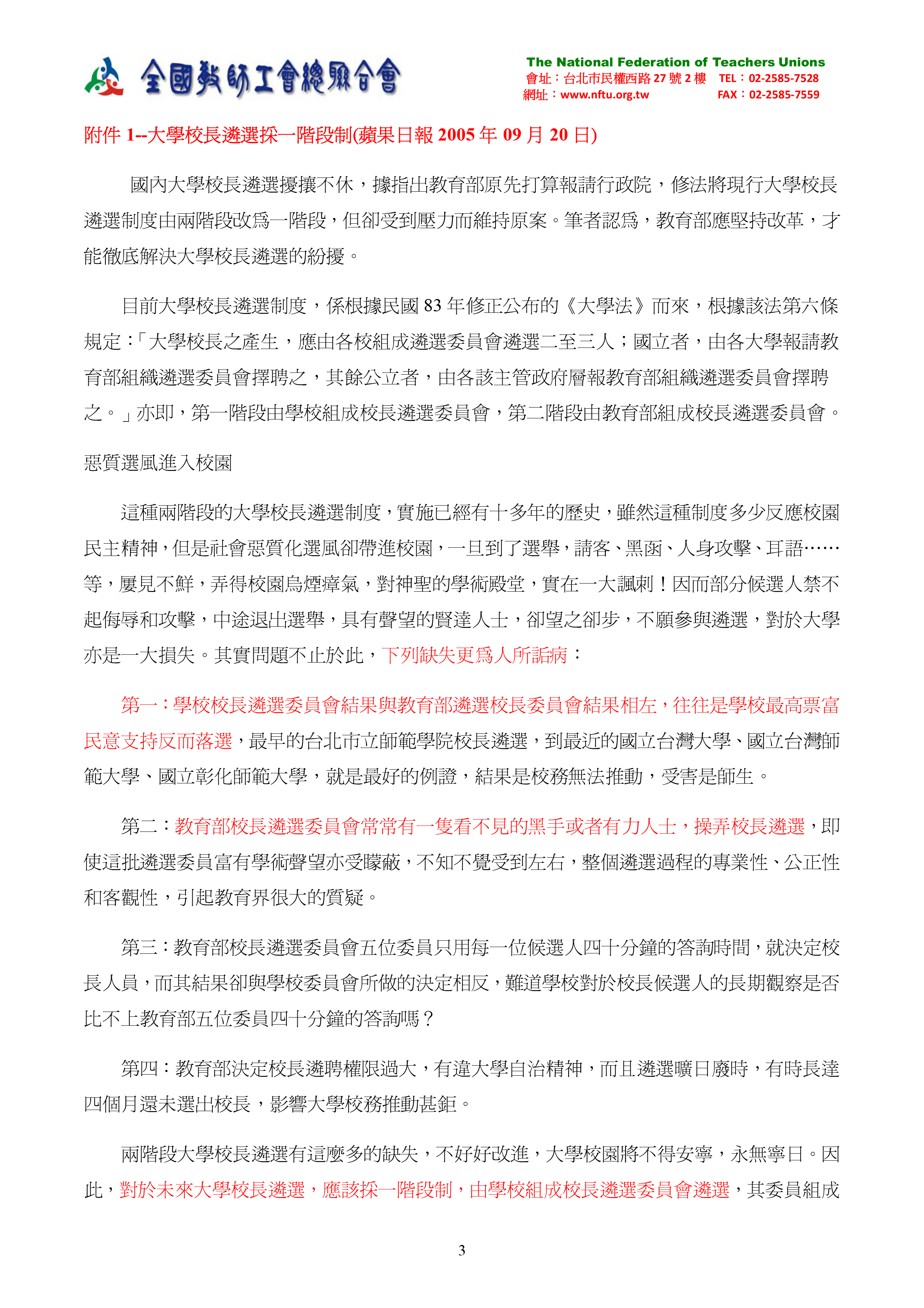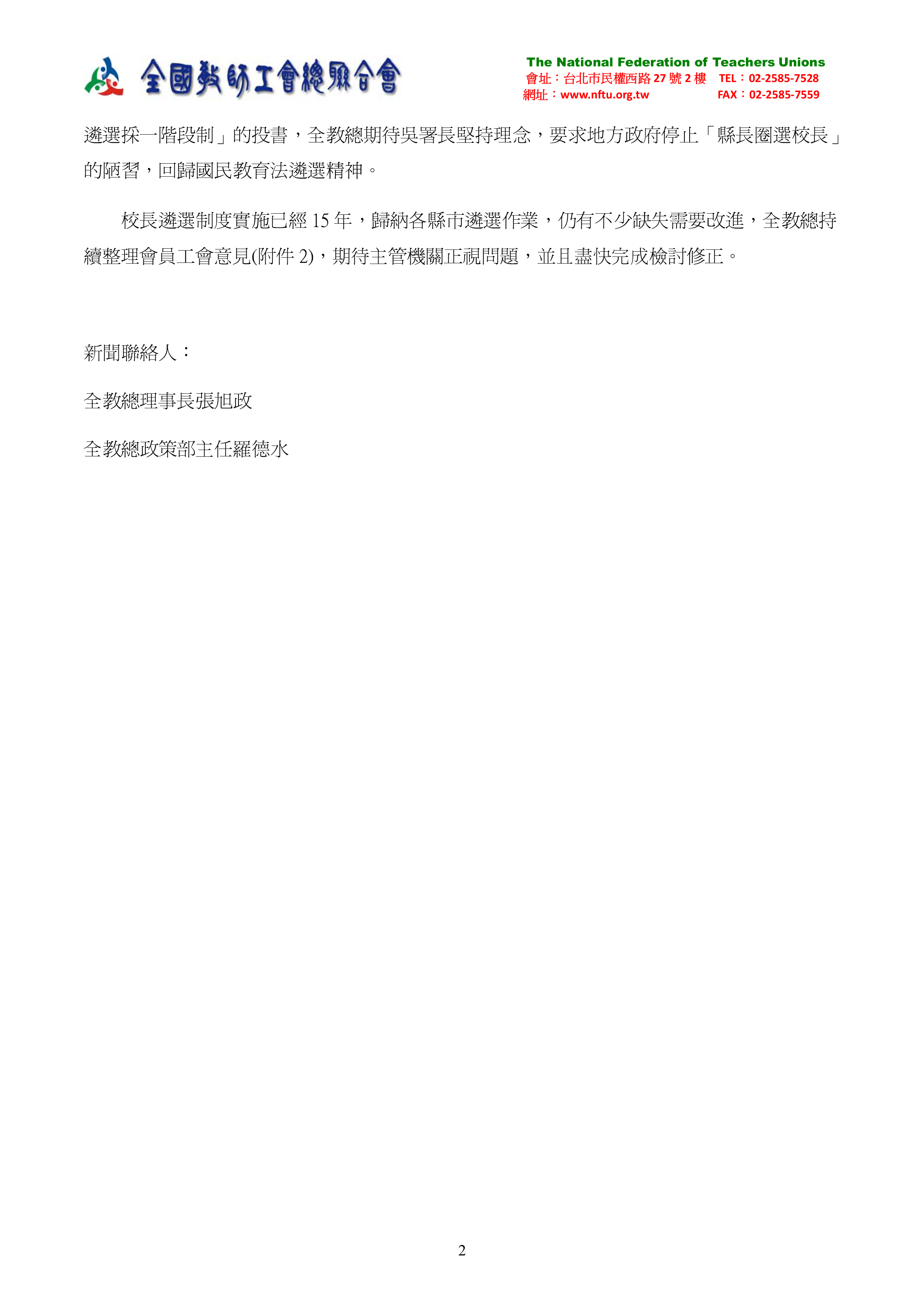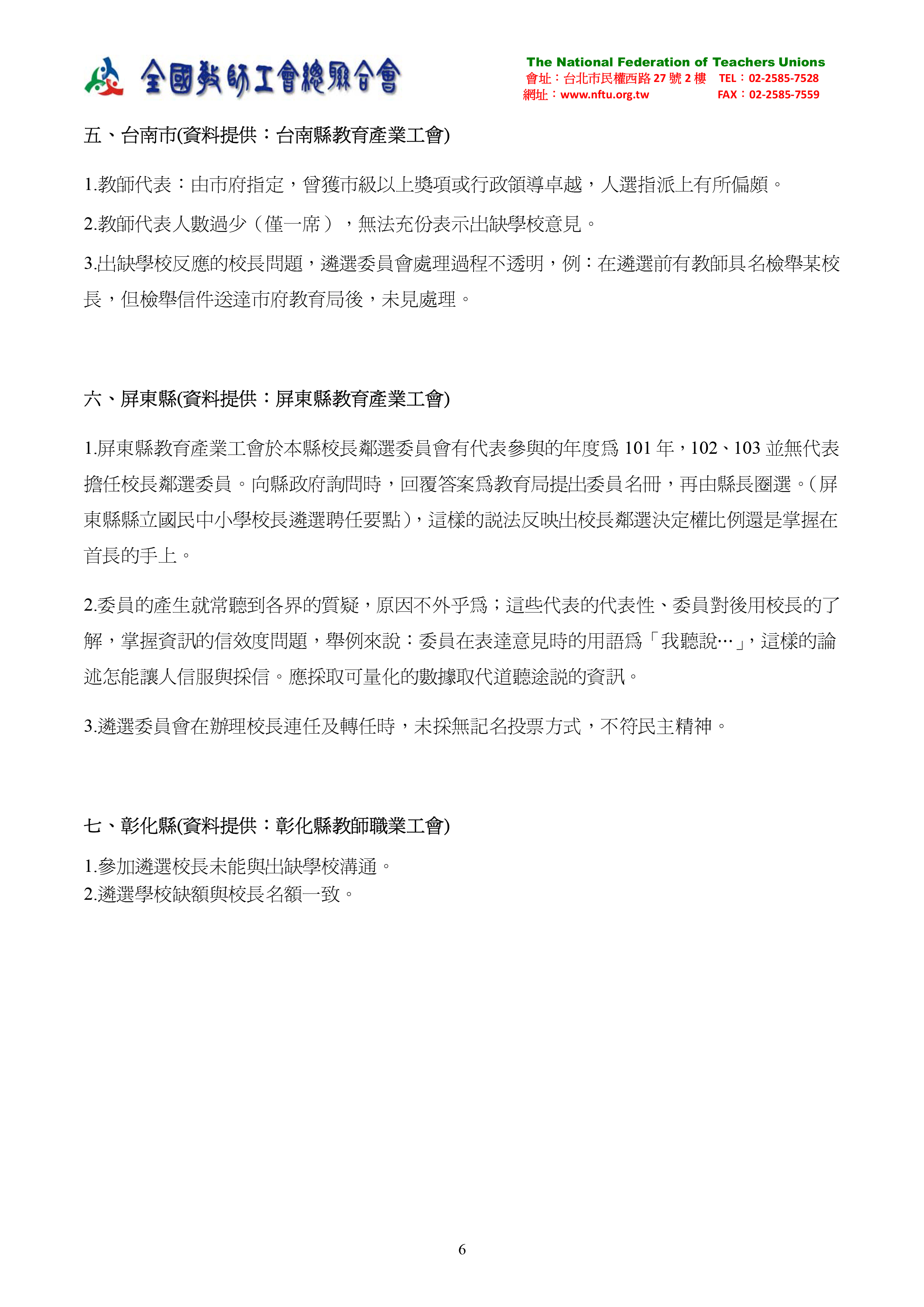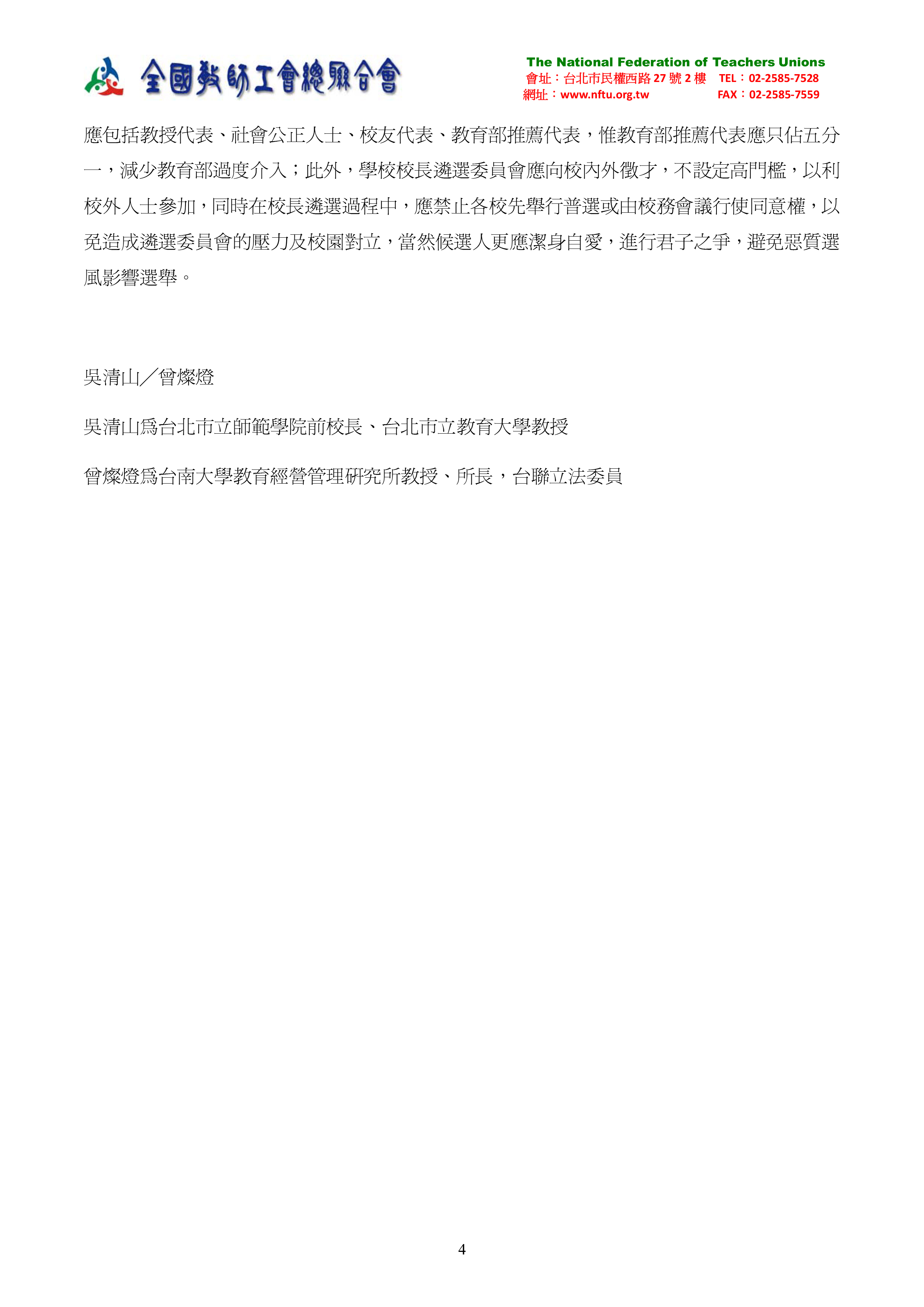 全教總指出針對國教署署長吳清山有關「縣長圈選校長」符合現行國民教育法規定的說法,除有曲解法制之虞,也不同於吳署長曾經在2005年發表名為「大學校長遴選採一階段制」的文章理念,並要求國教署確實依法行政,停止官官相護。