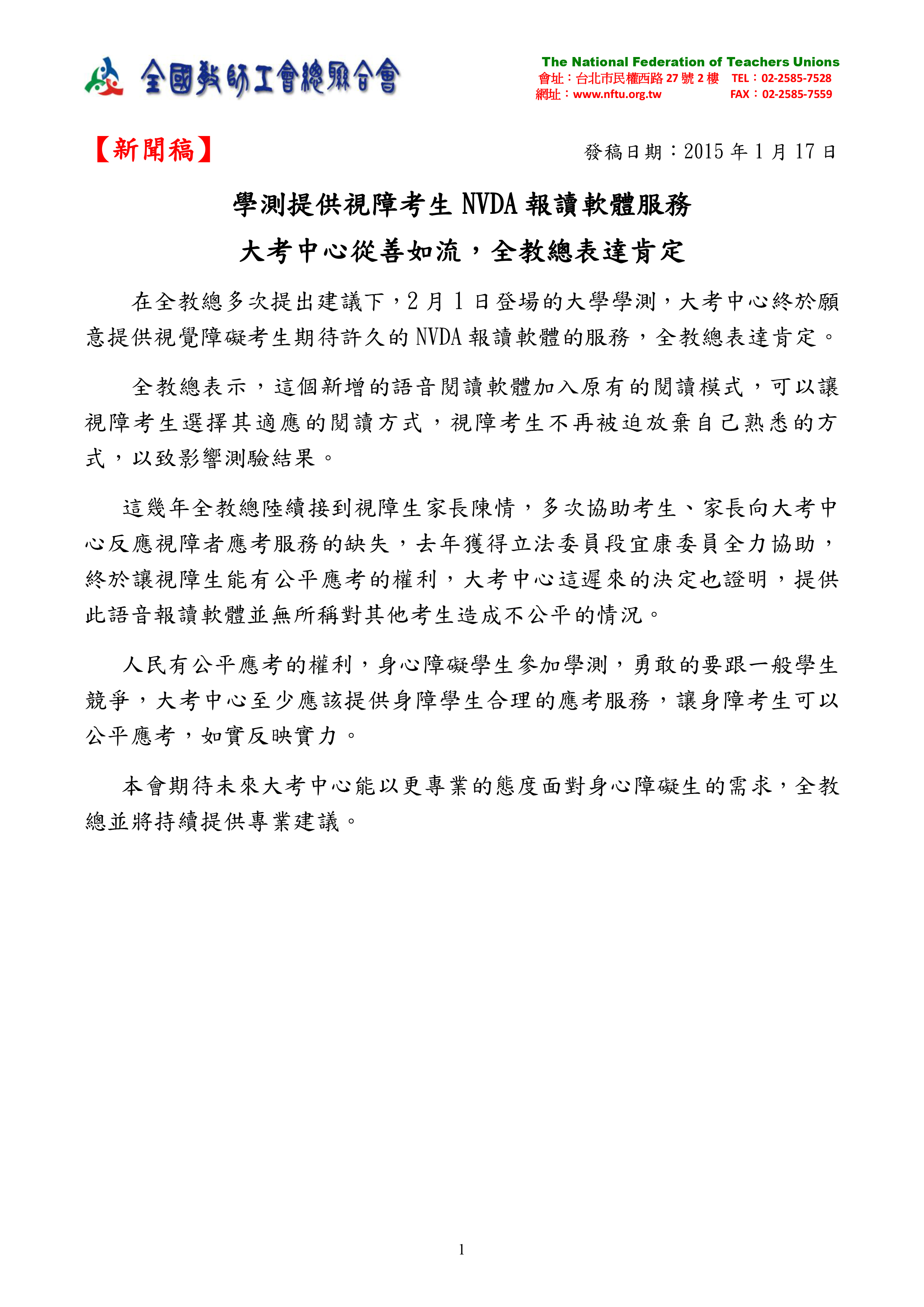 全教總表達肯定2015年2月1日登場的大學學測,大考中心終於願意提供視覺障礙考生期待許久的 NVDA 報讀軟體的服務。