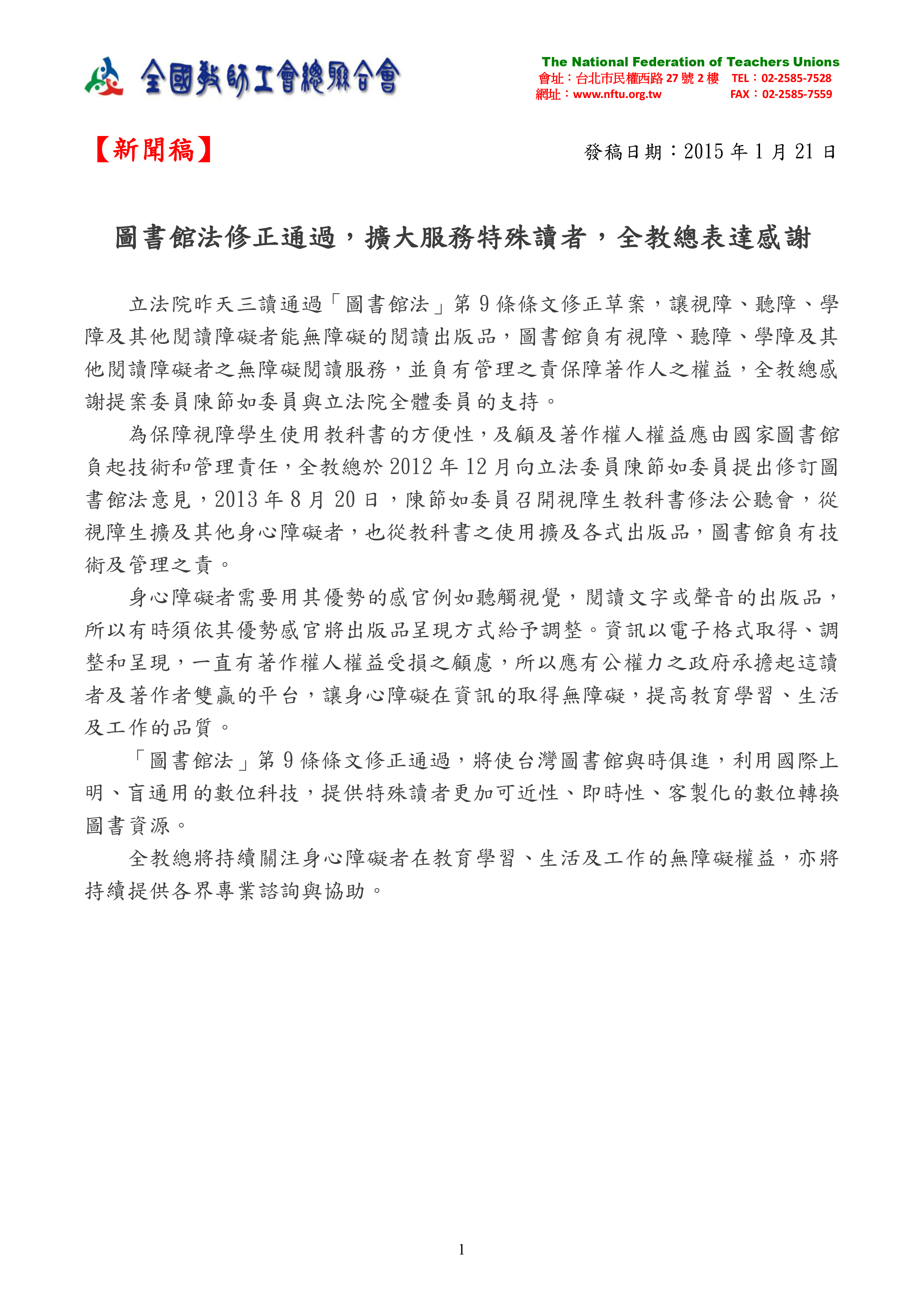 全教總感謝提案委員陳節如委員與立法院全體委員的支持,三讀通過「圖書館法」第9條條文修正草案,讓視障、聽障、學障及其他閱讀障礙者能無障礙的閱讀出版品,圖書館負有視障、聽障、學障及其他閱讀障礙者之無障礙閱讀服務,並負有管理之責保障著作人之權益,此修法將使台灣圖書館與時俱進,利用國際上明、盲通用的數位科技,提供特殊讀者更加可近性、即時性、客製化的數位轉換圖書資源。