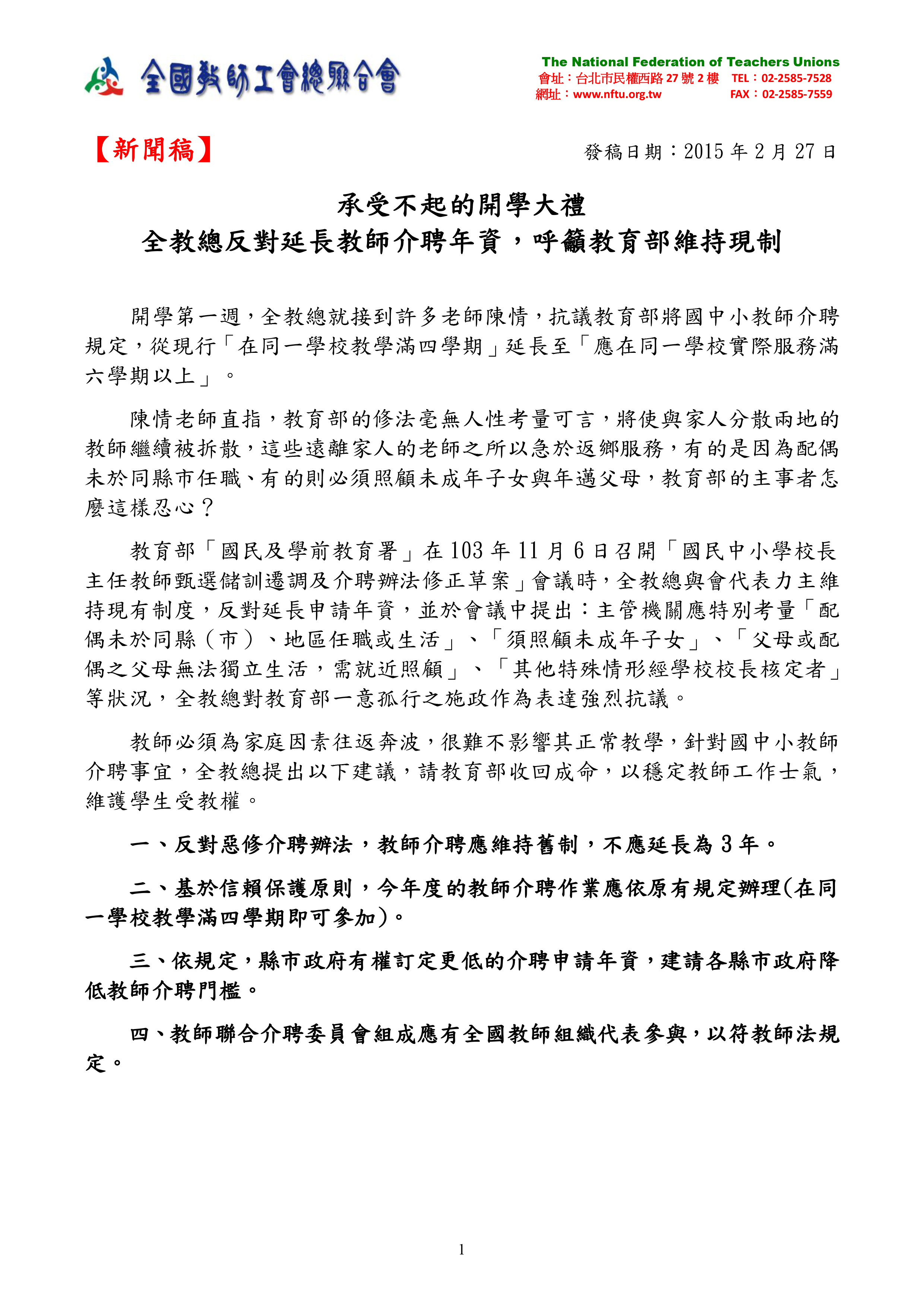 一、反對惡修介聘辦法,教師介聘應維持舊制,不應延長為3年。