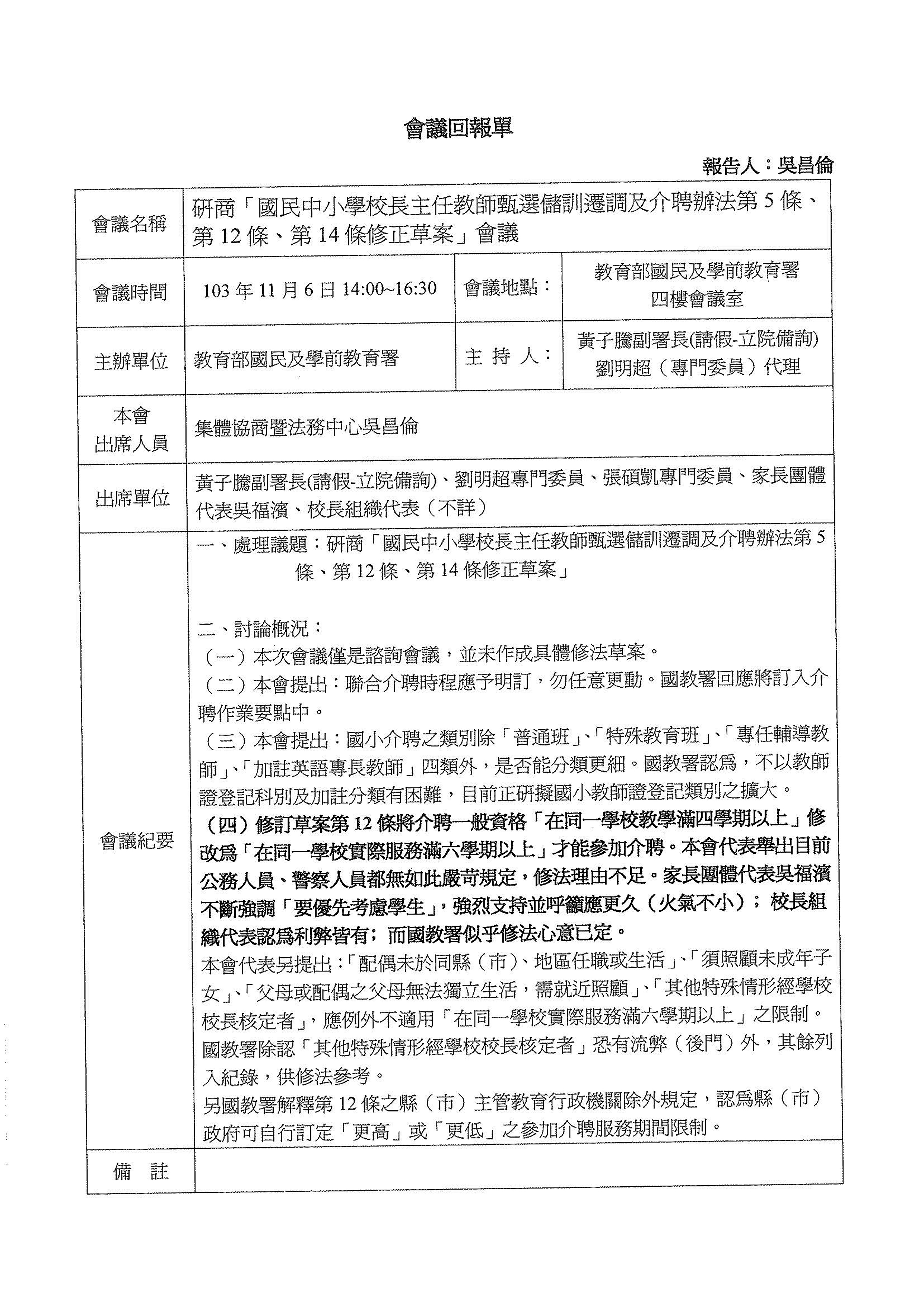 全教總指出教育部「國民及學前教育署」在2014年11月6日召開「國民中小學校長主任教師甄選儲訓遷調及介聘辦法修正草案」會議時,全教總與會代表力主維持現有制度,反對延長申請年資,並於會議中提出:主管機關應特別考量「配偶未於同縣(市)、地區任職或生活」、「須照顧未成年子女」、「父母或配偶之父母無法獨立生活,需就近照顧」、「其他特殊情形經學校校長核定者」等狀況,全教總對教育部一意孤行之施政作為表達強烈抗議。