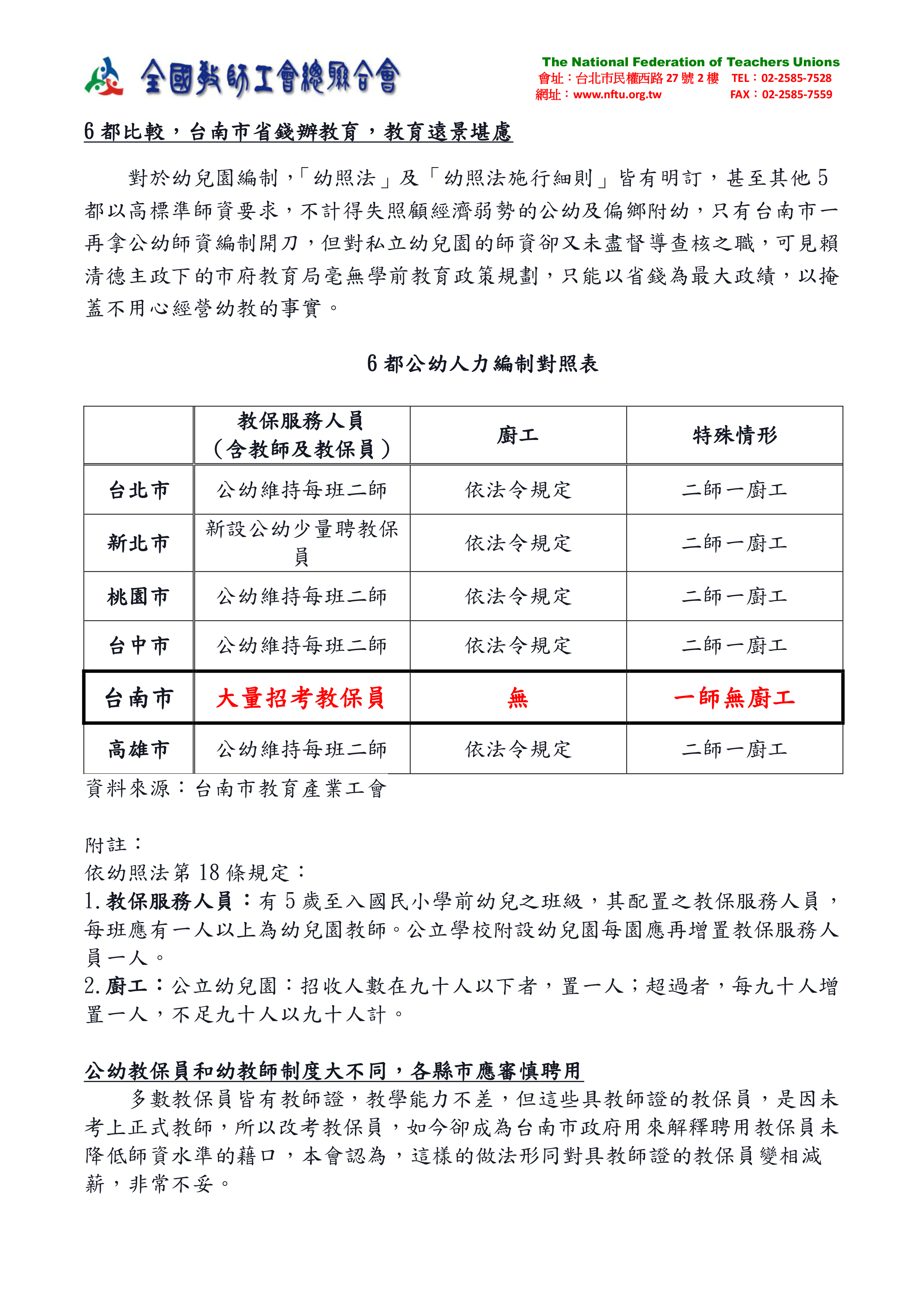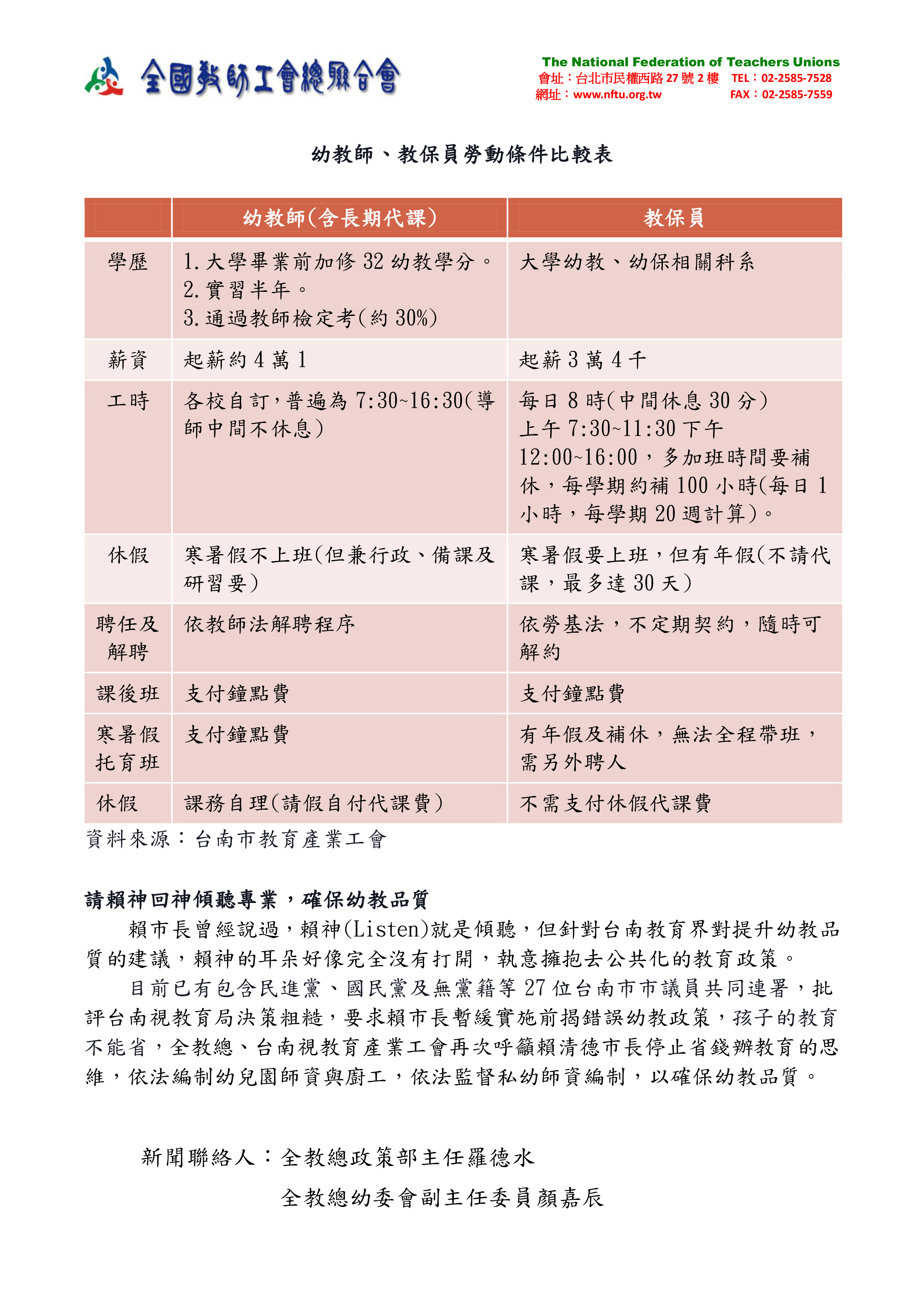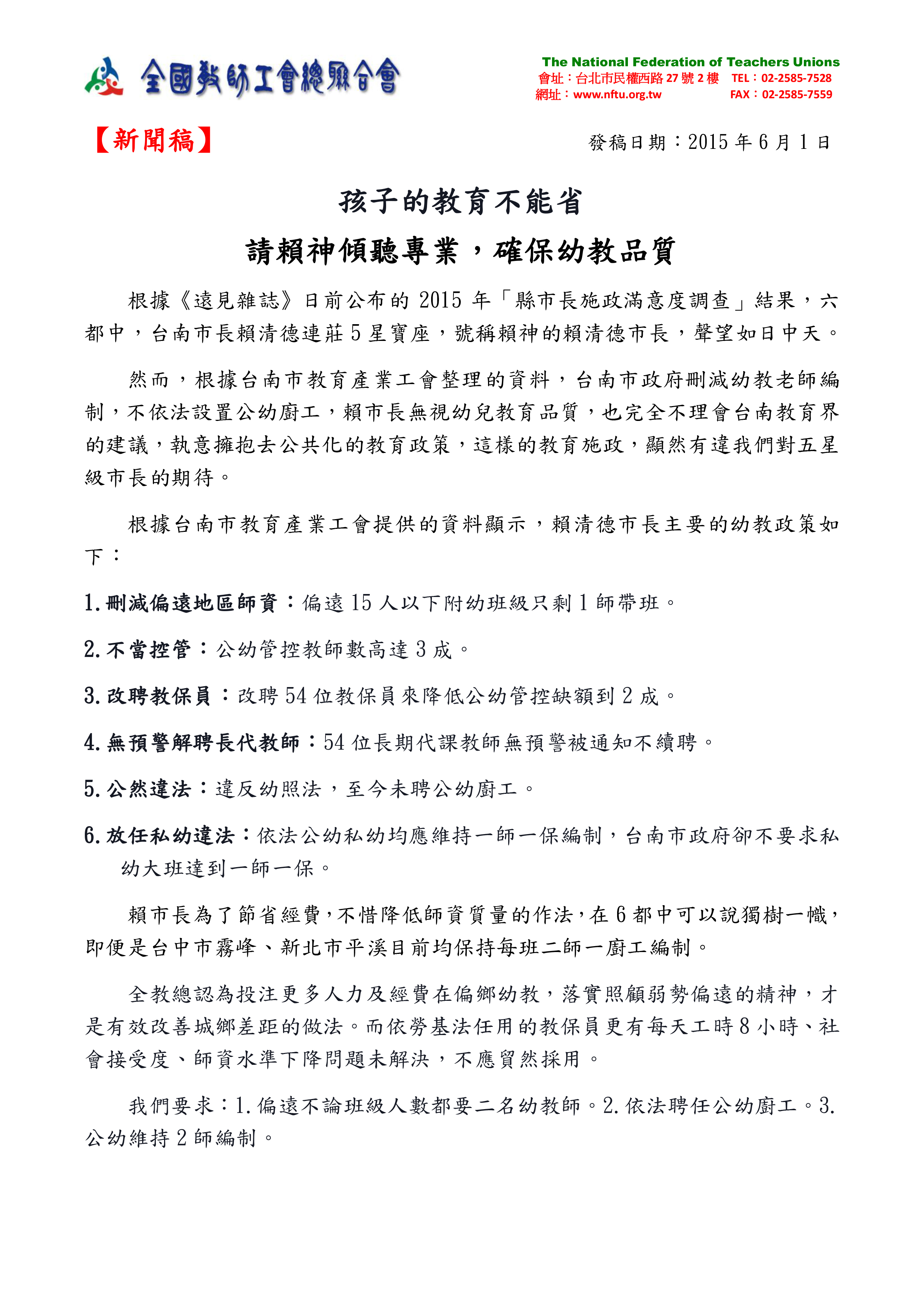 全國教師工會總聯合會(簡稱全教總)於2015年6月1日召開「請賴神傾聽專業,確保幼教品質」記者會指出,根據《遠見雜誌》日前公布的2015年「縣市長施政滿意度調查」結果,六都中,台南市長賴清德連莊五星寶座。但根據台南市教育產業工會整理的資料,台南市政府刪減幼教老師編制,不依法設置公幼廚工,賴市長無視幼兒教育品質,也完全不理會台南教育界的建議,執意擁抱去公共化的教育政策,這樣的教育施政,顯然有違我們對五星級市長的期待。全教總根據台南市教育產業工會提供的資料顯示,提出賴清德市長主要的六個幼教政策缺失。要求偏遠不論班級人數都要二名幼教師、依法聘任公幼廚工、公幼維持2師編制。另外,也並提出六都公幼人力編制對照表,認為台南市省錢辦教育,教育遠景堪慮,及公幼教保員和幼教師勞動條件比較表,請各縣市應審慎聘用。最後請賴神回神傾聽專業,確保幼教品質,並提醒已有民進黨、國民黨及無黨籍等27位台南市市議員共同連署,批評台南市教育局決策粗糙,要求賴市長暫緩實施前揭錯誤的幼教政策。