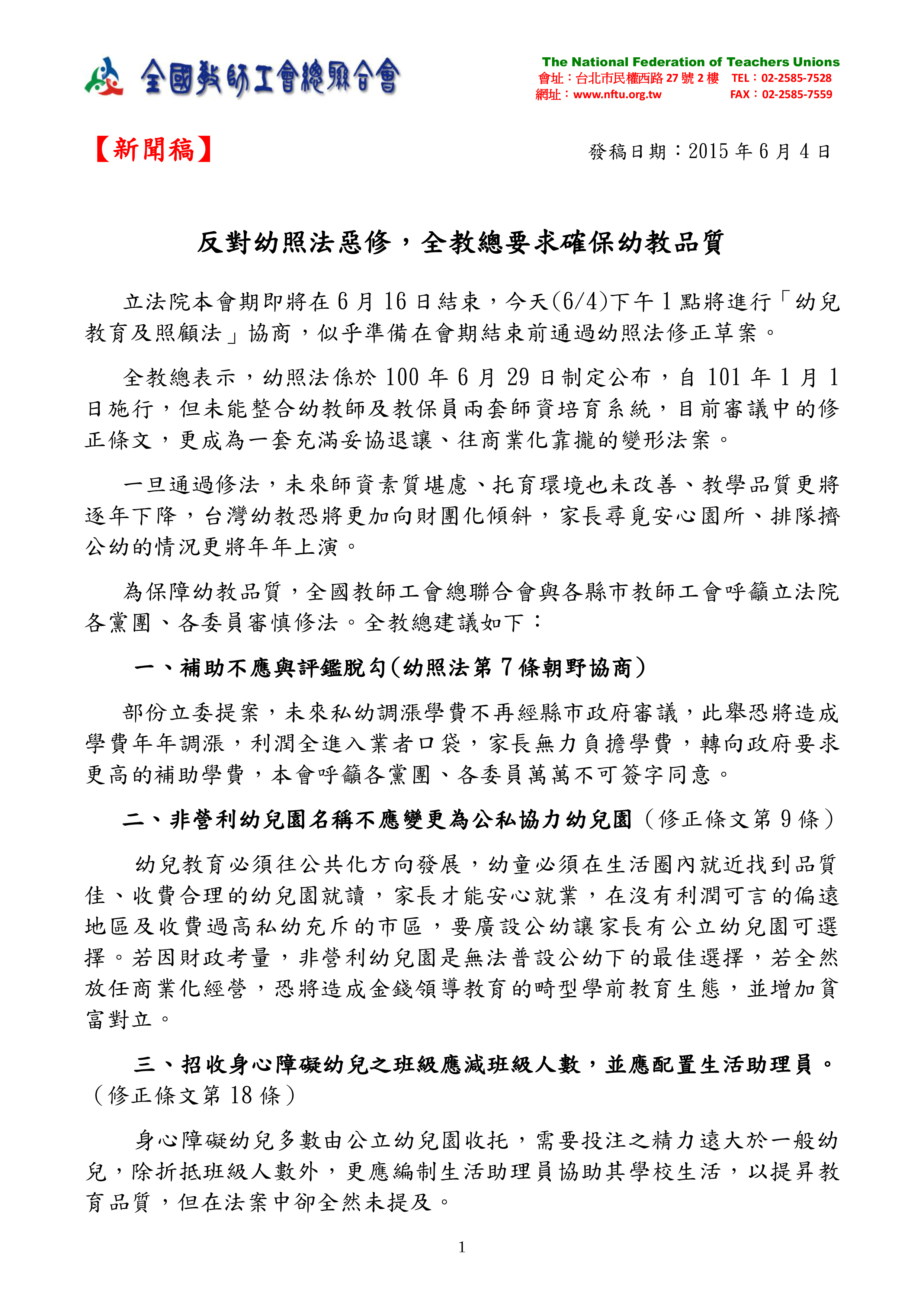 20150604【新聞稿】反對幼照法惡修,全教總要求確保幼教品質