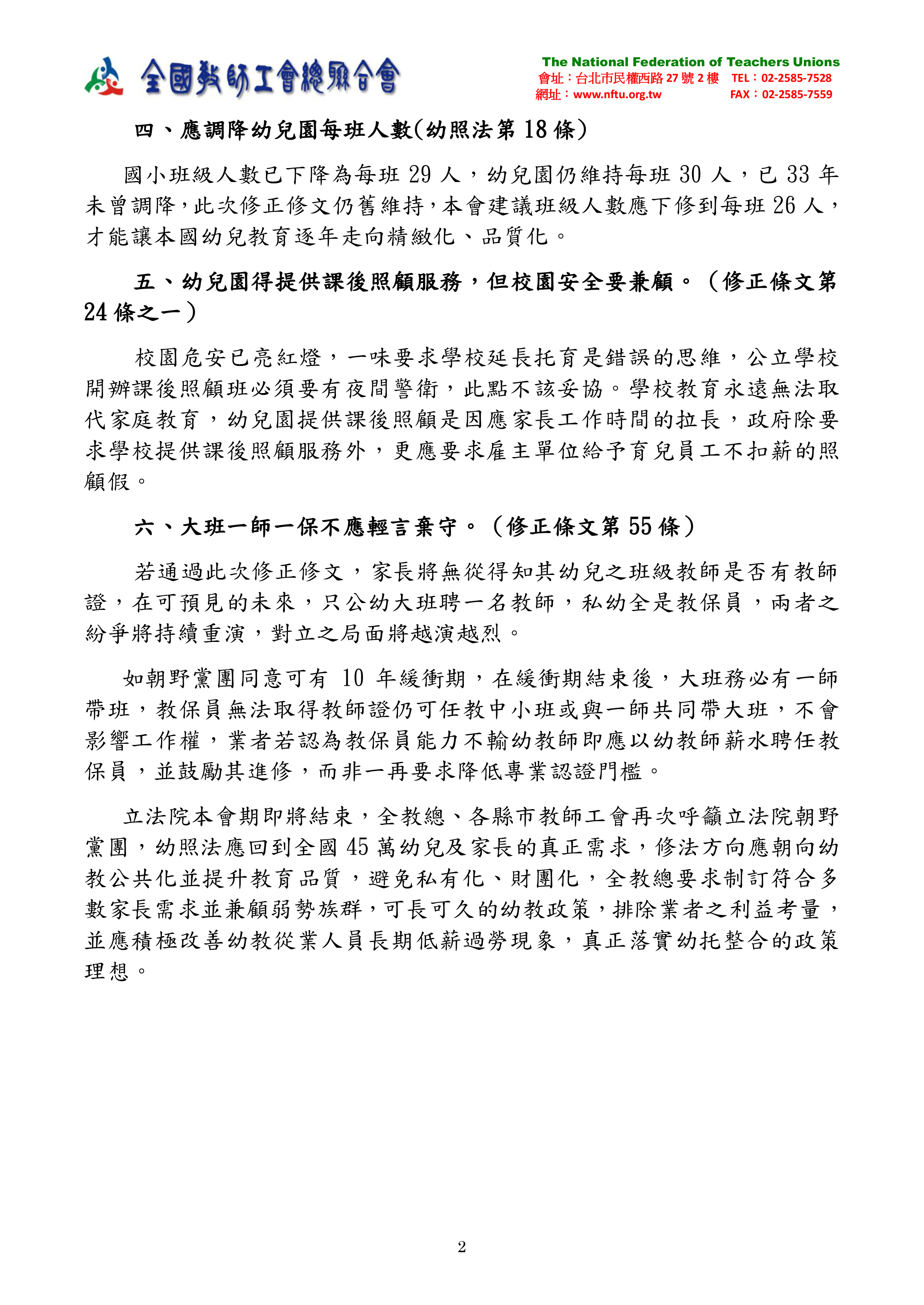 全國教師工會總聯合會(簡稱全教總)表示,幼照法係於2011年6月29日制定公布,自2012年1月1日施行,但未能整合幼教師及教保員兩套師資培育系統,目前審議中的修正條文,更成為一套充滿妥協退讓,往商業化靠攏的變形法案。一旦通過修法,未來師資素質堪慮,托育環境也未改善,教學品質更將逐年下降,台灣幼教恐將更加向財團化傾斜,家長尋覓安心園所,排隊擠公幼的情況更將年年上演。為保障幼教品質,全教總與各縣市教師工會呼籲立法院各黨團委員審慎修法。對修正條文提出如下六點建議:各補助不應與評鑑脫勾(幼照法第7條朝野協商)、非營利幼兒園名稱不應變更為公私協力幼兒園(修正條文第9條)、招收身心障礙幼兒之班級應減班級人數,並應配置生活助理員(修正條文第18條)、應調降幼兒園每班人數(幼照法第18條)、幼兒園得提供課後照顧服務,但校園安全要兼顧(修正條文第24條之一)、大班一師一保不應輕言棄守(修正條文第55條)。
