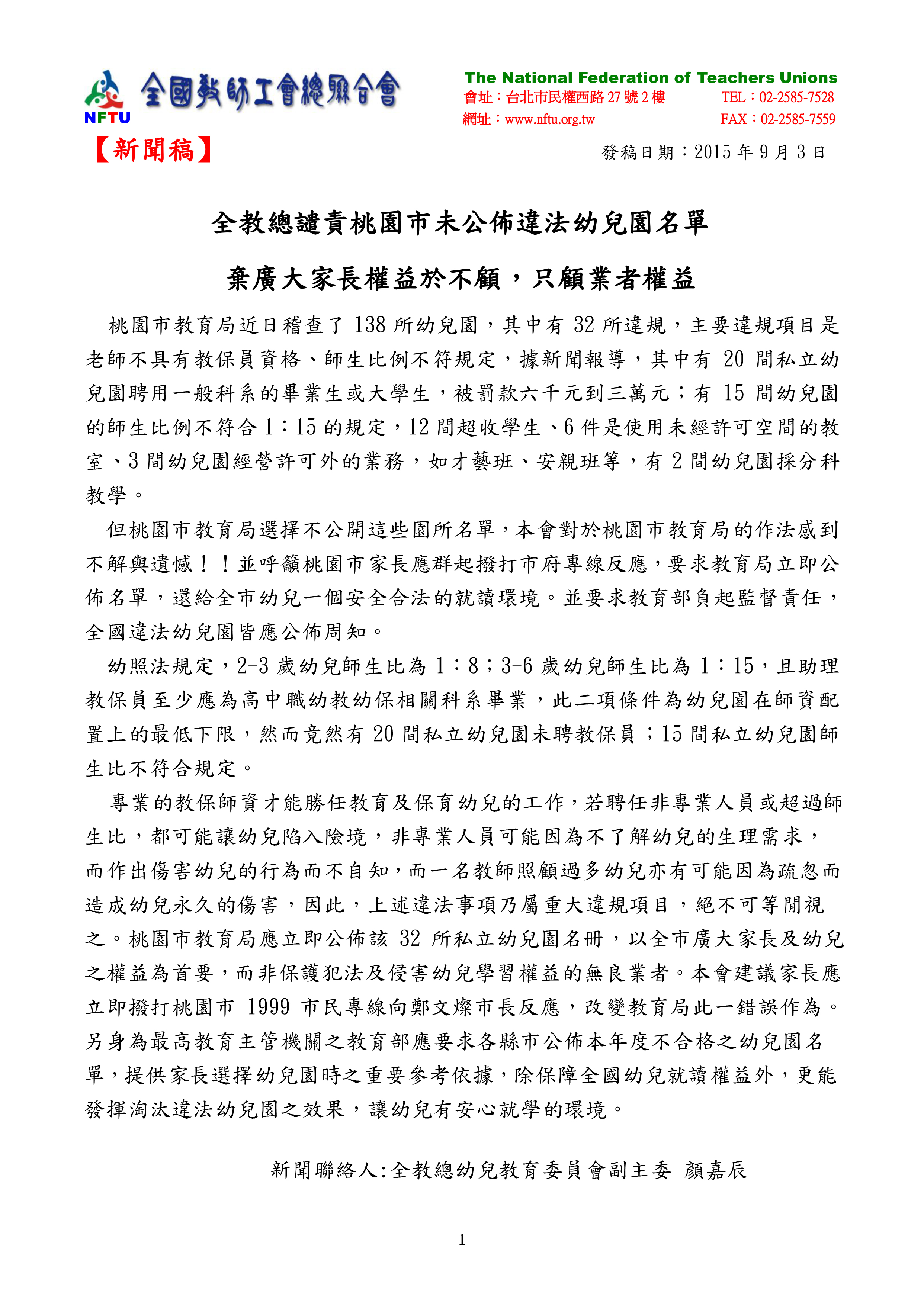 20150903【新聞稿】全教總譴責桃園市未公佈違法幼兒園名單 棄廣大家長權益於不顧,只顧業者權益