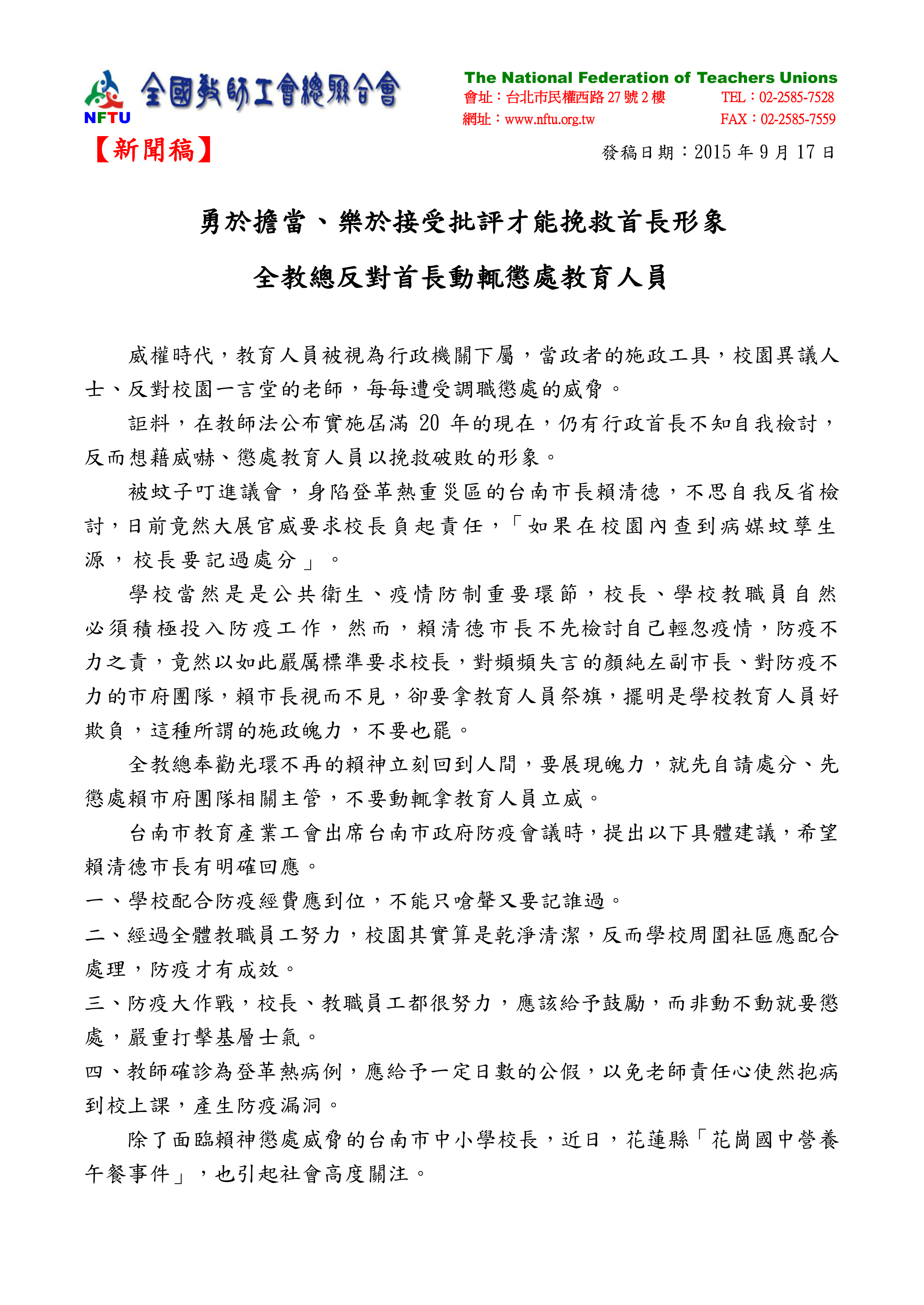 20150917【新聞稿】勇於擔當、樂於接受批評才能挽救首長形象 全教總反對首長動輒懲處教育人員