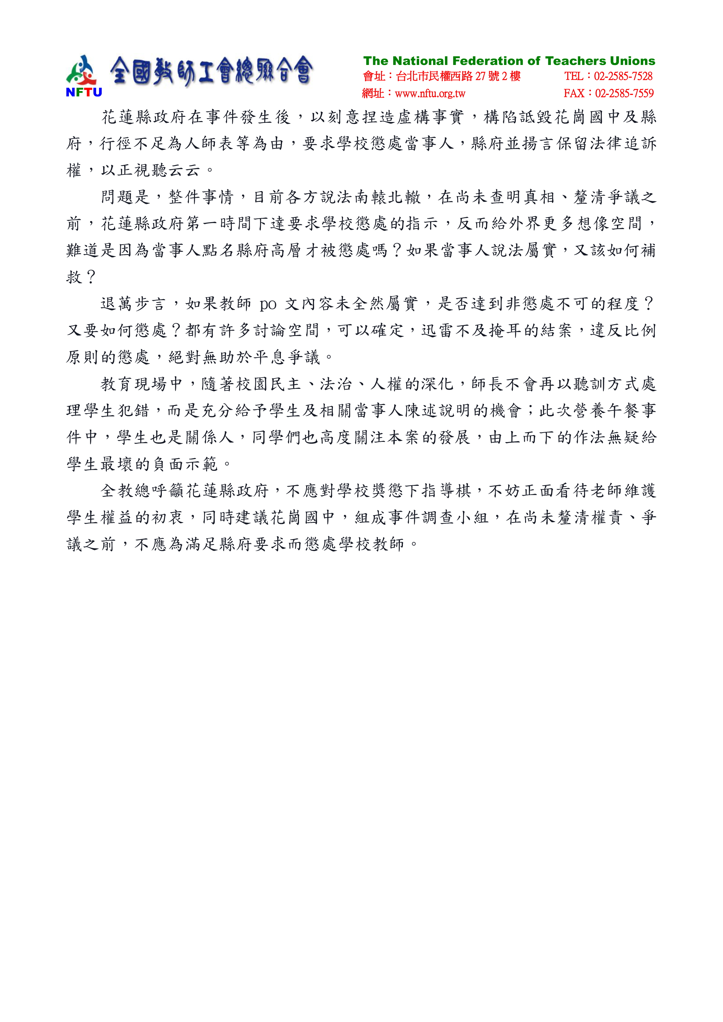 全國教師工會總聯合會(簡稱全教總)指出,身陷登革熱重災區的台南市長賴清德,不思自我反省檢討,竟然大展官威要求校長負起責任,「如果在校園內查到病媒蚊孳生源,校長要記過處分」。台南市教育產業工會出席台南市政府防疫會議時,提出四項具體建議,希望賴清德市長有明確回應。花蓮縣「花崗國中營養午餐事件」,也引起社會高度關注,在尚未查明真相、釐清爭議之前,花蓮縣政府第一時間下達要求學校懲處的指示,反而給外界更多想像空間。就算教師貼文內容未全然屬實,是否達到非懲處不可的程度?要如何懲處?都有許多討論空間,迅雷不及掩耳的結案,違反比例原則的懲處,絕對無助於平息爭議。全教總認為,教育現場中,隨著校園民主、法治、人權的深化,師長不會再以聽訓方式處理學生犯錯,而是充分給予學生及相關當事人陳述說明的機會。此次營養午餐事件中,學生也是關係人,同學們也高度關注本案的發展,由上而下的作法無疑給學生最壞的負面示範。因此全教總呼籲花蓮縣政府,不應對學校獎懲下指導棋,不妨正面看待老師維護學生權益的初衷,同時建議花崗國中,組成事件調查小組,在尚未釐清權責、爭議之前,不應為滿足縣府要求而懲處學校教師。