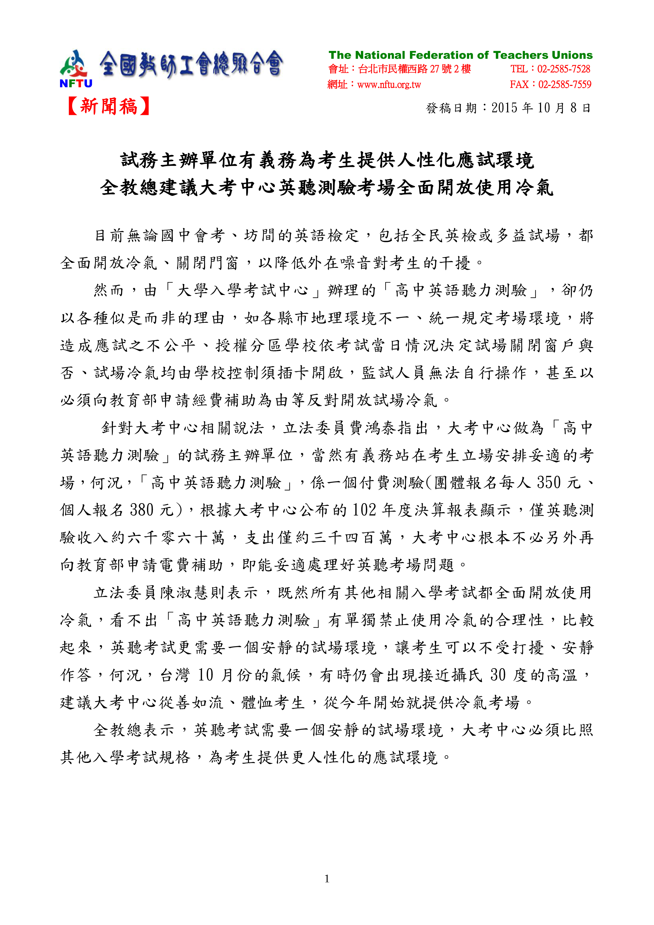 20151008【新聞稿】全教總建議大考中心英聽測驗考場全面開放使用冷氣