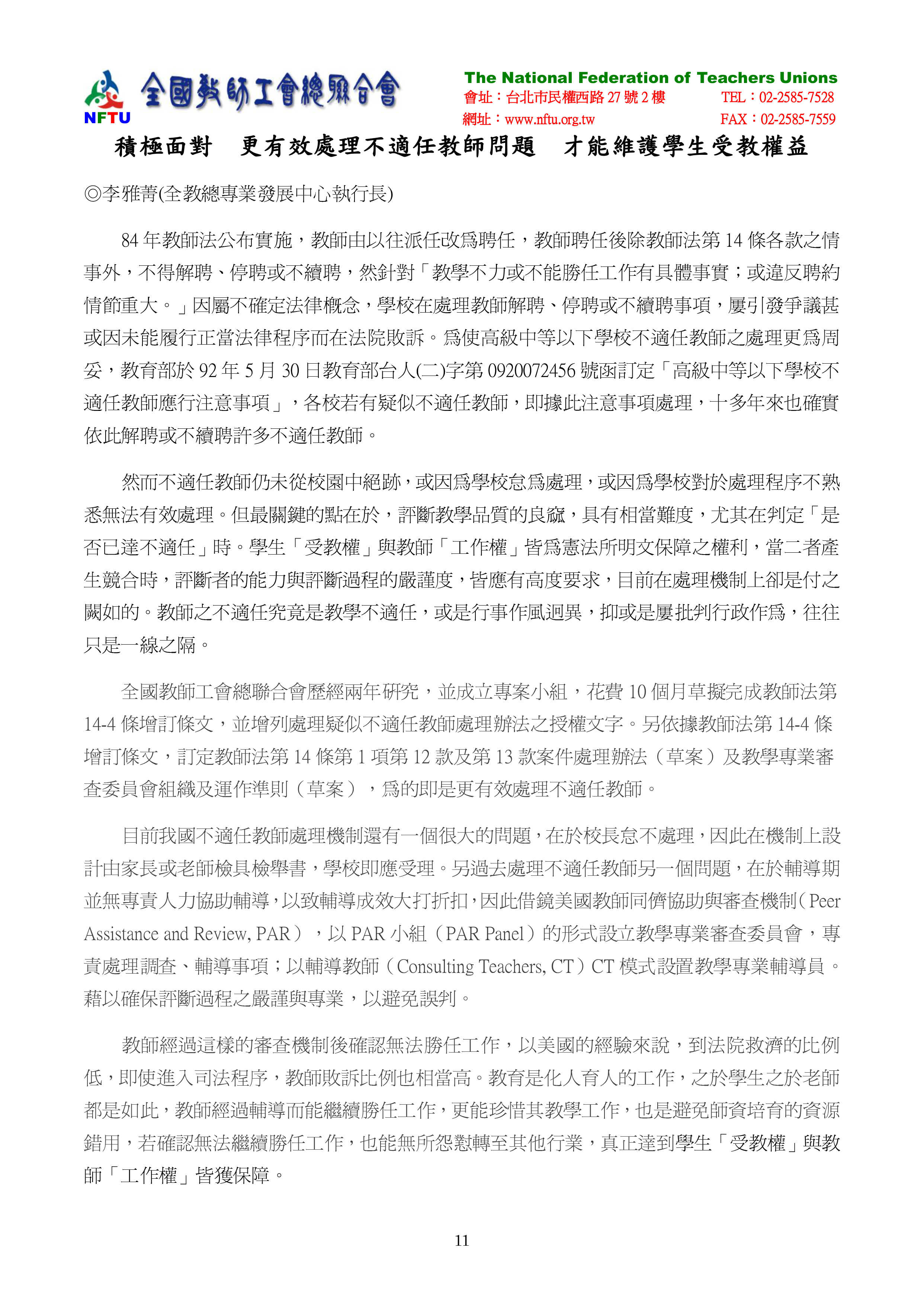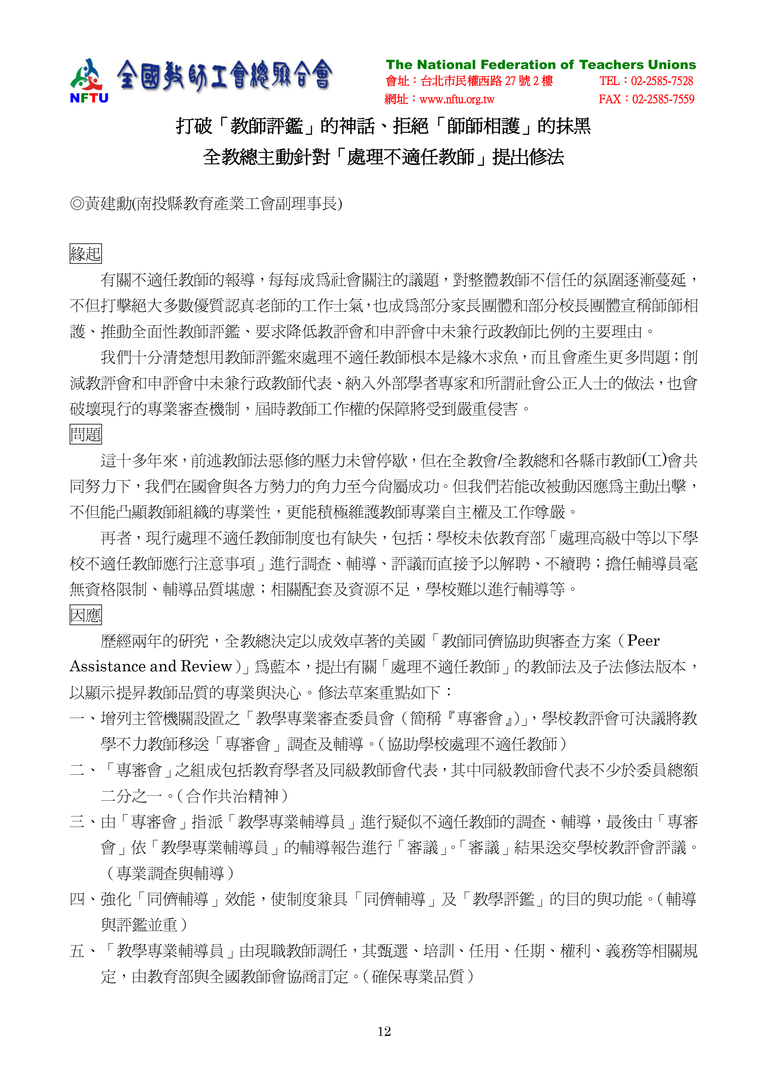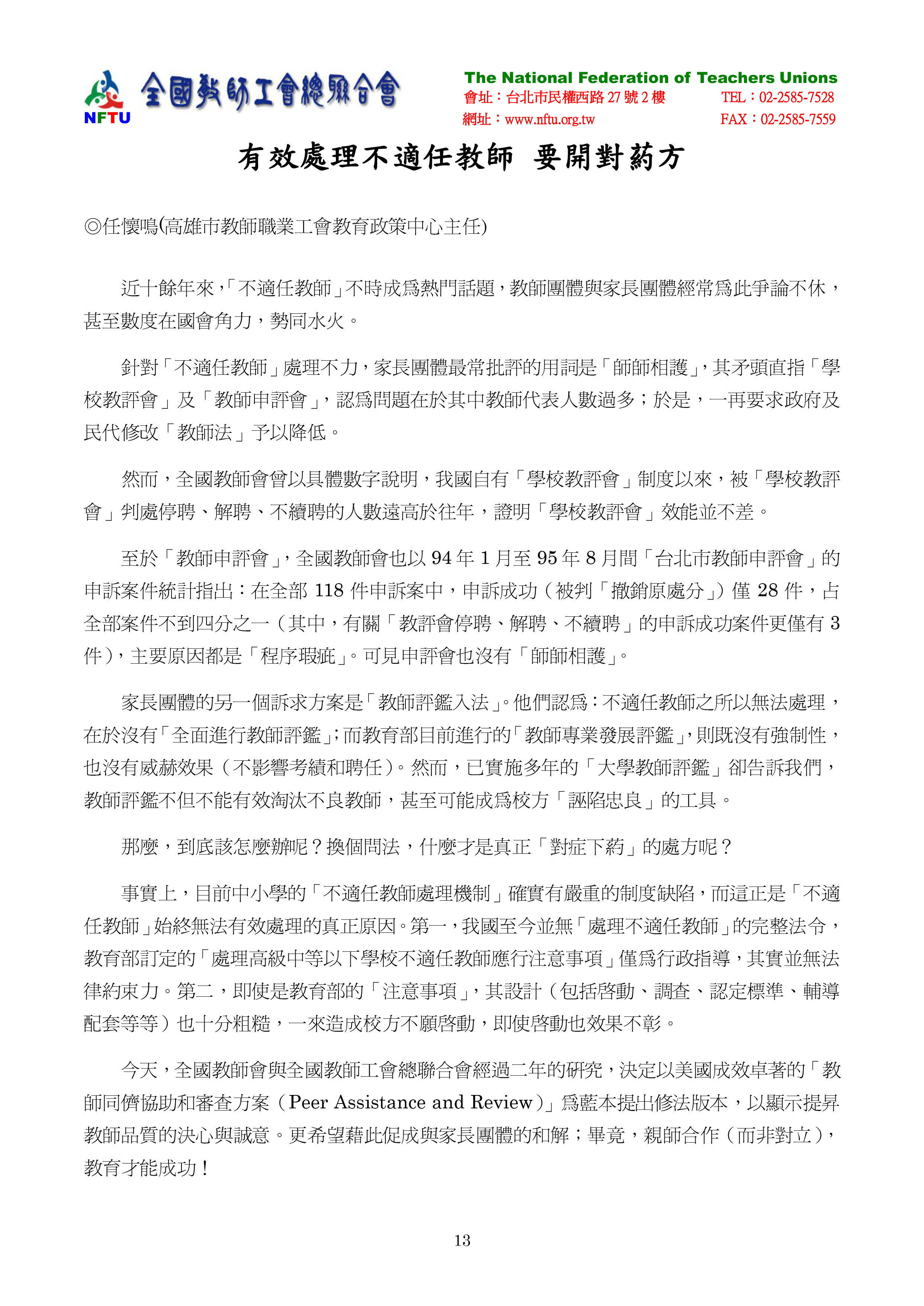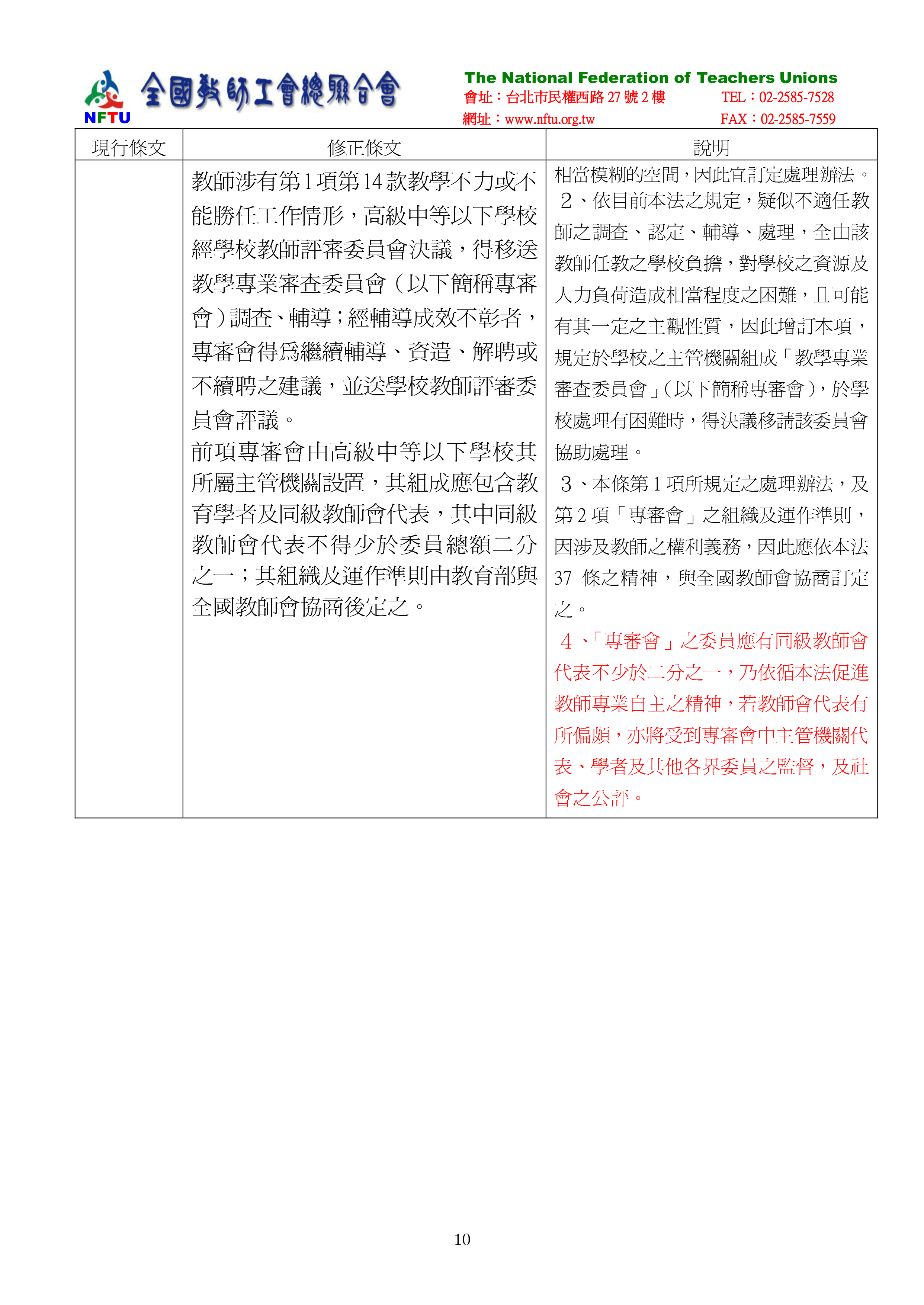 有關不適任教師的處理,家長團體最常批評的用詞是「師師相護」,教育部擬修正教師法,準備引進外部人員進入學校教評會。全國教師工會總聯合會(簡稱全教總)指出,台灣自有「學校教評會」制度以來,被「學校教評會」判處停聘、解聘、不續聘的人數遠高於教評會制度建立前,證明「學校教評會」效能並不差,各級教師申評會的數據也顯示兩會並沒有「師師相護」。全教總認為,想用教師評鑑來處理不適任教師根本是緣木求魚,會產生更多問題;削減教評會和申評會中未兼行政教師代表、納入外部學者專家和所謂社會公正人士的做法,也會破壞現行的專業審查機制,屆時教師工作權的保障將受到嚴重侵害。全教總為能更積極、有效率的處理不適任教師,除辦理相關研習課程,也經過二年的研究,決定以美國成效卓著的「教師同儕協助和審查方案(Peer Assistance and Review)」為藍本提出修法版本,宣示教師組織提昇教師素質的決心。提出增列主管機關設置「教學專業審查委員會(簡稱『專審會』)」,並對專審會組成、運作等機制說明,也提出需增訂教師法第14-4條、「教師法第14條第1項第12款及第13款案件處理辦法」、訂定教學專業審查委員會組織及運作準則的版本,及建議修法的期程與預期效益。