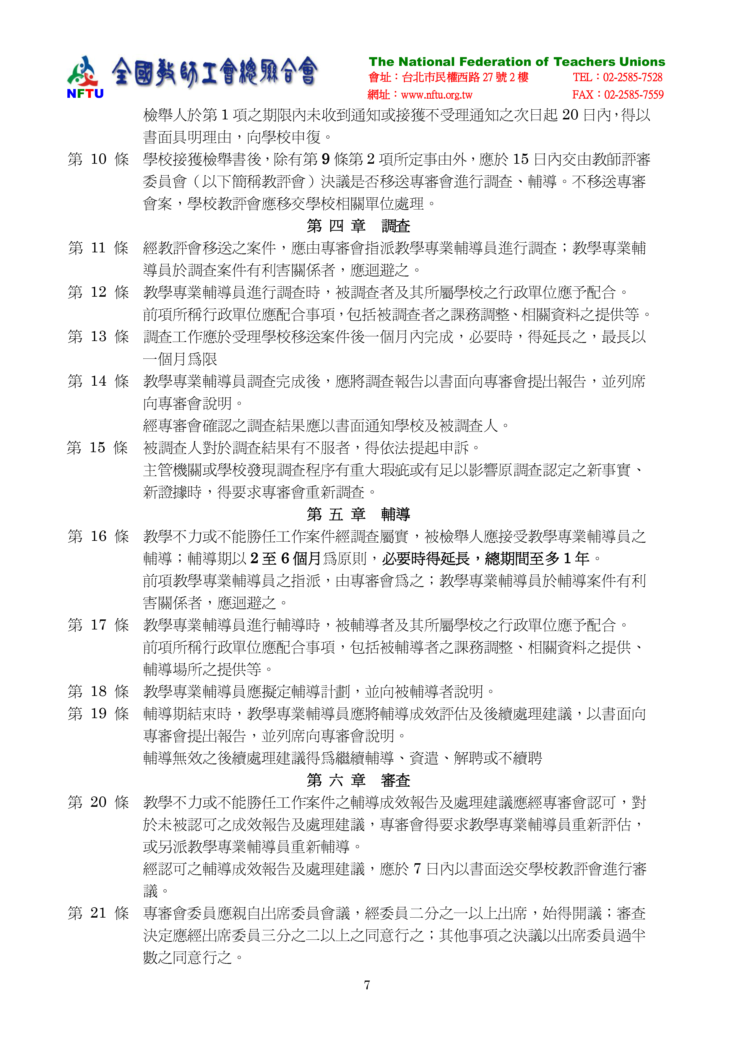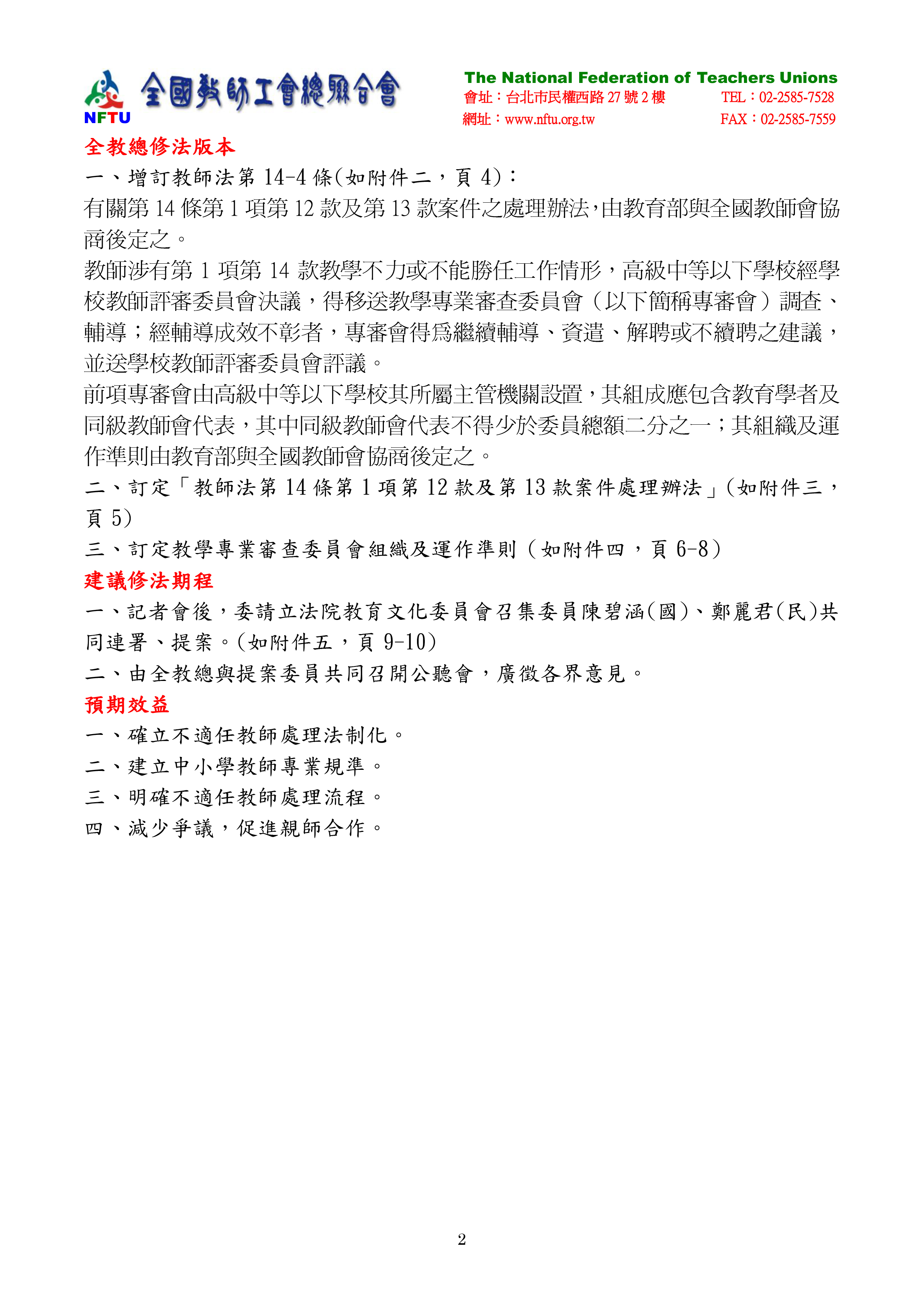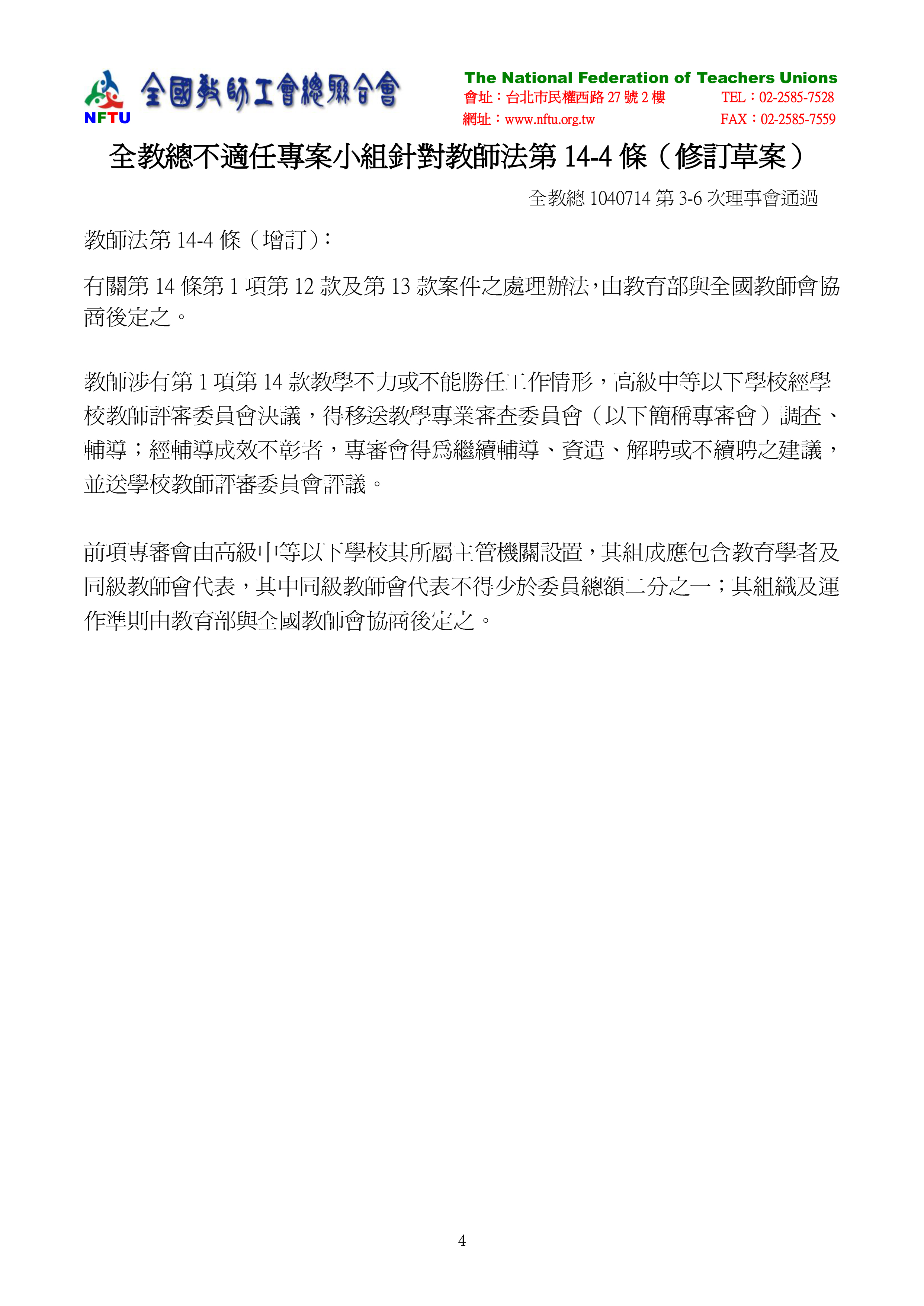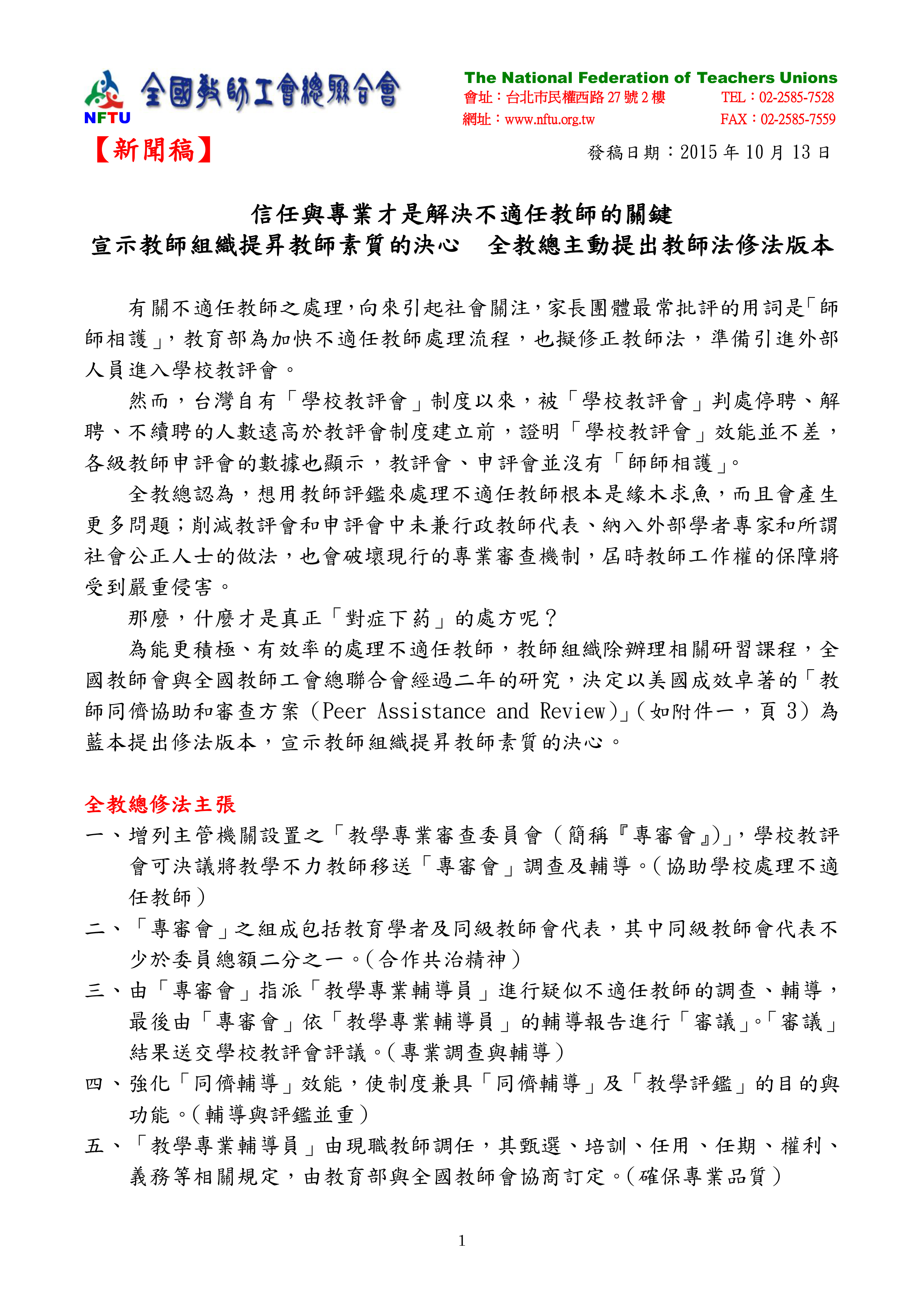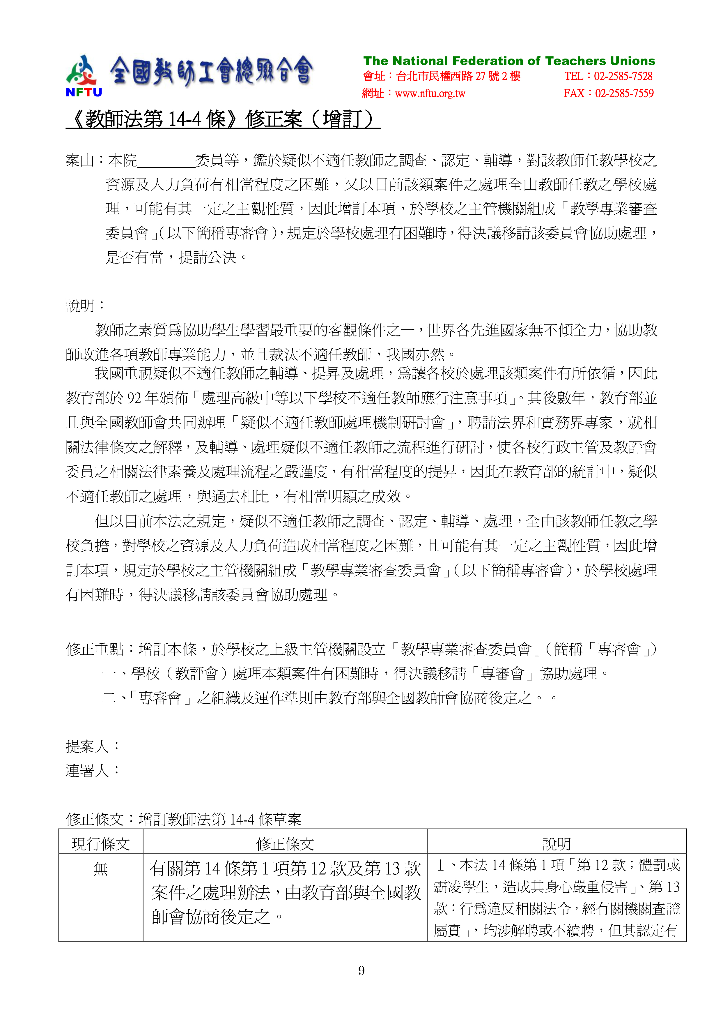 有關不適任教師的處理,家長團體最常批評的用詞是「師師相護」,教育部擬修正教師法,準備引進外部人員進入學校教評會。全國教師工會總聯合會(簡稱全教總)指出,台灣自有「學校教評會」制度以來,被「學校教評會」判處停聘、解聘、不續聘的人數遠高於教評會制度建立前,證明「學校教評會」效能並不差,各級教師申評會的數據也顯示兩會並沒有「師師相護」。全教總認為,想用教師評鑑來處理不適任教師根本是緣木求魚,會產生更多問題;削減教評會和申評會中未兼行政教師代表、納入外部學者專家和所謂社會公正人士的做法,也會破壞現行的專業審查機制,屆時教師工作權的保障將受到嚴重侵害。全教總為能更積極、有效率的處理不適任教師,除辦理相關研習課程,也經過二年的研究,決定以美國成效卓著的「教師同儕協助和審查方案(Peer Assistance and Review)」為藍本提出修法版本,宣示教師組織提昇教師素質的決心。提出增列主管機關設置「教學專業審查委員會(簡稱『專審會』)」,並對專審會組成、運作等機制說明,也提出需增訂教師法第14-4條、「教師法第14條第1項第12款及第13款案件處理辦法」、訂定教學專業審查委員會組織及運作準則的版本,及建議修法的期程與預期效益。
