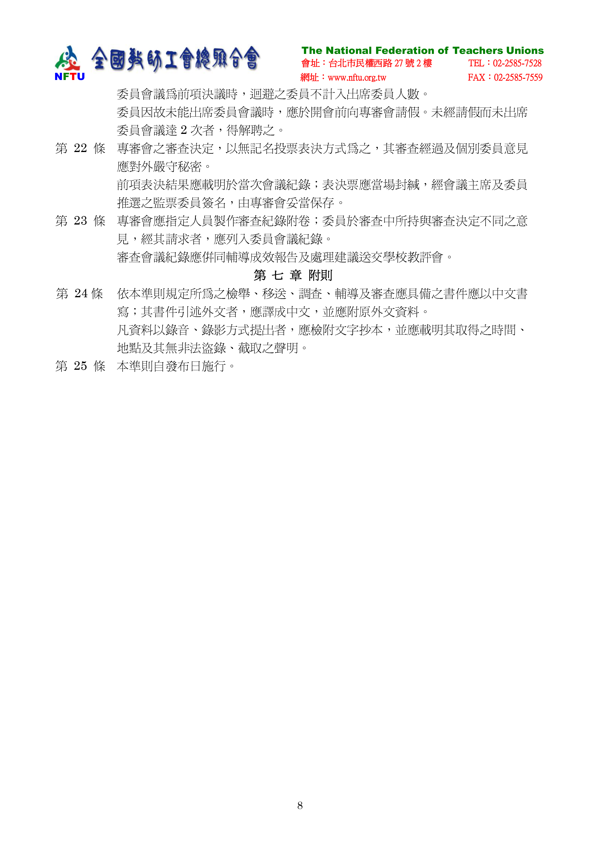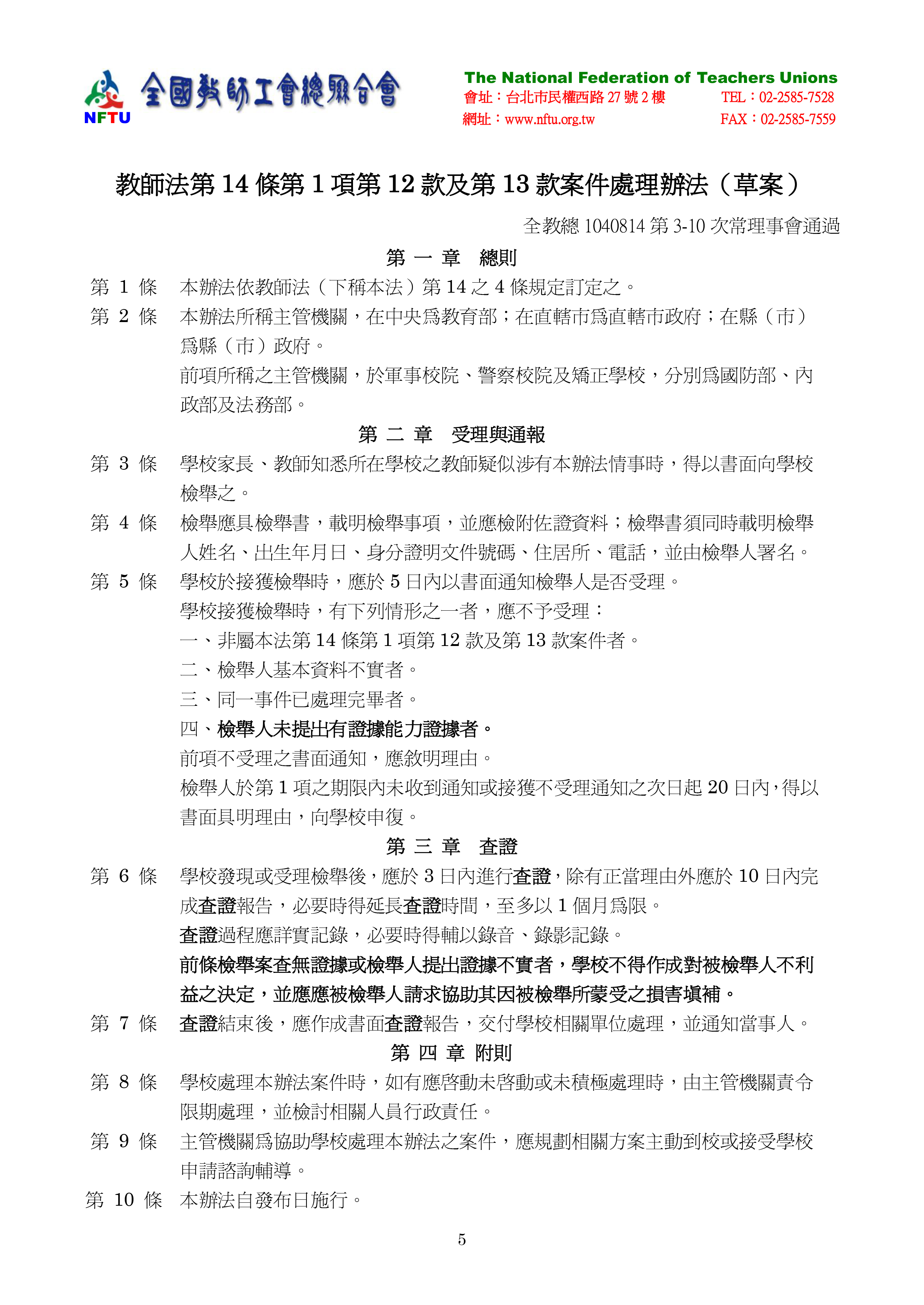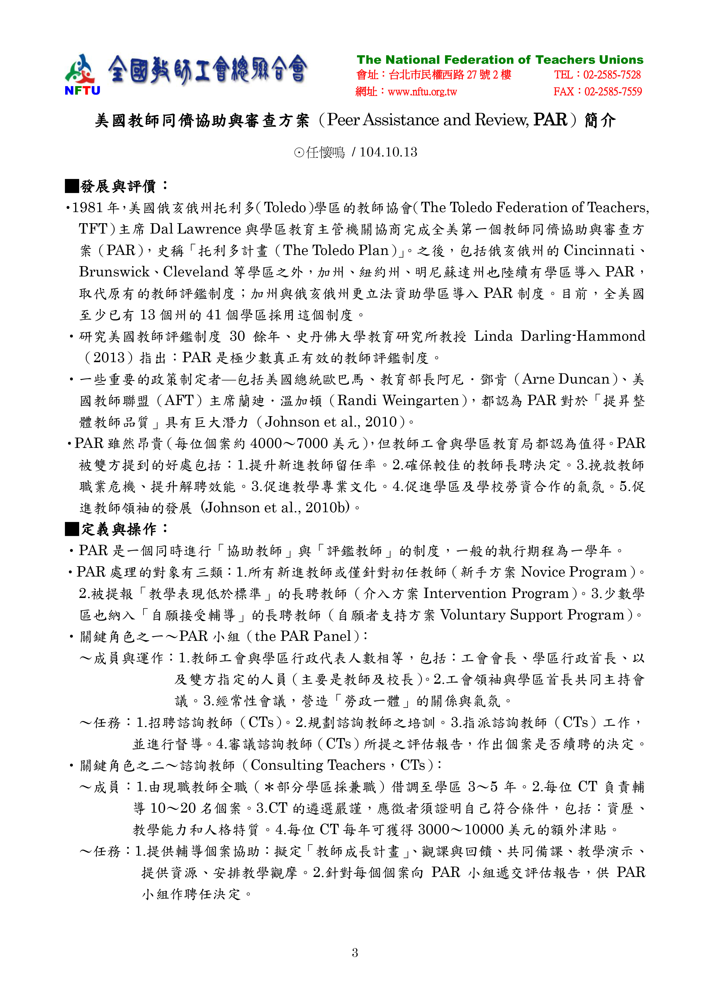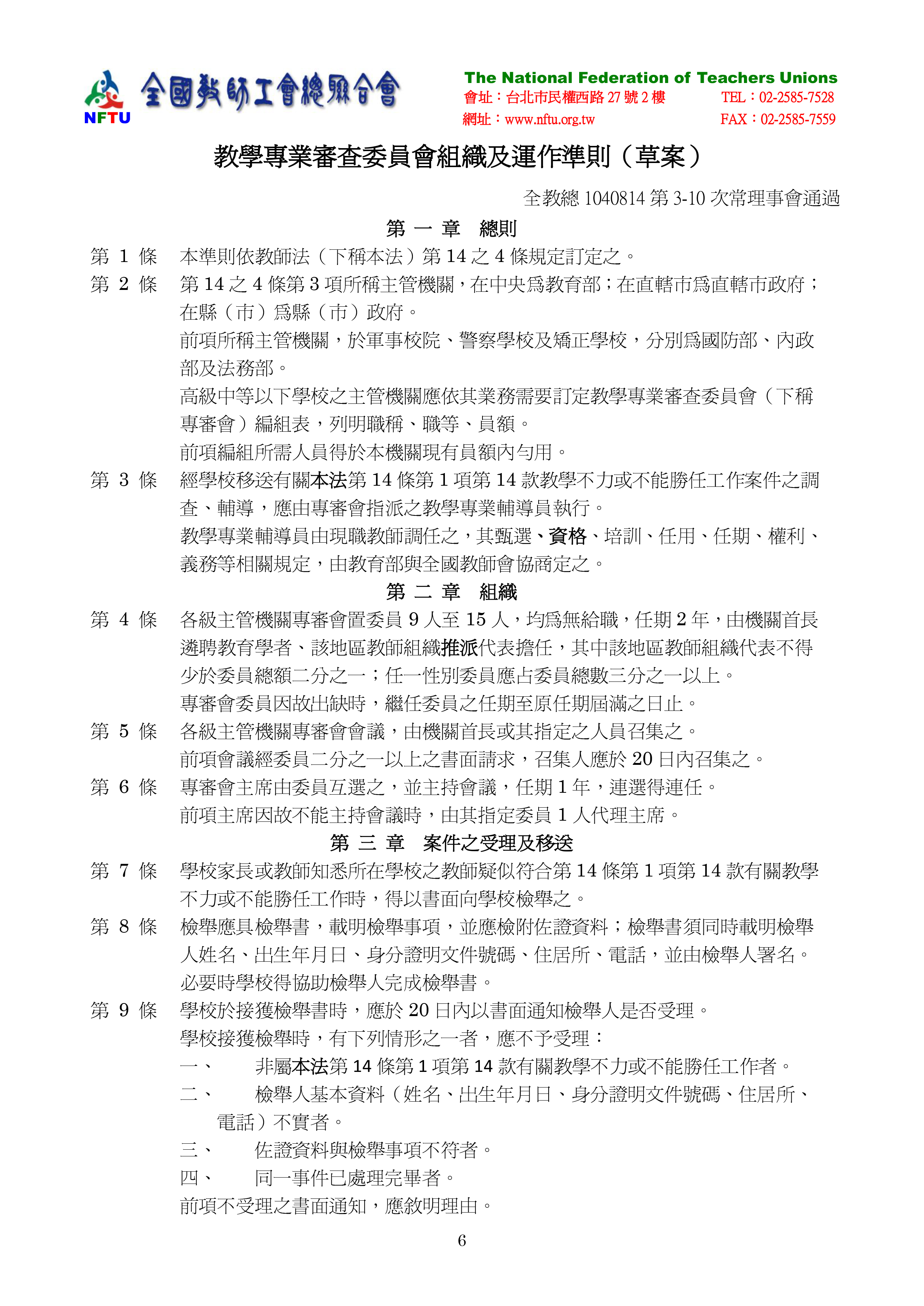 有關不適任教師的處理,家長團體最常批評的用詞是「師師相護」,教育部擬修正教師法,準備引進外部人員進入學校教評會。全國教師工會總聯合會(簡稱全教總)指出,台灣自有「學校教評會」制度以來,被「學校教評會」判處停聘、解聘、不續聘的人數遠高於教評會制度建立前,證明「學校教評會」效能並不差,各級教師申評會的數據也顯示兩會並沒有「師師相護」。全教總認為,想用教師評鑑來處理不適任教師根本是緣木求魚,會產生更多問題;削減教評會和申評會中未兼行政教師代表、納入外部學者專家和所謂社會公正人士的做法,也會破壞現行的專業審查機制,屆時教師工作權的保障將受到嚴重侵害。全教總為能更積極、有效率的處理不適任教師,除辦理相關研習課程,也經過二年的研究,決定以美國成效卓著的「教師同儕協助和審查方案(Peer Assistance and Review)」為藍本提出修法版本,宣示教師組織提昇教師素質的決心。提出增列主管機關設置「教學專業審查委員會(簡稱『專審會』)」,並對專審會組成、運作等機制說明,也提出需增訂教師法第14-4條、「教師法第14條第1項第12款及第13款案件處理辦法」、訂定教學專業審查委員會組織及運作準則的版本,及建議修法的期程與預期效益。