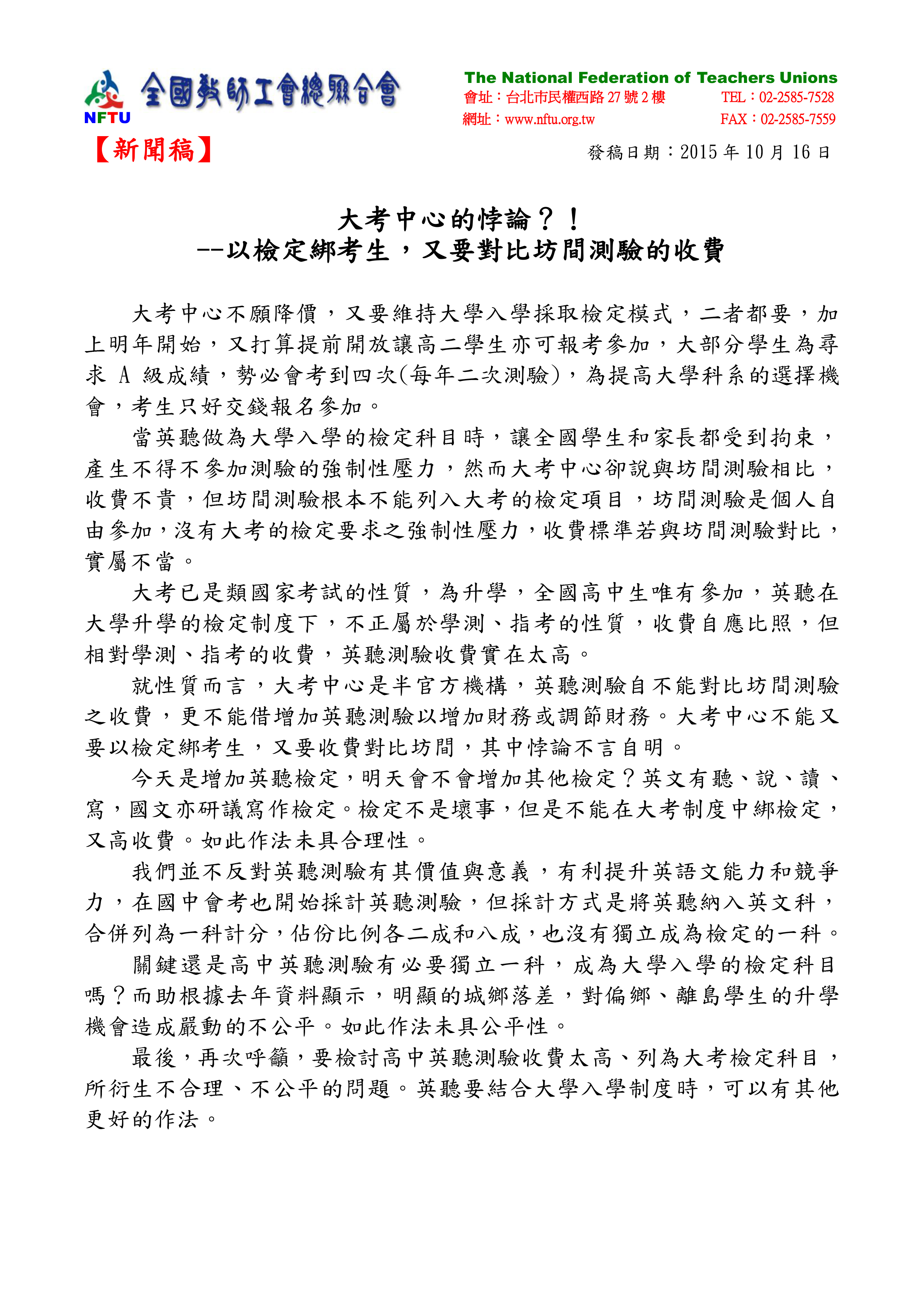 20151016【新聞稿】大考中心的悖論?!--以檢定綁考生,又要對比坊間測驗的收費