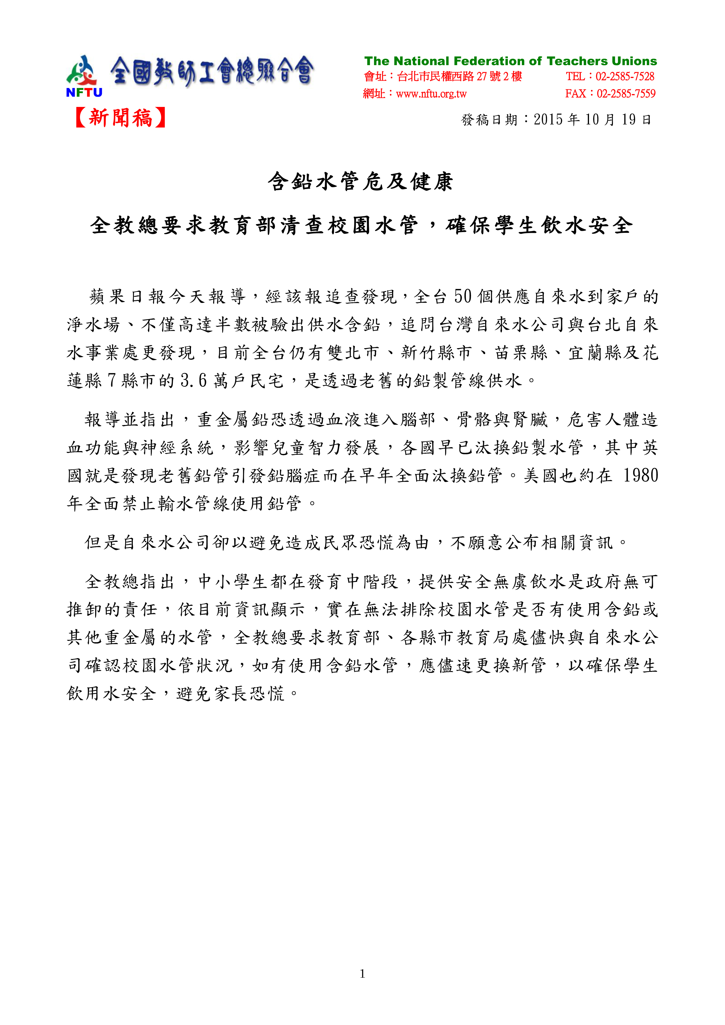 20151019【新聞稿】含鉛水管危及健康 全教總要求教育部清查校園水管,確保學生飲水安全