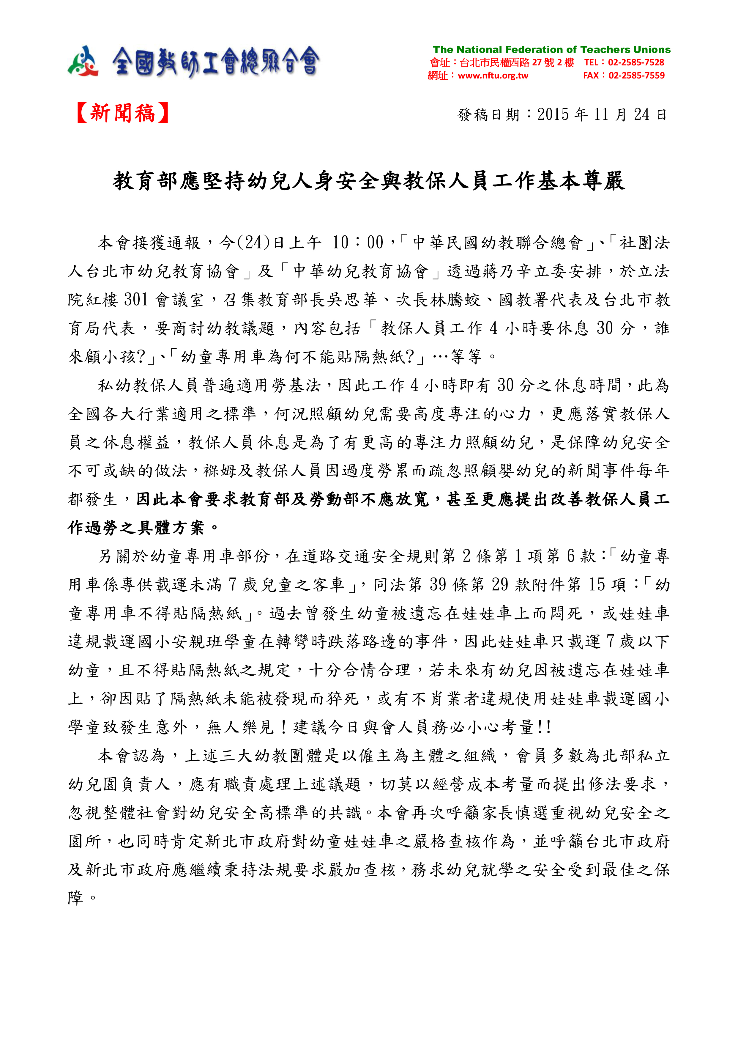 20151124【新聞稿】教育部應堅持幼兒 人身安全與教保人員工作基本尊嚴