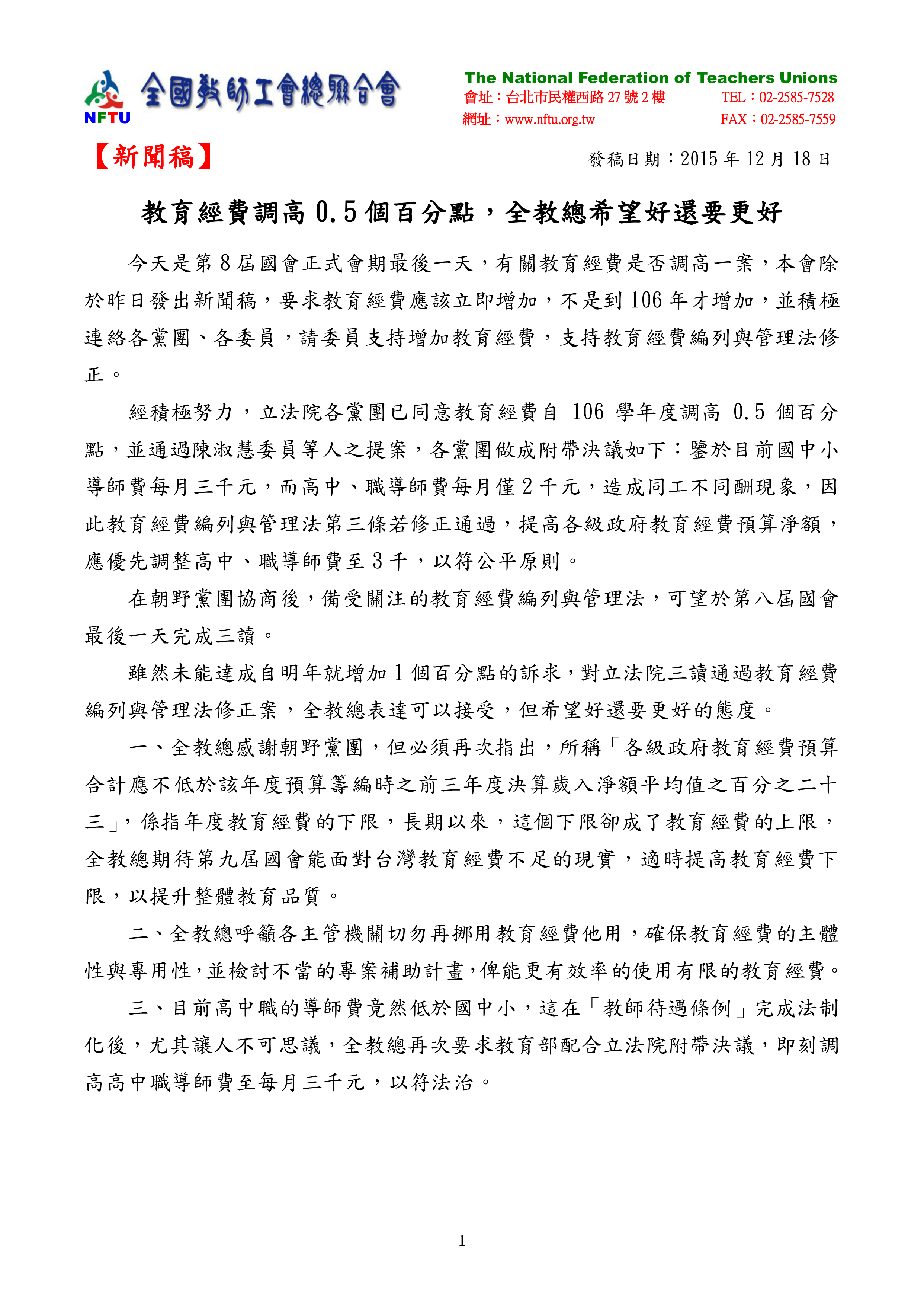 20151218【新聞稿】教育經費調高0_5個百分點,全教總希望好還要更好