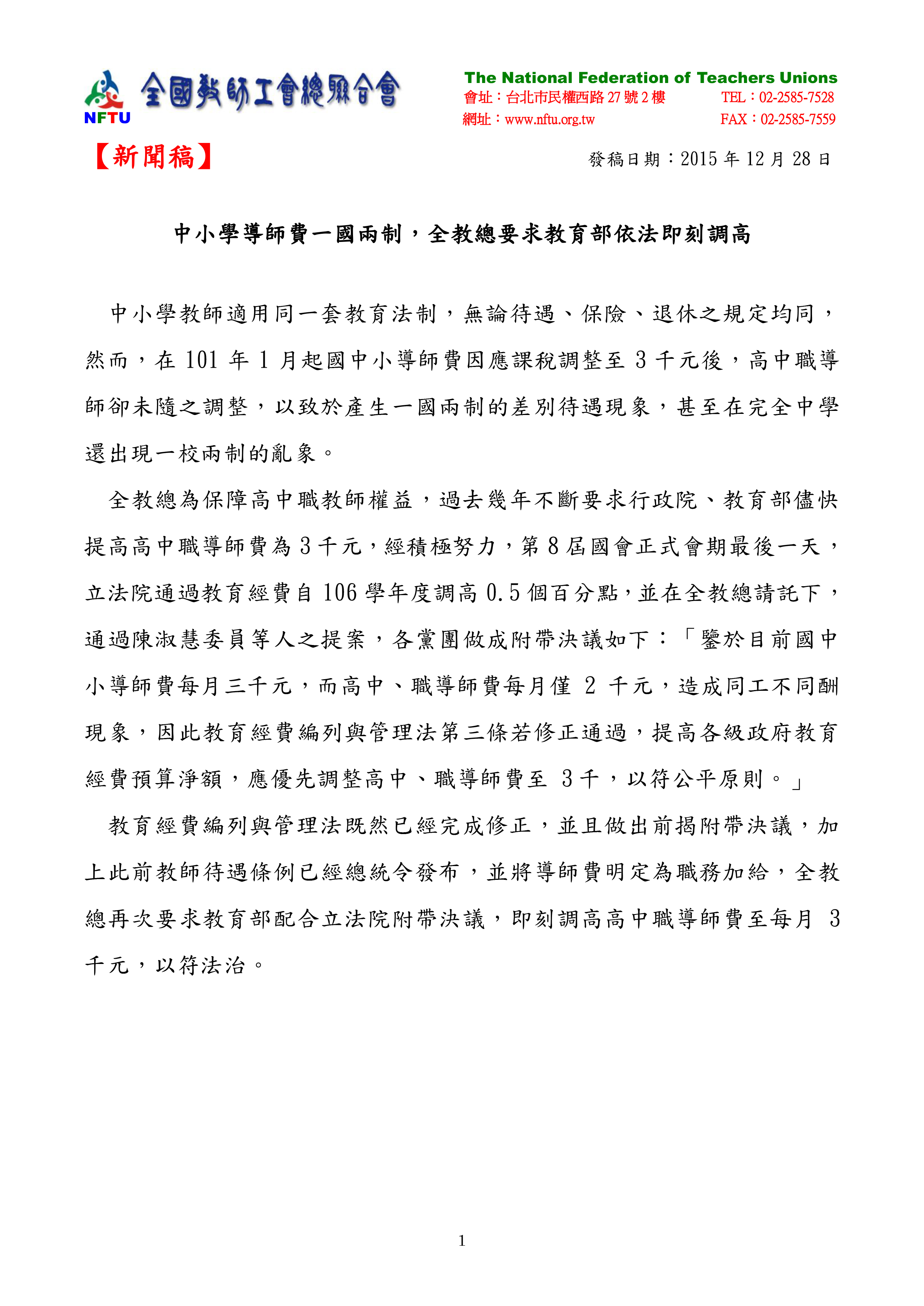 20151228【新聞稿】中小學導師費一國兩制,全教總要求教育部依法即刻調高