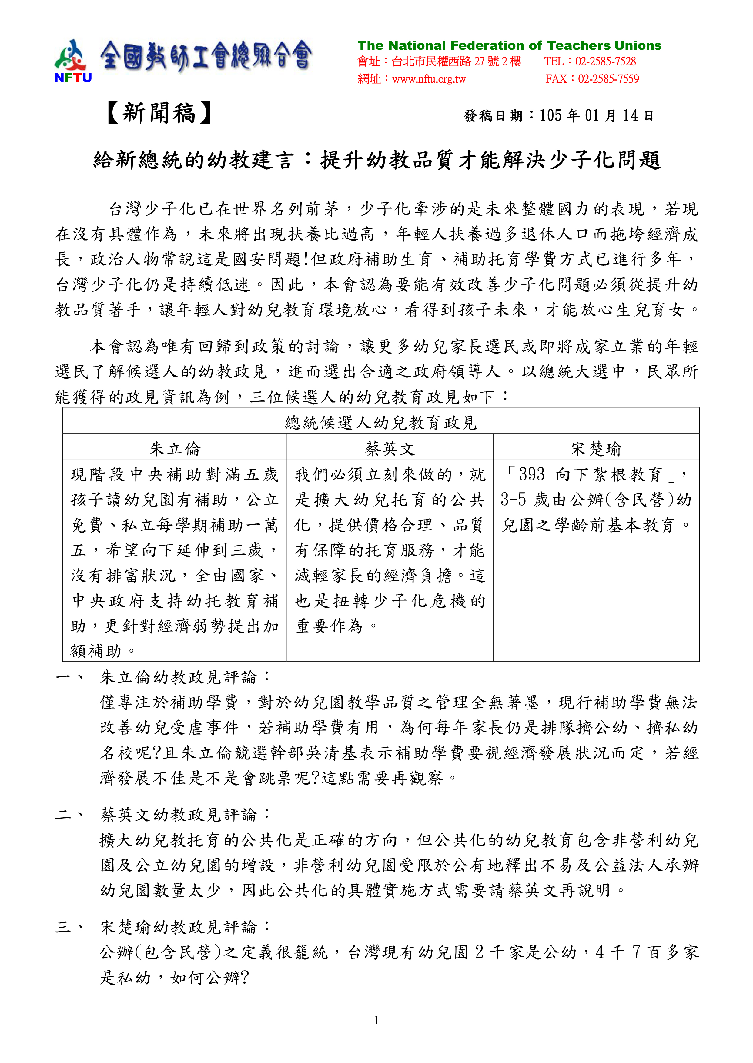台灣少子化已在世界名列前茅,全國教師工會總聯合會(簡稱全教總)認為要能讓生育率有效提升,需從幼教品質著手,讓年輕人對幼兒教育環境放心。全教總就總統大選中,摘要三位候選人的幼兒教育政見,認為改善幼兒教育環境才是少子化的解方,提出四項建言: