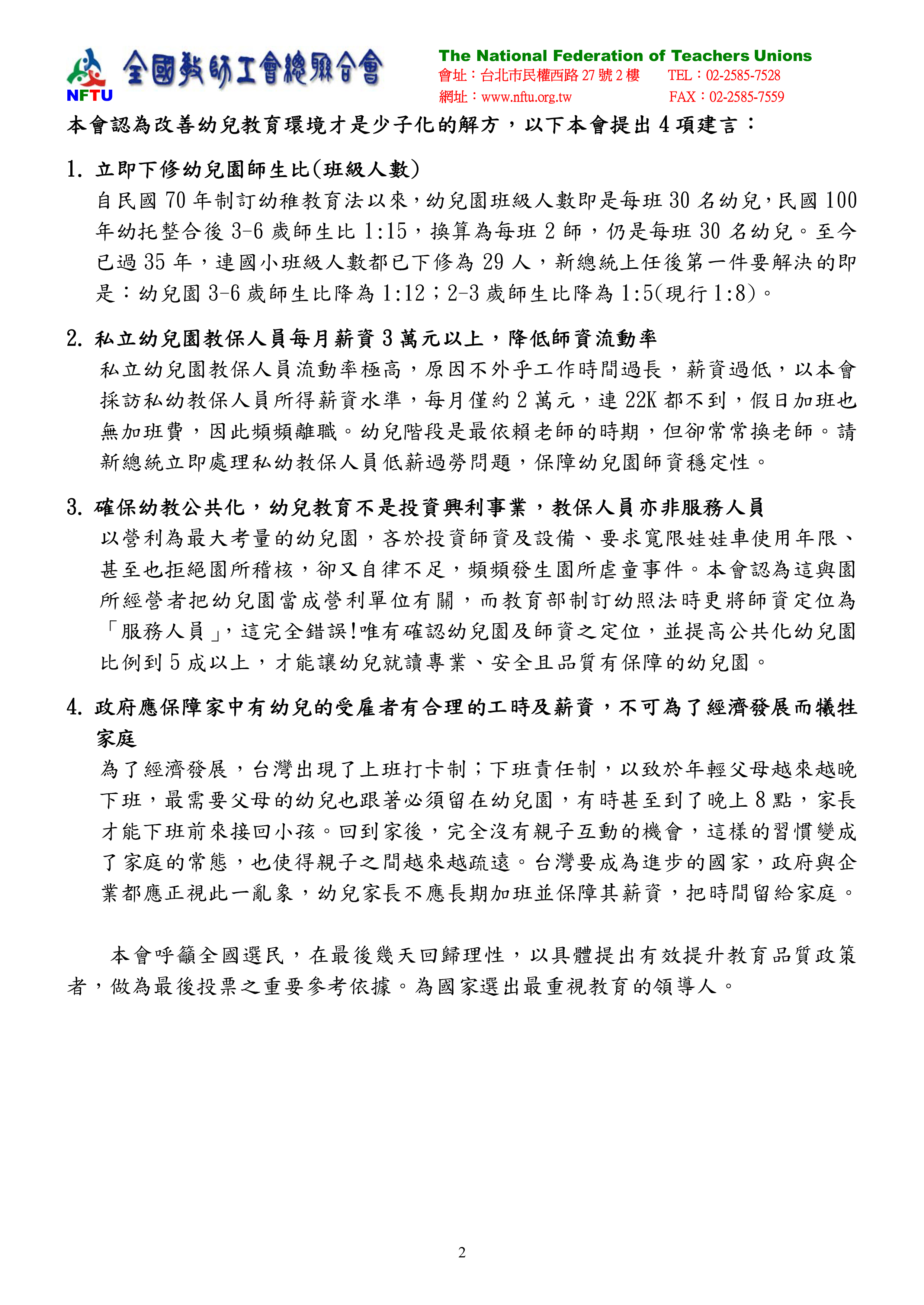 二、請總統立即處理私幼教保人員低薪過勞問題,保障幼兒園師資穩定性。