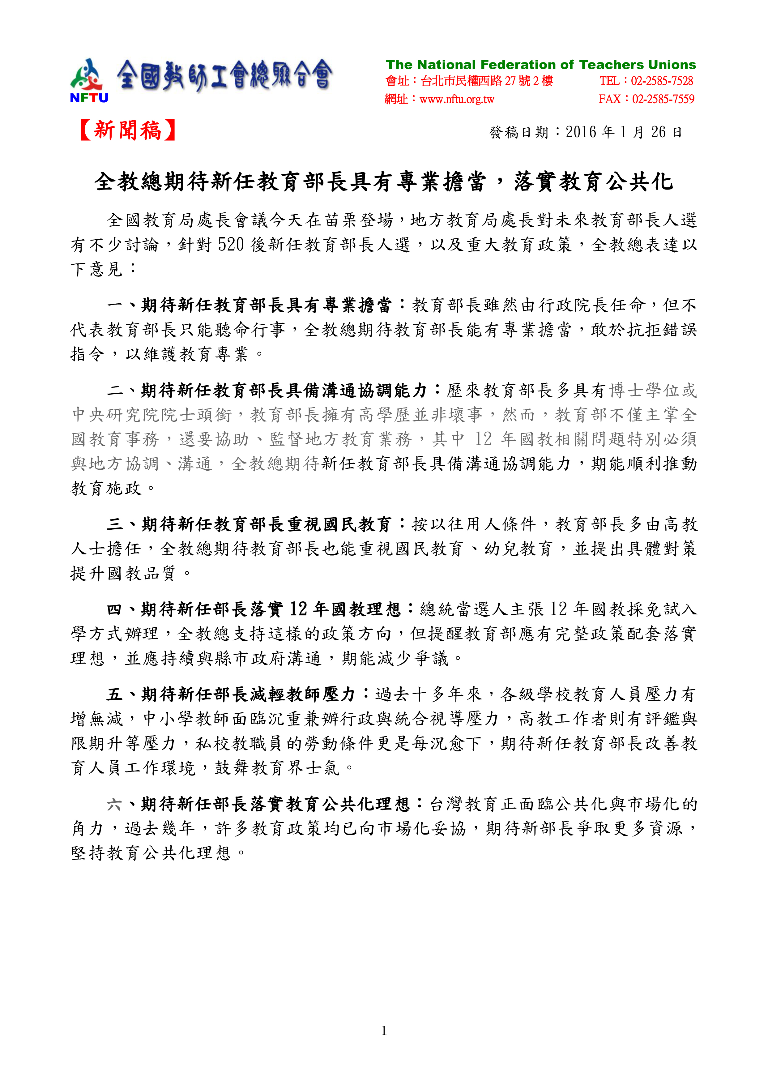 二、教育部不僅主掌全國教育事務,還要協助、監督地方教育業務,十二年國教特別必須與地方協調溝通,全教總期待新任教育部長具備其能力。
