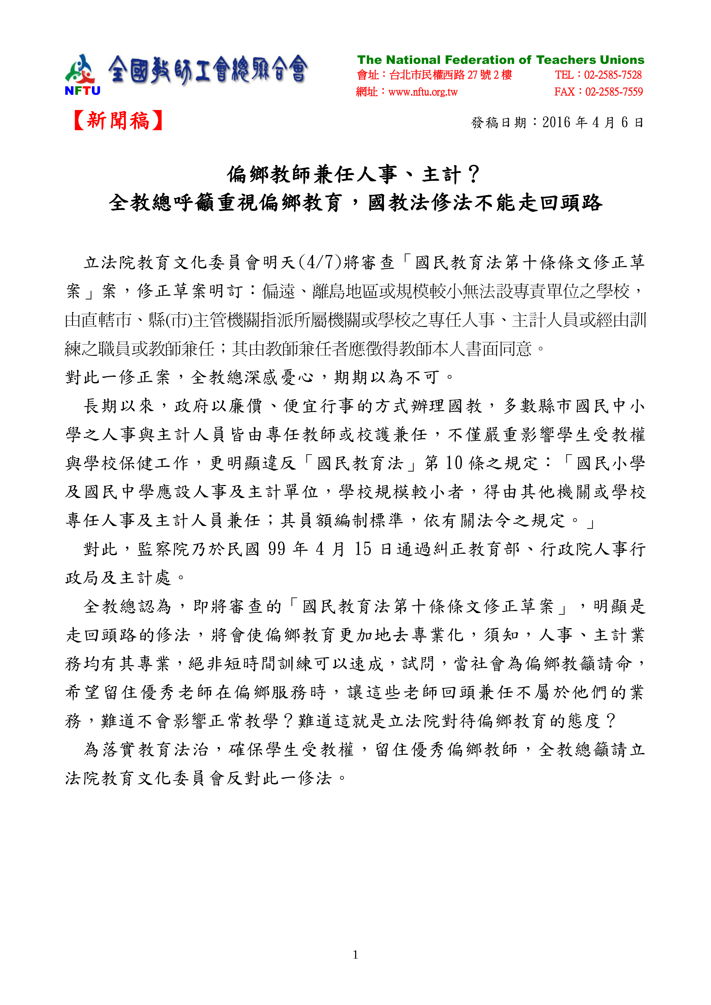 20160406【新聞稿】偏鄉教師兼任人事、主計?全教總呼籲重視偏鄉教育,國教法修法不能走回頭路