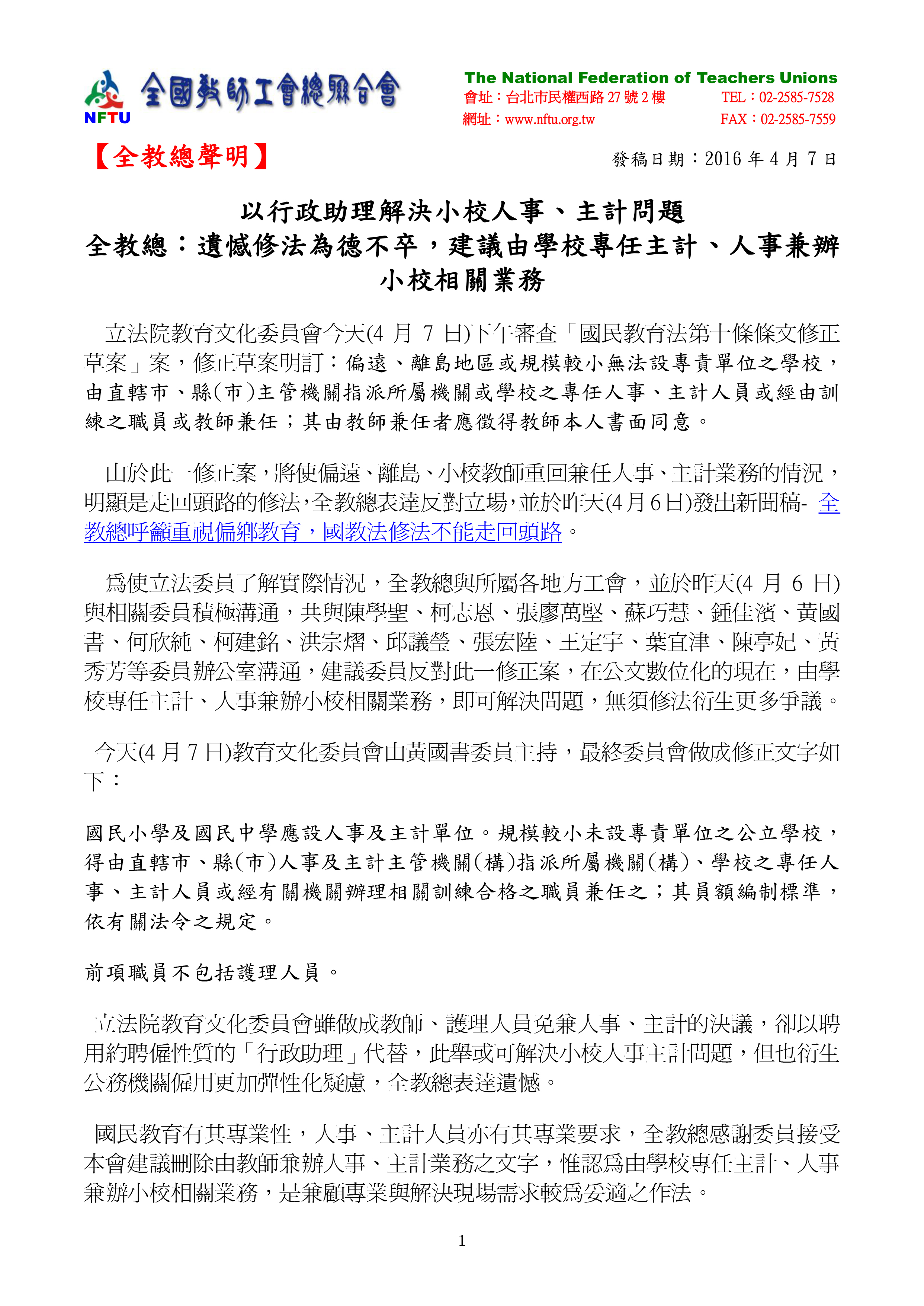 立法院教育文化委員會於2016年4月7日下午審查「國民教育法第十條條文修正草案」案,修正草案明訂:「偏遠、離島地區或規模較小無法設專責單位之學校,由直轄市、縣(市)主管機關指派所屬機關或學校之專任人事、主計人員或經由訓練之職員或教師兼任;其由教師兼任者應徵得教師本人書面同意。」全國教師工會總聯合會(簡稱全教總)認為此一修正案,將使偏遠離島、小校教師重回兼任人事、主計業務的情況,明顯是走回頭路的修法,表達反對立場,並於前一天4月6日發出「全教總呼籲重視偏鄉教育,國教法修法不能走回頭路」新聞稿。為使立法委員了解實際情況,全教總與所屬各地方工會,並於昨天與相關委員積極溝通,建議委員反對此一修正案,在公文數位化的現在,由學校專任主計、人事兼辦其他小校相關業務,即可解決問題,無須修法衍生更多爭議。4月7日委員會由黃國書委員主持,做成修正文字。全教總感謝委員接受建議,刪除由教師兼辦人事、主計業務之文字,但仍認為由學校專任主計、人事兼辦小校相關業務,是兼顧專業與解決現場需求,較為妥適之作法。
