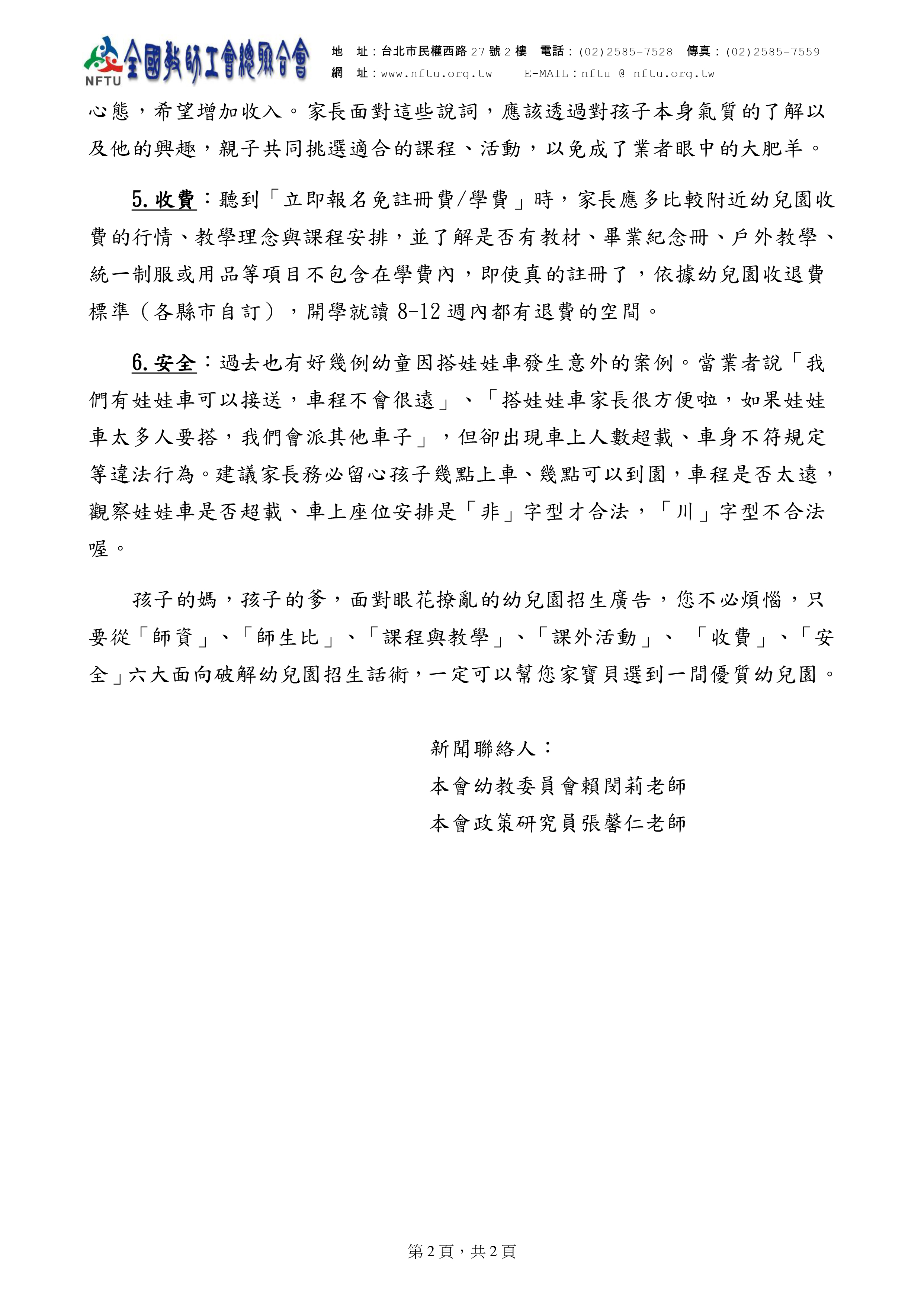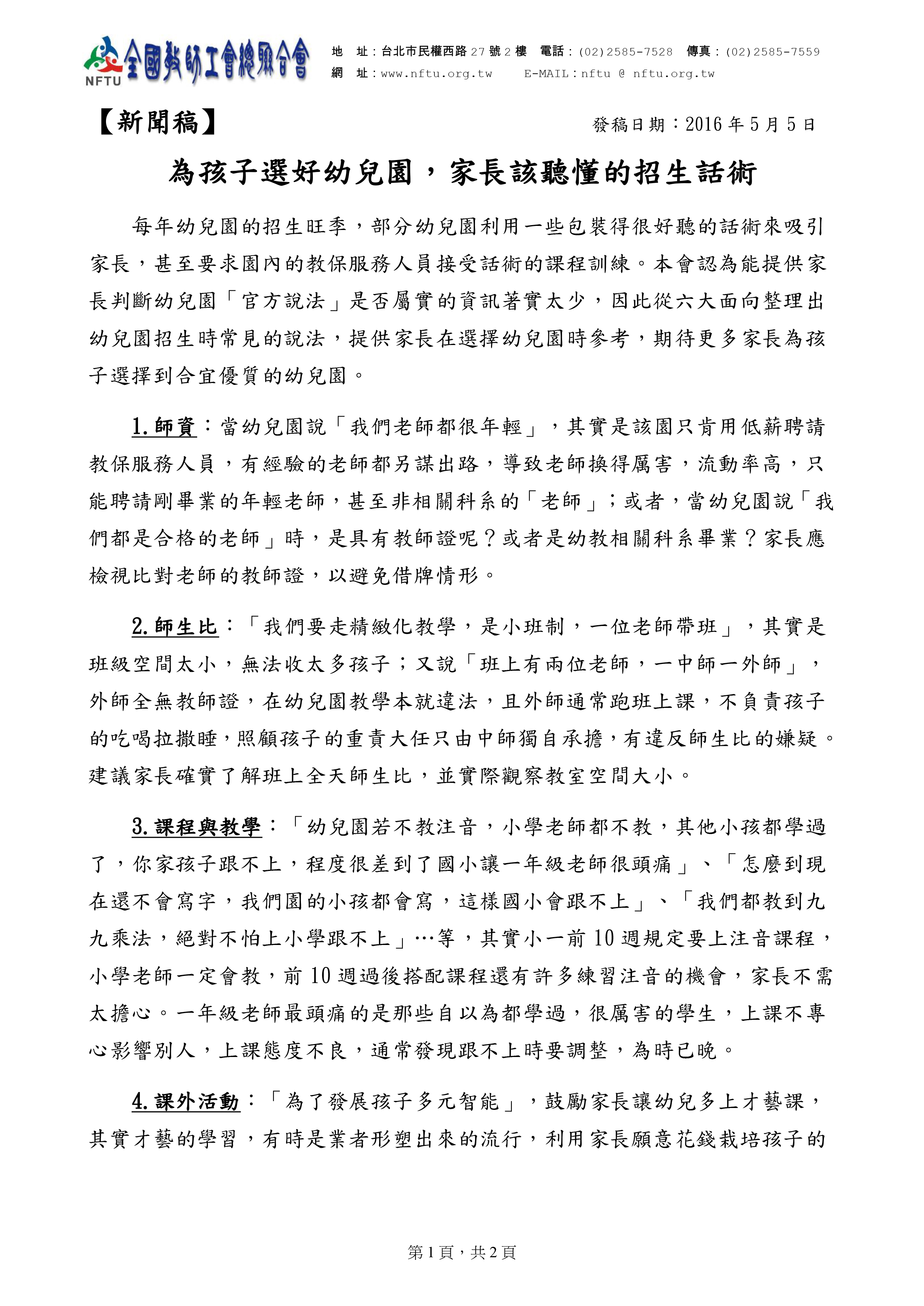 全國教師工會總聯合會(簡稱全教總)認為,能提供家長判斷幼兒園招生說法是否屬實的資訊太少,因此從六大面向整理出幼兒園招生時常見的說法,提供家長在選擇時的參考,期待更多家長為孩子選擇到合宜優質的幼兒園:
