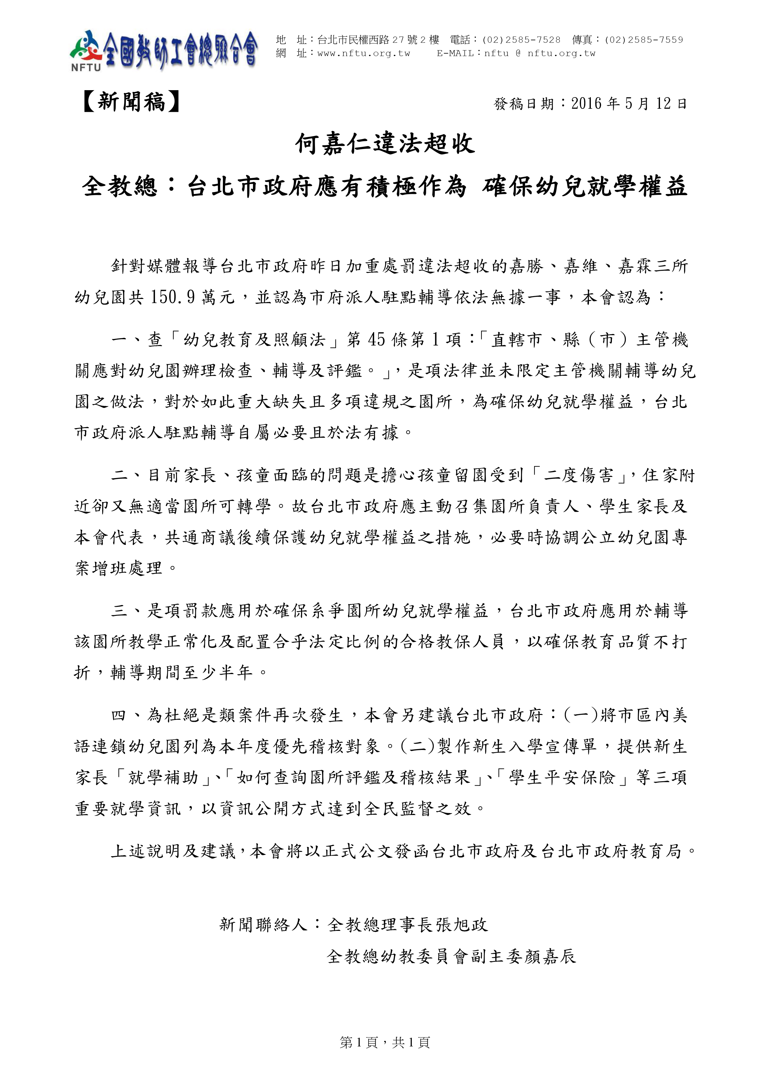 媒體報導,繼台北市政府2016年5月9日依幼兒教育及照顧法,對「嘉維」和「嘉勝」違法超收開罰,10日又查到嘉霖分校超收學生,11日加重處罰違法超收的三所幼兒園共150.9萬元,並認為市府派人駐點輔導依法無據,全國教師工會總聯合會認為: