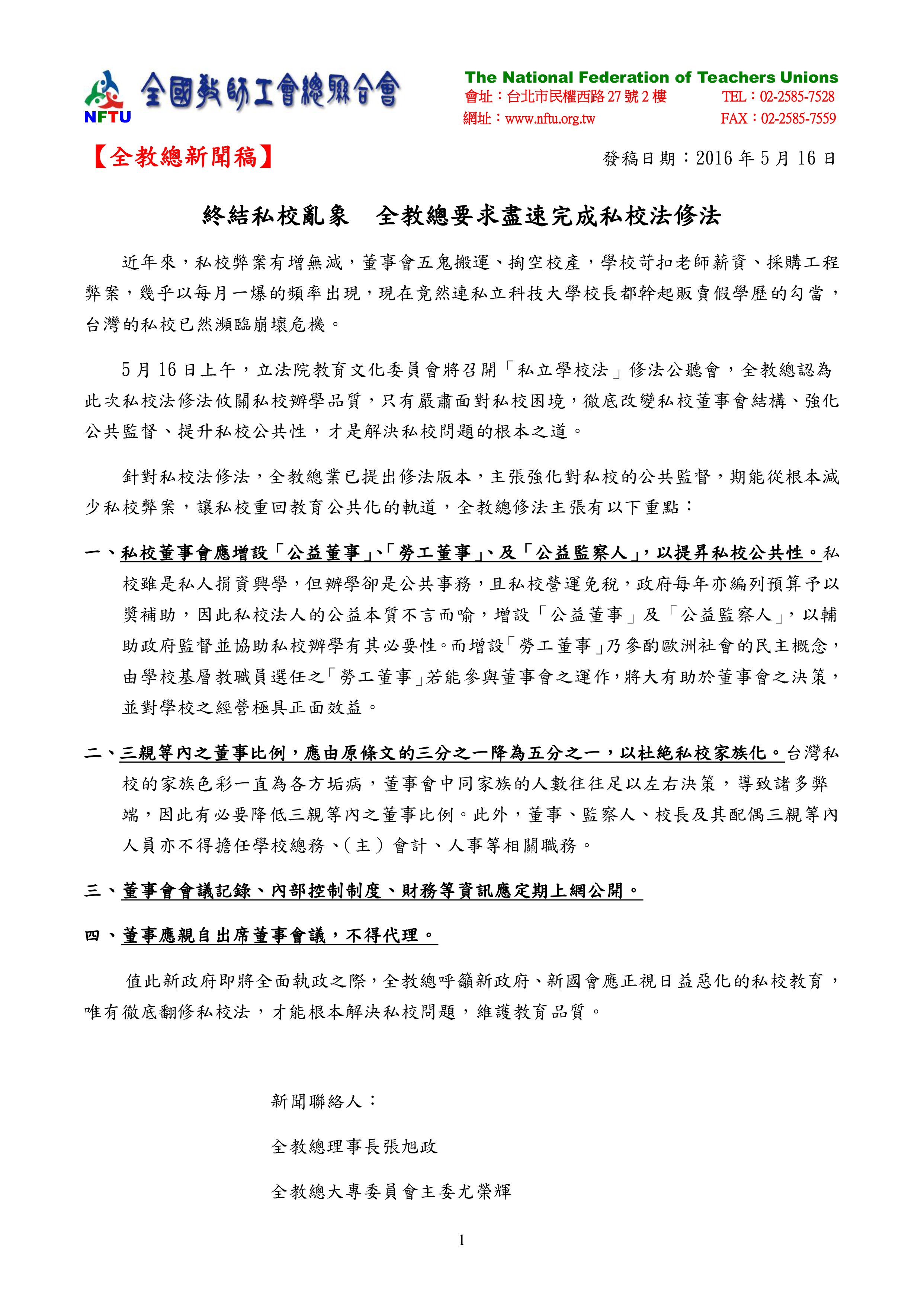 20160516【新聞稿】終結私校亂象 全教總要求盡速完成私校法修法