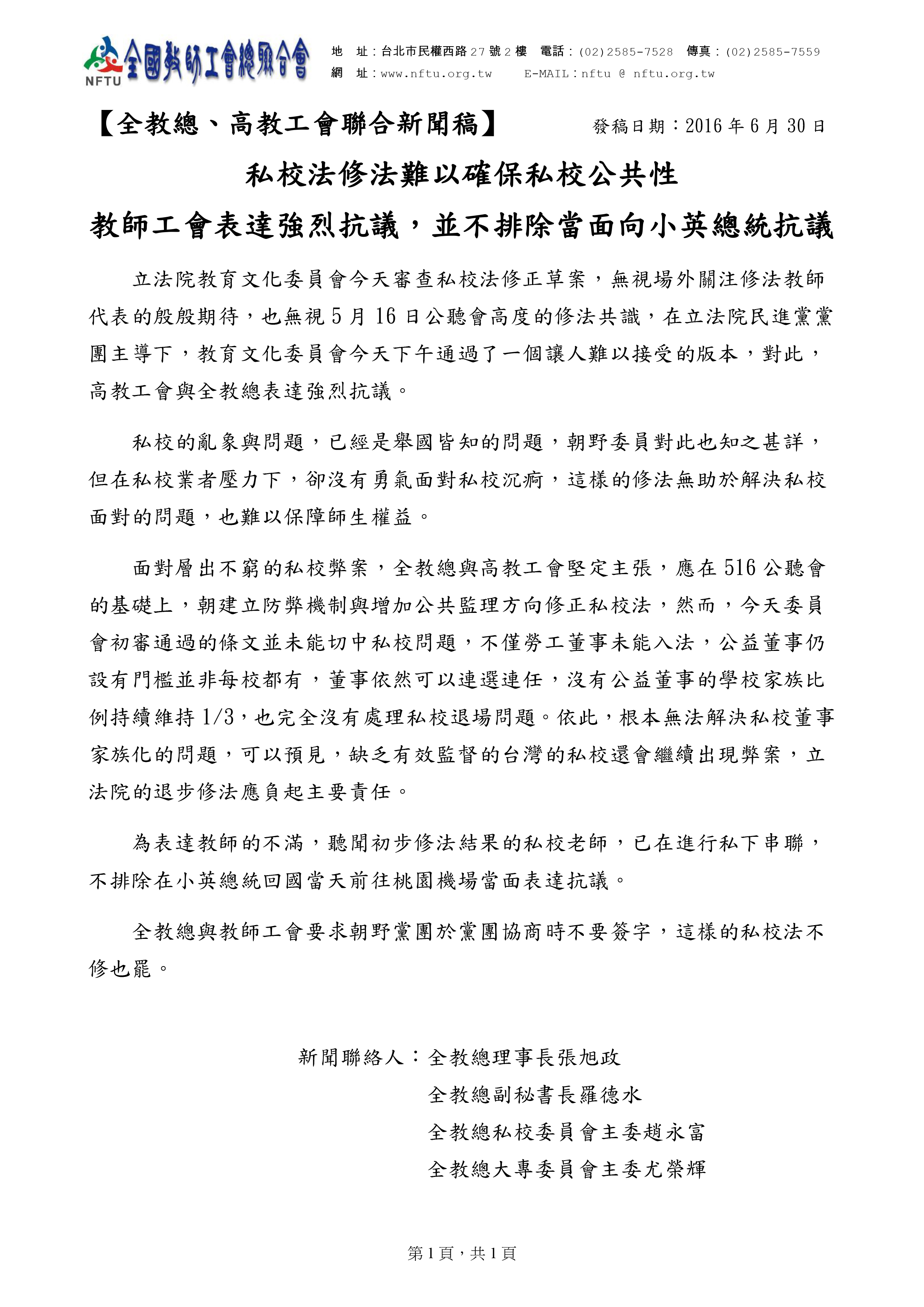 20160630【聯合新聞稿】私校法修法難以確保私校公共性,教師工會表達強烈抗議,並不排除當面向小英總統抗議