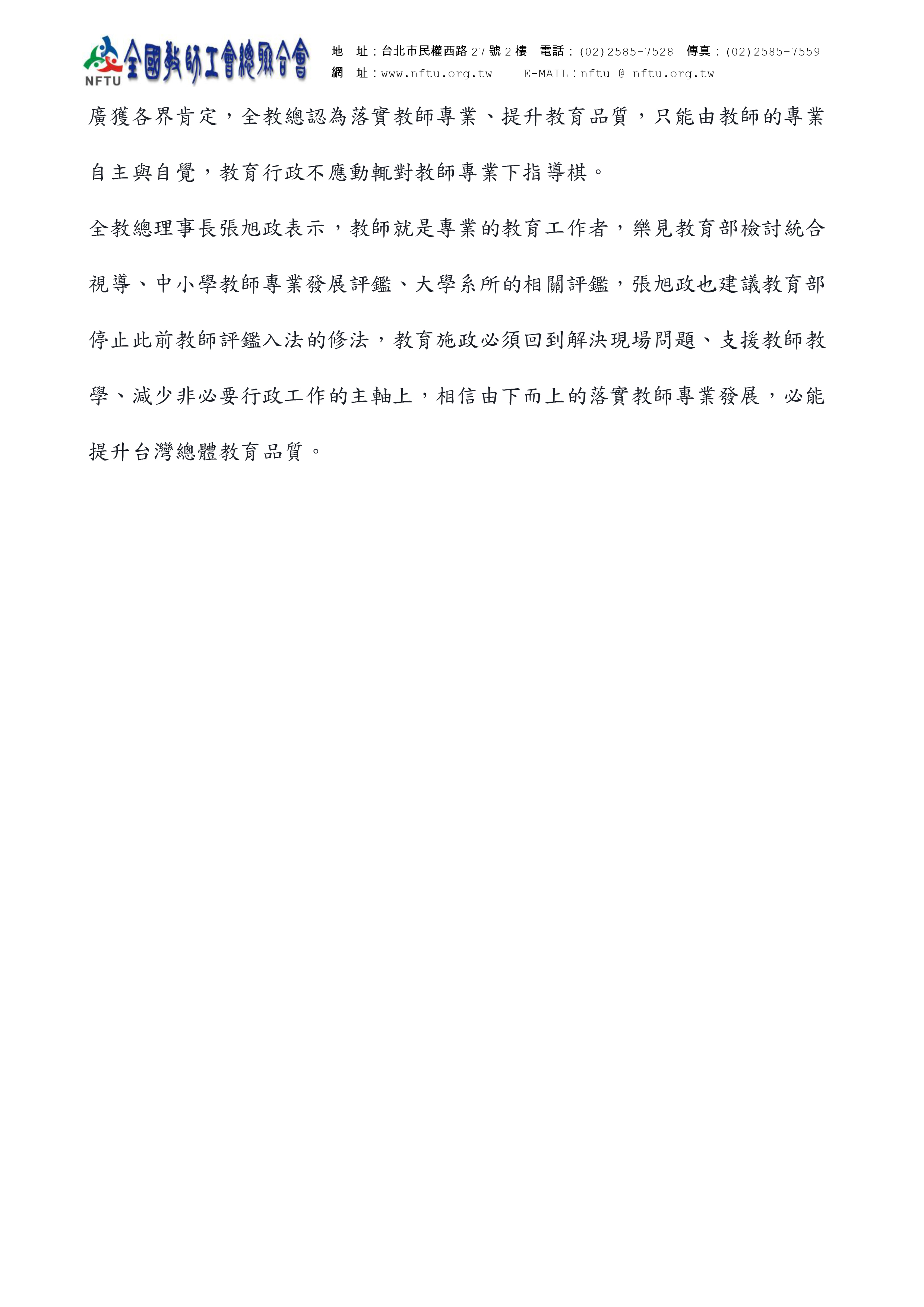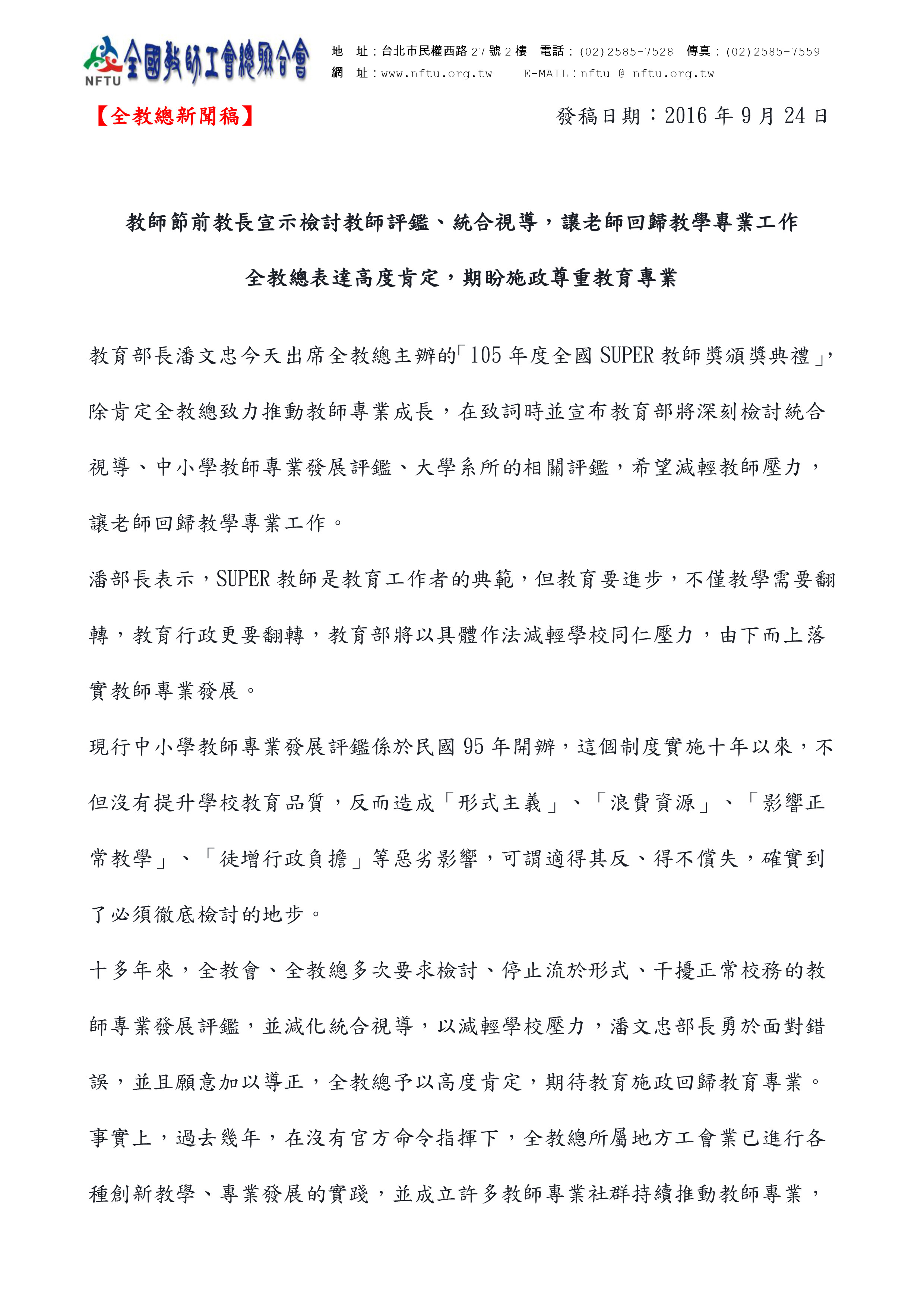 20160924【新聞稿】教師節前教長宣示檢討教師評鑑、統合視導,讓老師回歸教學專業工作 全教總表達高度肯定,期盼施政尊重教育專業