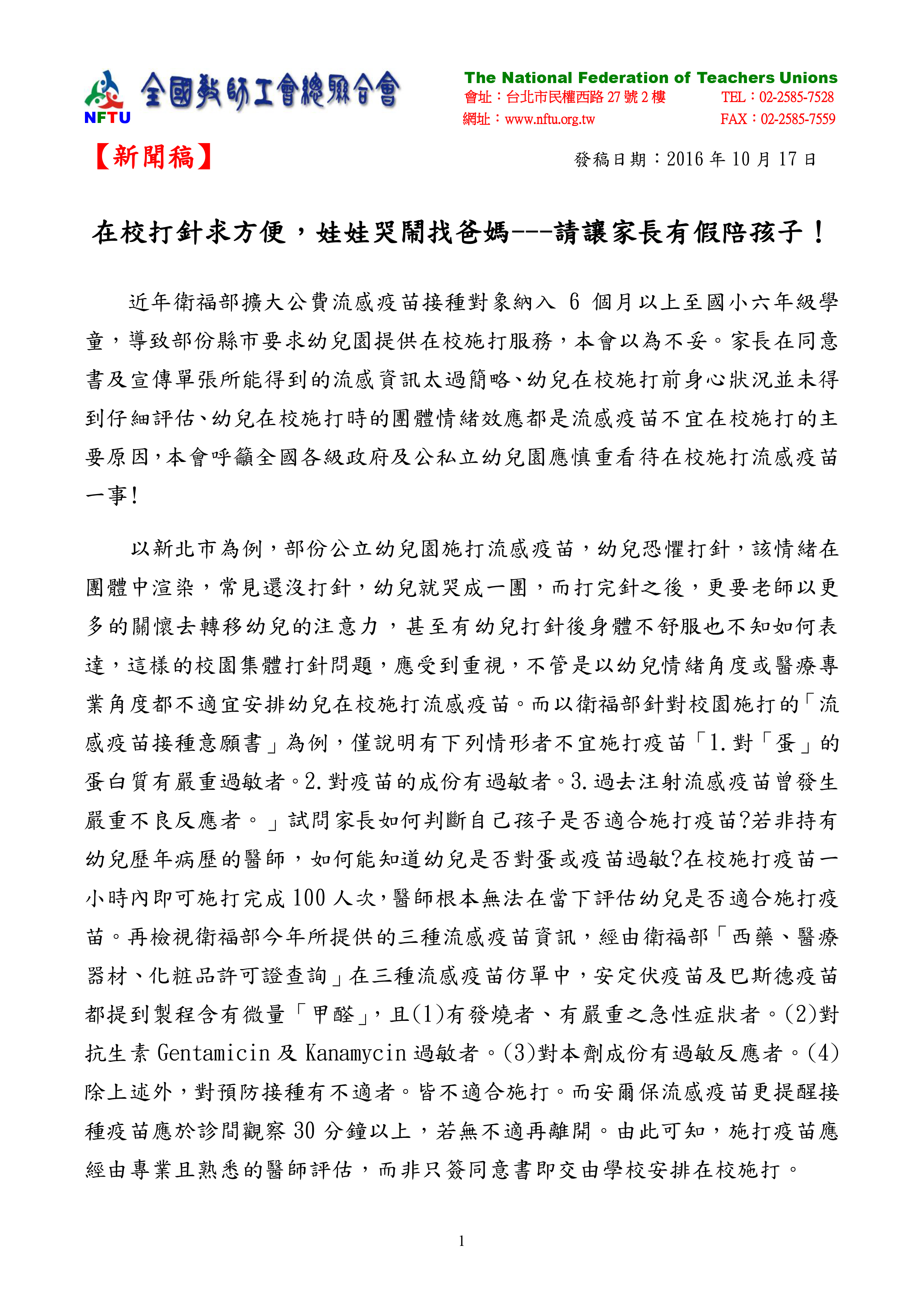 20161017【新聞稿】在校打針求方便,娃娃哭鬧找爸媽---請讓家長有假陪孩子!