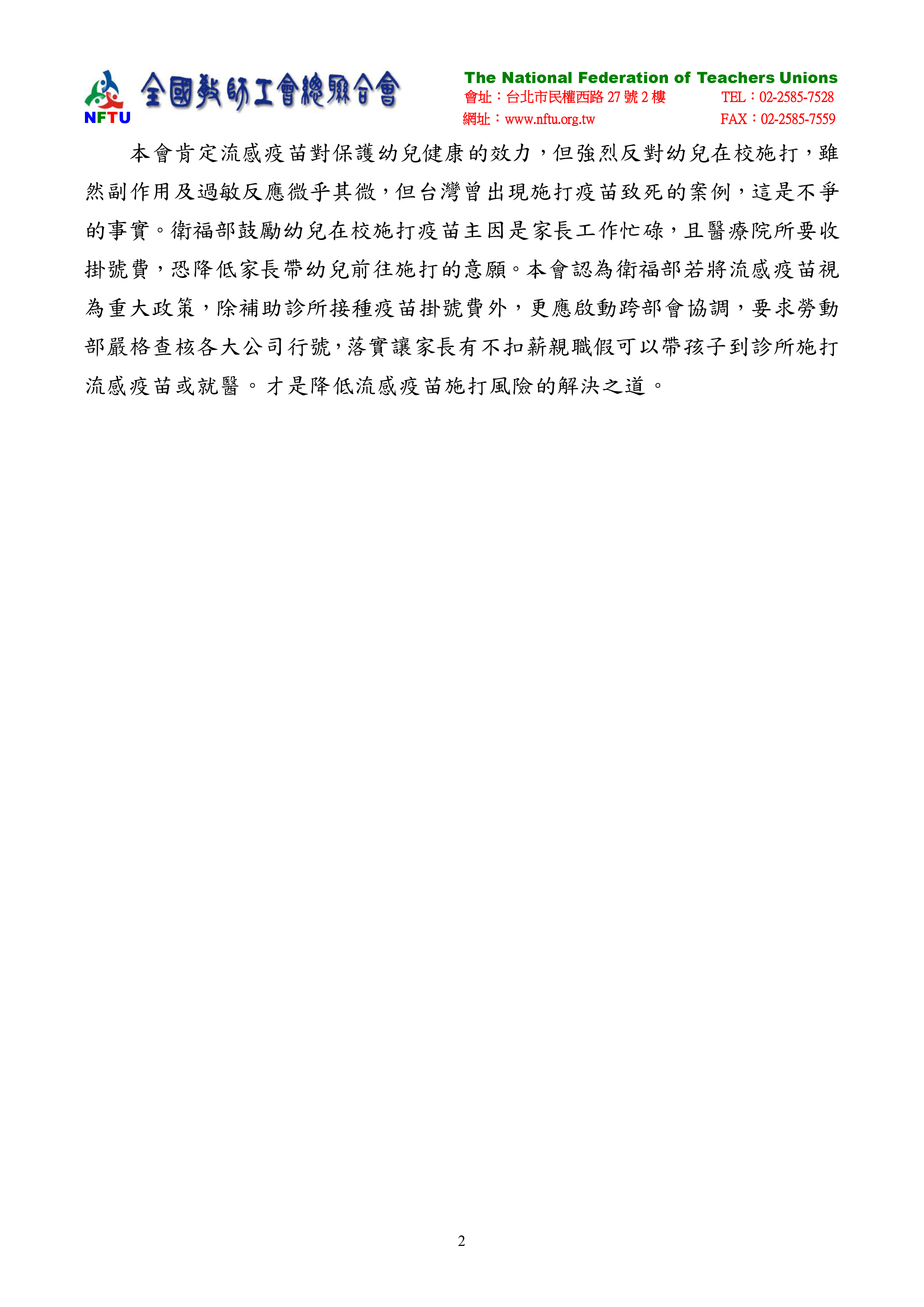 近年衛福部擴大公費流感疫苗接種對象,納入6個月以上至國小六年級學童,導致部份縣市要求幼兒園提供在校施打服務,全國教師工會總聯合會(簡稱全教總)認為不妥。家長在同意書及宣傳單張所得到的資訊太過簡略、幼兒施打前身心狀況未得到仔細評估、施打時的團體情緒效應等,都是流感疫苗不宜在校施打的主要原因,並舉新北市為例,部份公立幼兒園施打流感疫苗,有幼兒恐懼打針,該情緒在團體中渲染,常見還沒打針,幼兒就哭成一團,打完針之後,更要老師以更多的關懷去轉移幼兒的注意力等問題,不管是以幼兒情緒角度,或醫療專業角度,都不適宜安排幼兒在校施打流感疫苗。衛福部針對校園施打的「流感疫苗接種意願書」,若非持有幼兒歷年病歷的醫師,否則家長不易判斷自己孩子是否適合施打疫苗。接種疫苗應於診間觀察30分鐘以上,若無不適再離開。施打疫苗應經由專業且熟悉的醫師評估,而非只簽同意書即交由學校安排在校施打。全教總認為,衛福部若將流感疫苗視為重大政策,除補助診所接種疫苗掛號費外,更應讓家長有不扣薪親職假,帶孩子到診所施打流感疫苗或就醫。才是降低流感疫苗施打風險的解決之道。