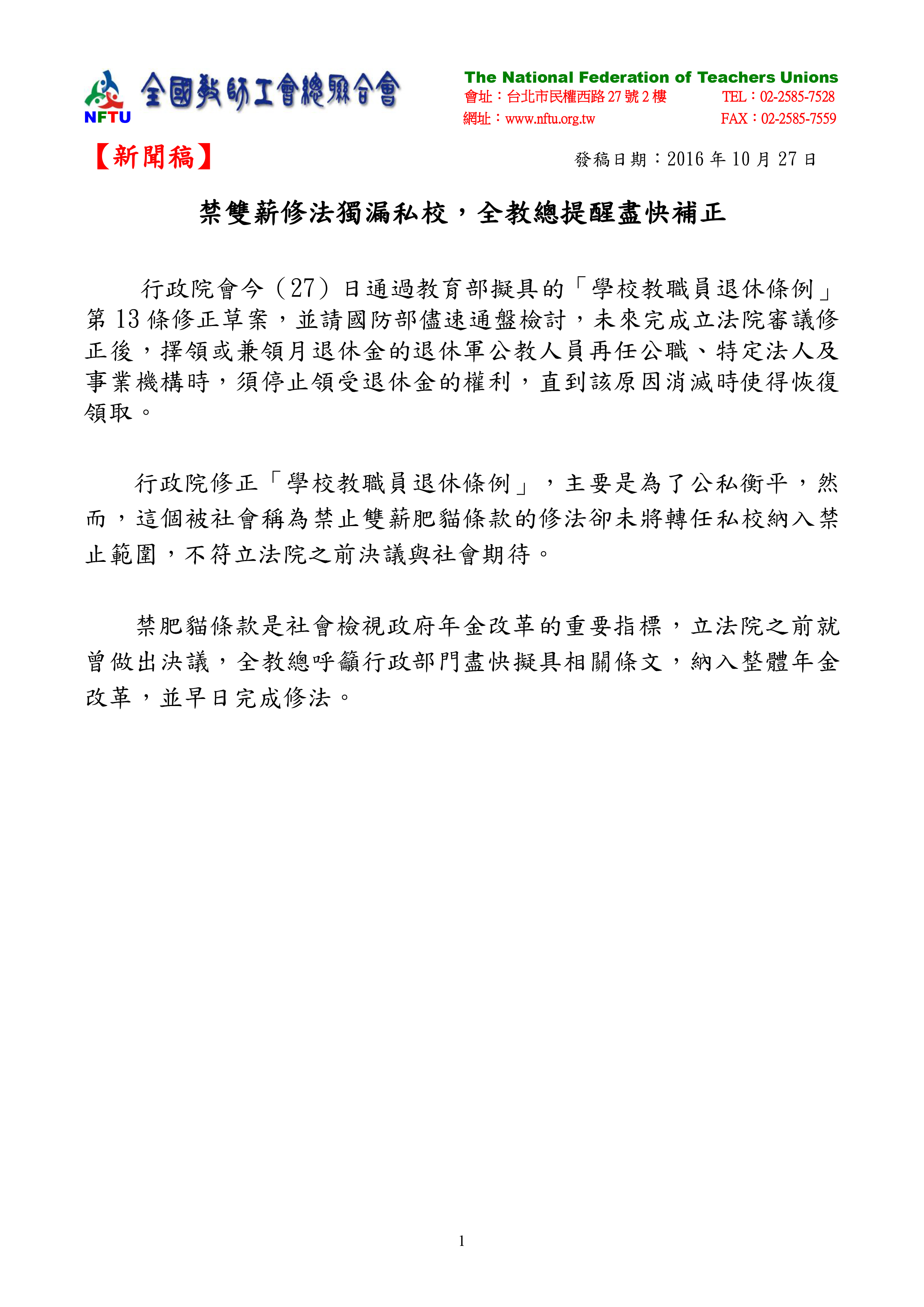20161027【新聞稿】禁雙薪修法獨漏私校,全教總提醒盡快補正