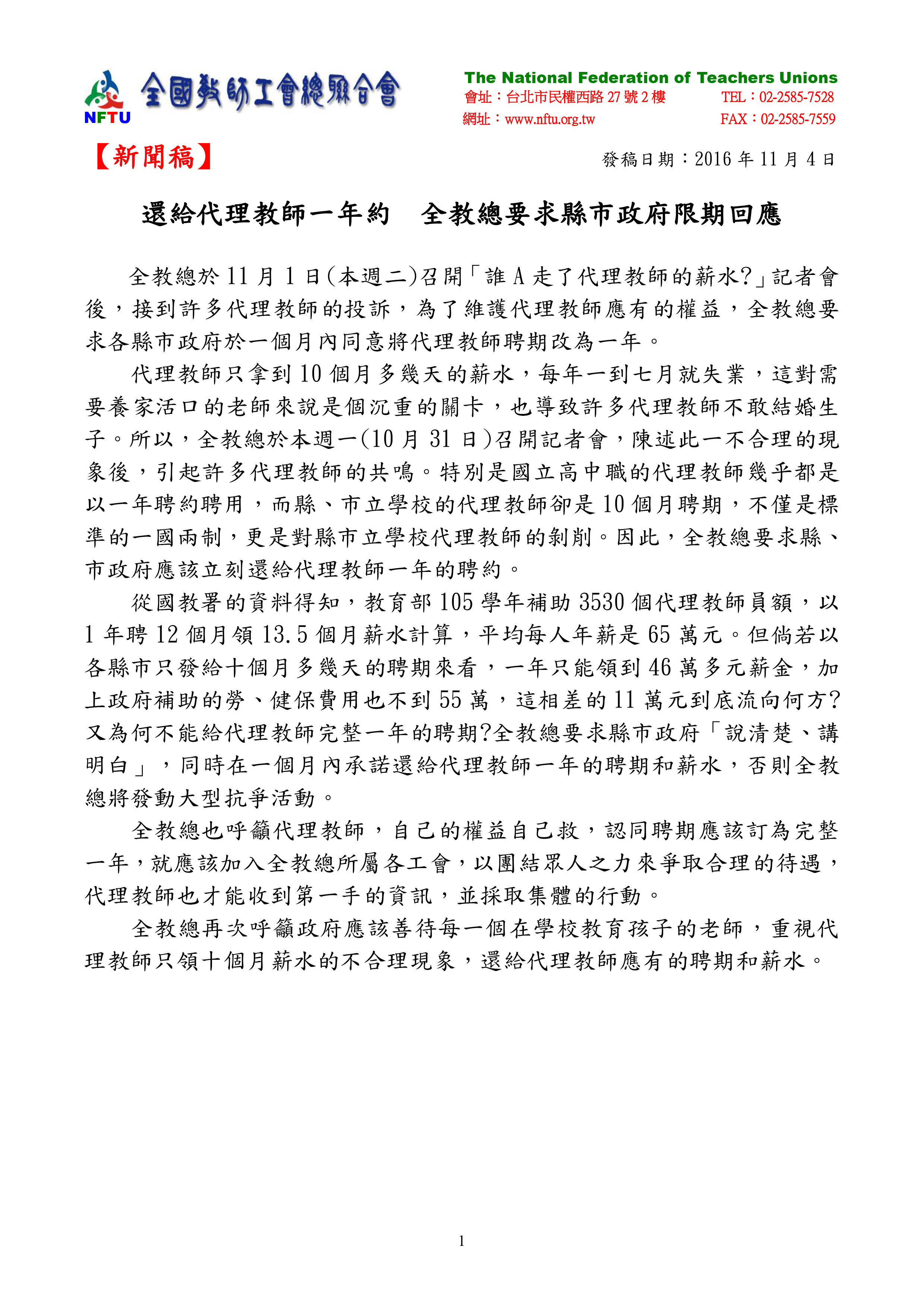 20161104【新聞稿】還給代理教師一年約 全教總要求縣市政府限期回應