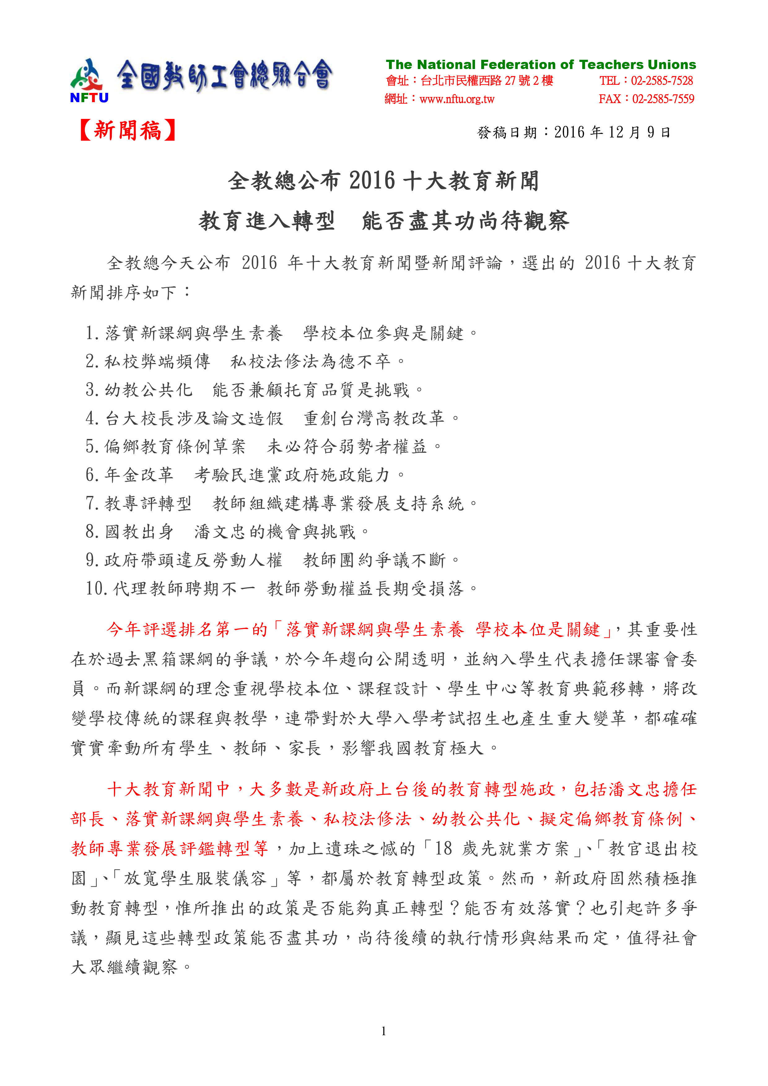 全國教師工會總聯合會(簡稱全教總)於2016年12月9日公布2016年十大教育新聞暨新聞評論,選出的2016十大教育新聞如下: