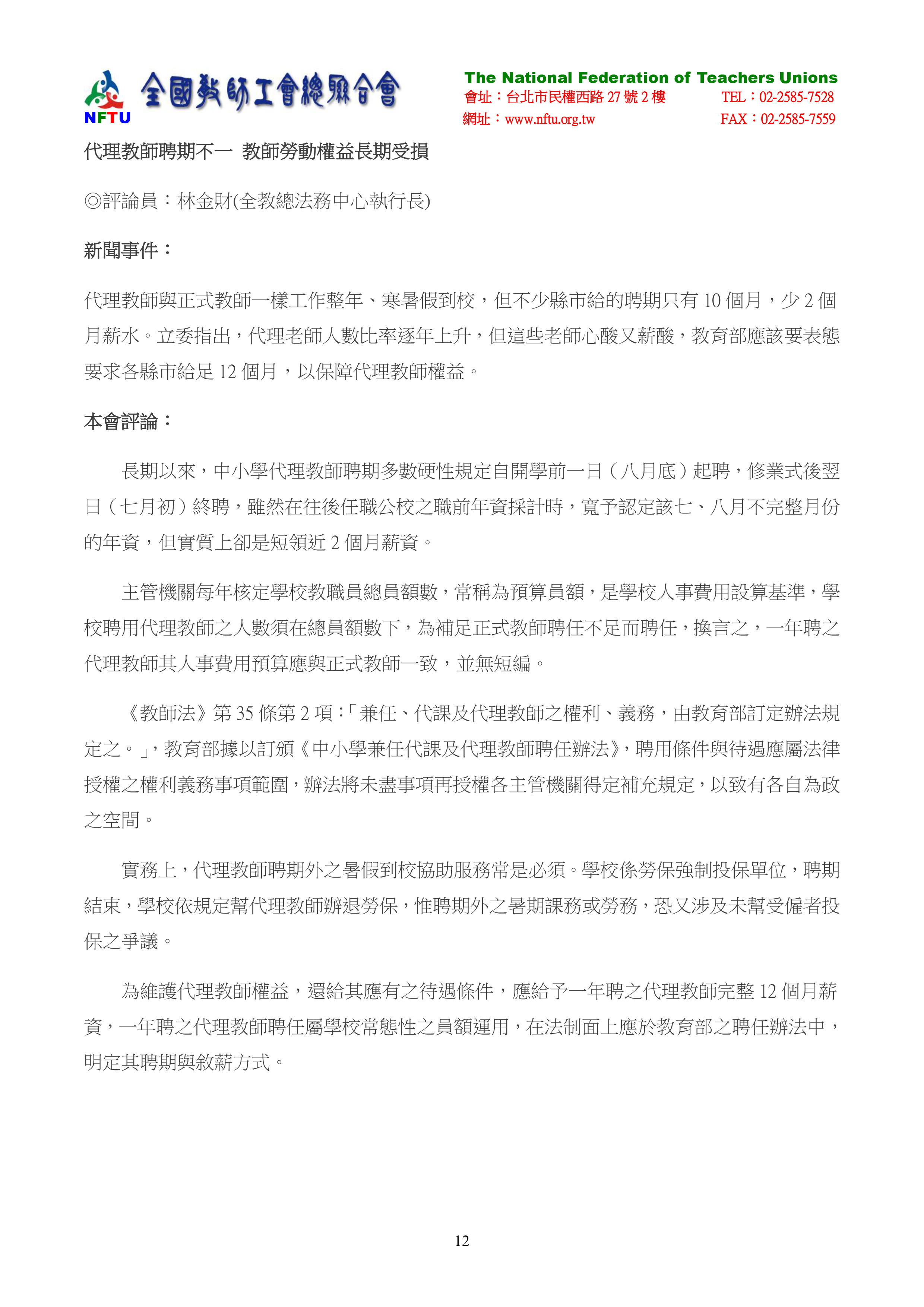 10.代理教師聘期不一 教師勞動權益長期受損落。
