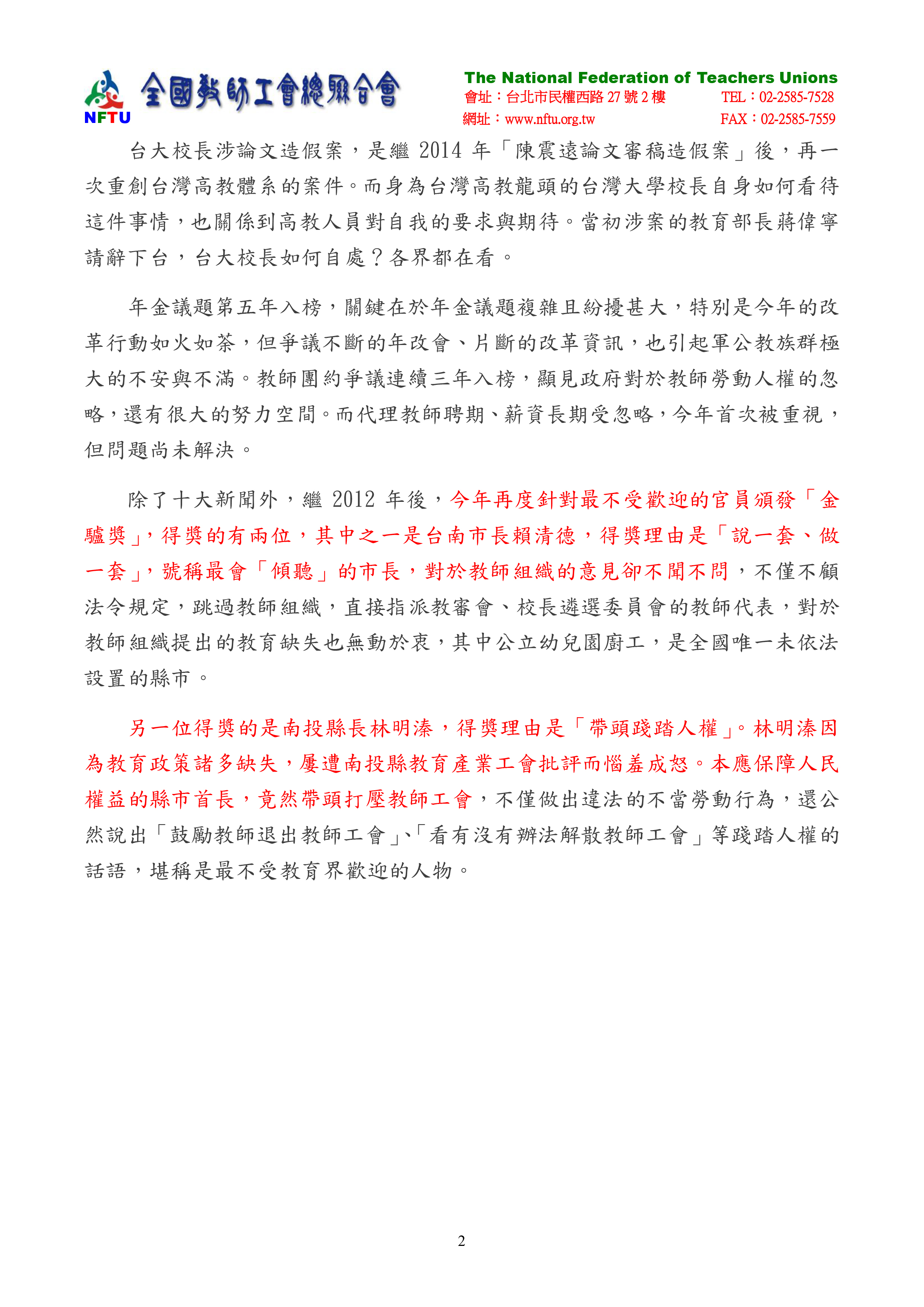 十大教育新聞中,大多數是新政府上台後的教育轉型施政,惟所推出的政策是否能夠真正轉型?能否有效落實?也引起許多爭議,尚待後續的執行情形與結果而定,值得社會大眾繼續觀察。除了十大新聞外,繼2012年後,今年再度針對最不受歡迎的官員頒發「金驢獎」,得獎的有台南市長賴清德及南投縣長林明溱兩位。