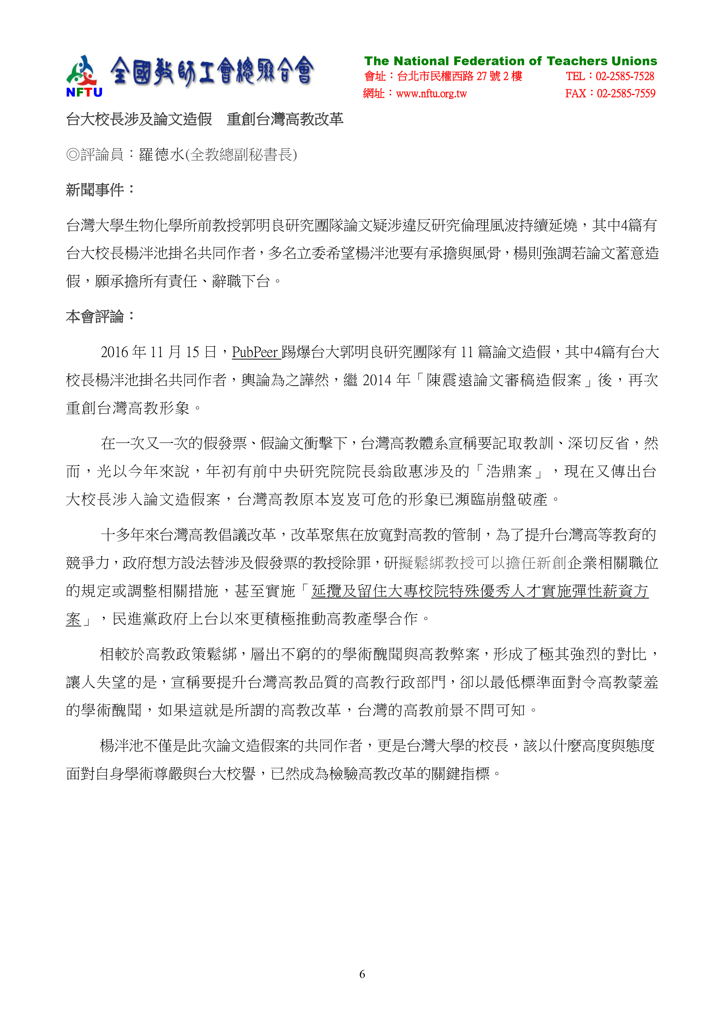 4.台大校長涉及論文造假 重創台灣高教改革。