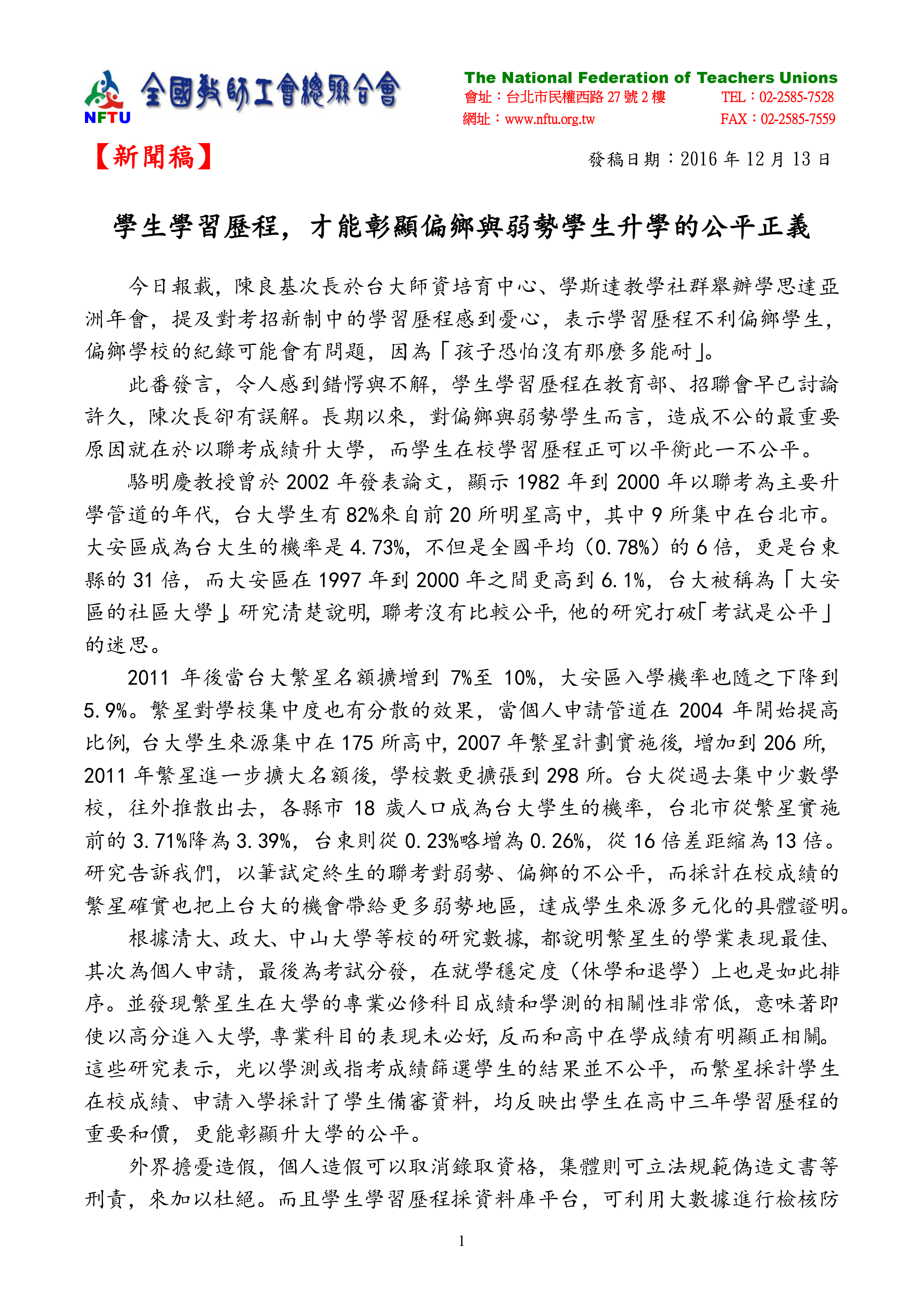 20161213【新聞稿】學生學習歷程,才能彰顯偏鄉與弱勢學生升學的公平正義