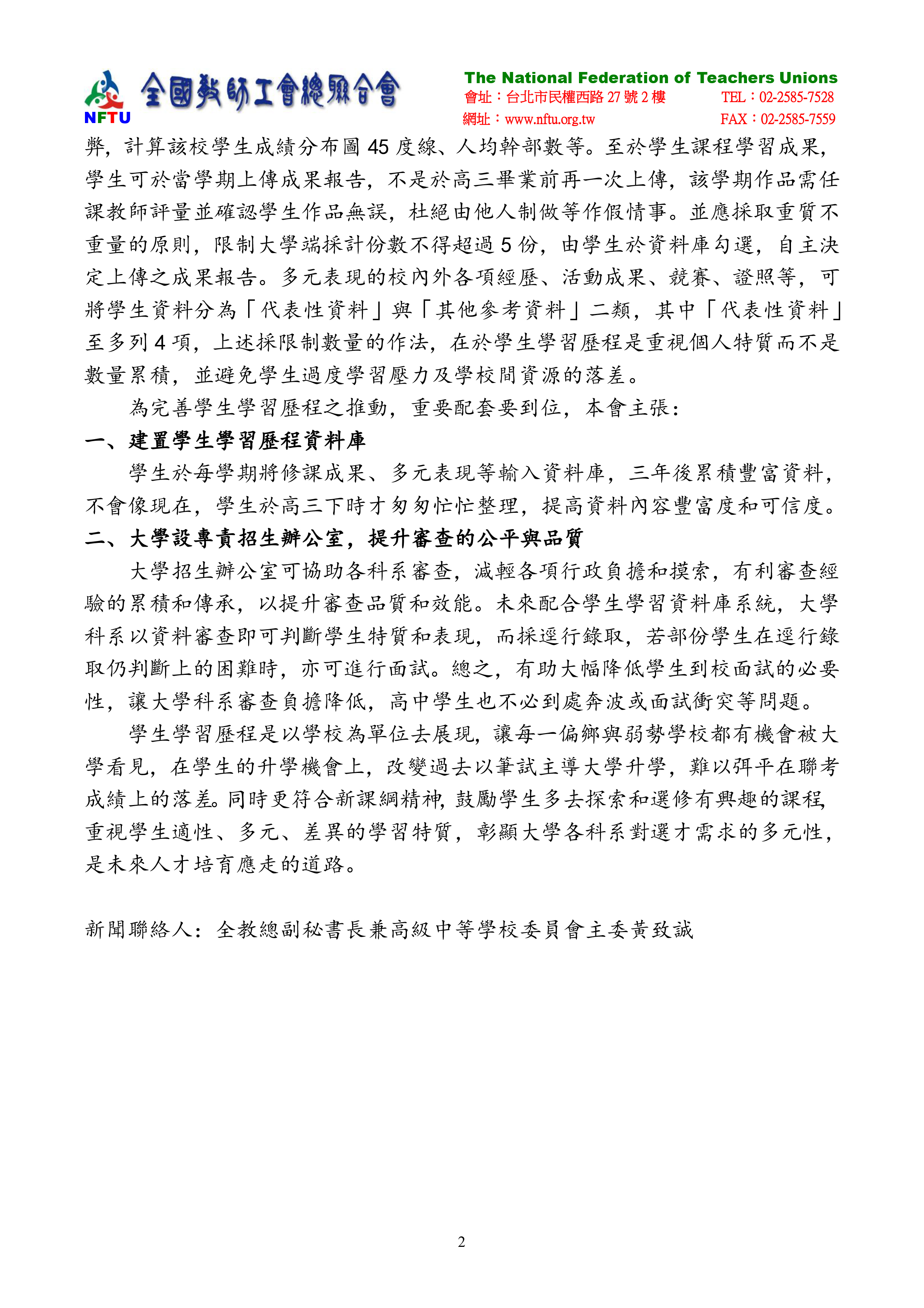 2016年12月13日報載,教育部陳良基次長出席學思達亞洲年會,提及對考招新制中的學習歷程感到憂心,表示學習歷程不利偏鄉學生,偏鄉學校的紀錄可能會有問題,因為「孩子恐怕沒有那麼多能耐」。此番發言,令人感到錯愕與不解,學生學習歷程在教育部、招聯會早已討論許久。長期以來,對偏鄉與弱勢學生,造成不公的最重要原因就在於以聯考成績升大學,而學生在校學習歷程正可以平衡此一不公平。全國教師工會總聯合會(簡稱全教總)舉出駱明慶教授於2002年發表的論文,他的研究打破「考試是公平」的迷思,也顯示,以筆試定終生的聯考對弱勢、偏鄉的不公平,而採計在校成績的繁星確實也把上台大的機會帶給更多弱勢地區,達成學生來源多元化的具體證明。全教總再指出,根據清大、政大、中山大學等校的研究數據,也可說明繁星採計學生在校成績、申請入學採計了學生備審資料,均反映出學生在高中三年學習歷程的重要和價值,更能彰顯升大學的公平。對外界擔憂造假,全教總認為可以取消錄取資格,集體則可立法規範偽造文書等刑責,來加以杜絕。並提出建置學生學習歷程資料庫,及大學設專責招生辦公室,提升審查的公平與品質等二點主張。
