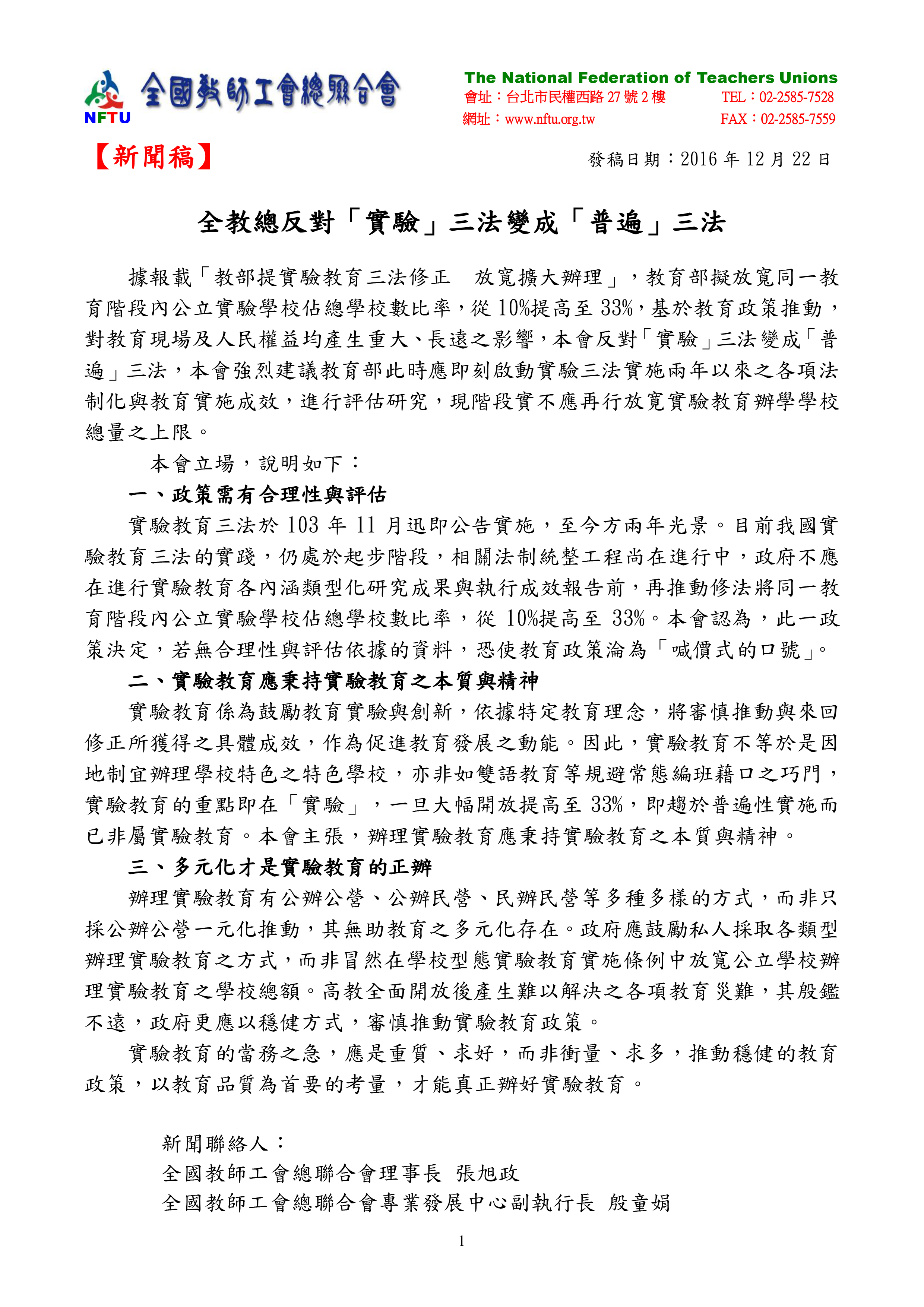 20161222【新聞稿】全教總反對「實驗」三法變成「普遍」三法