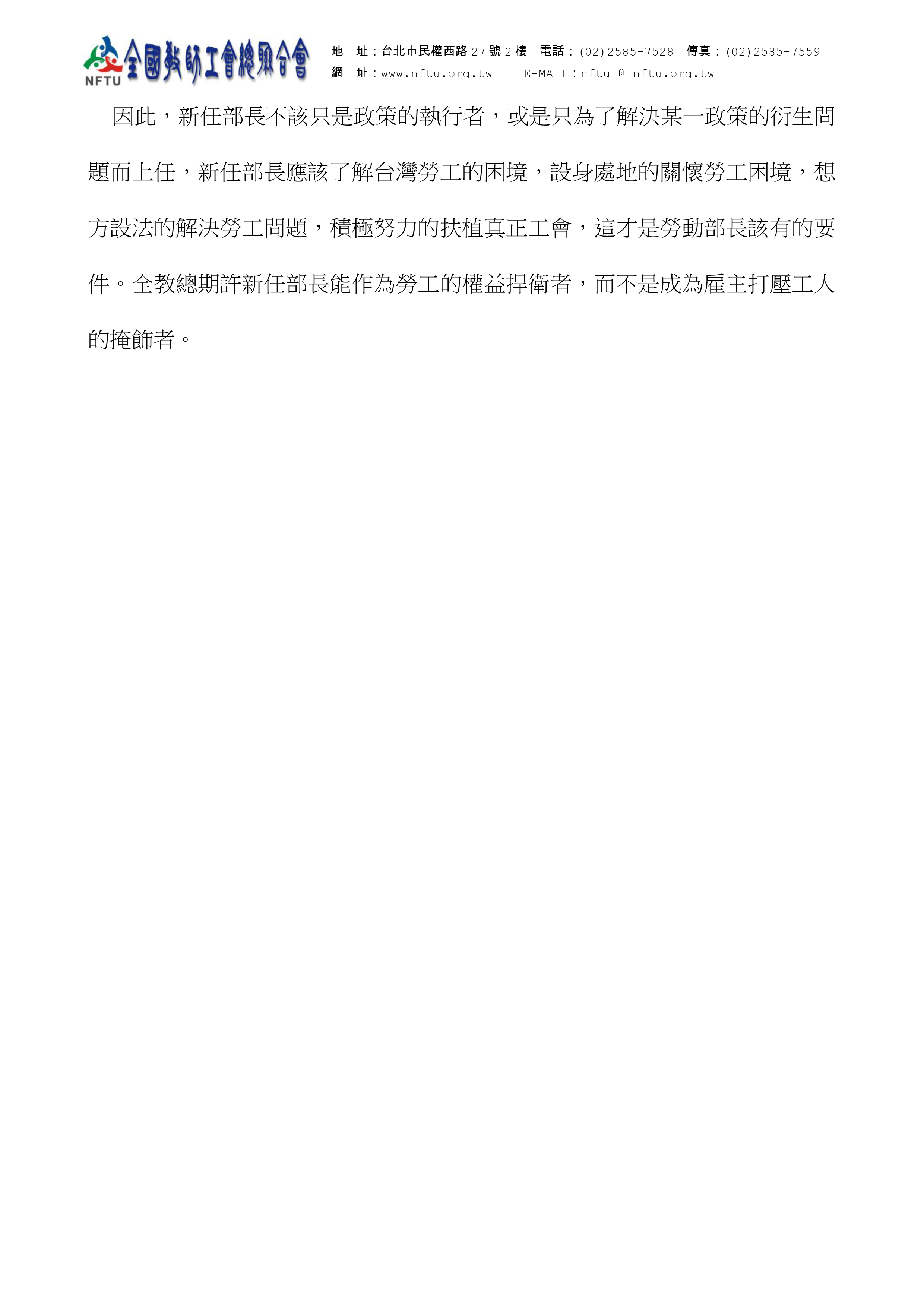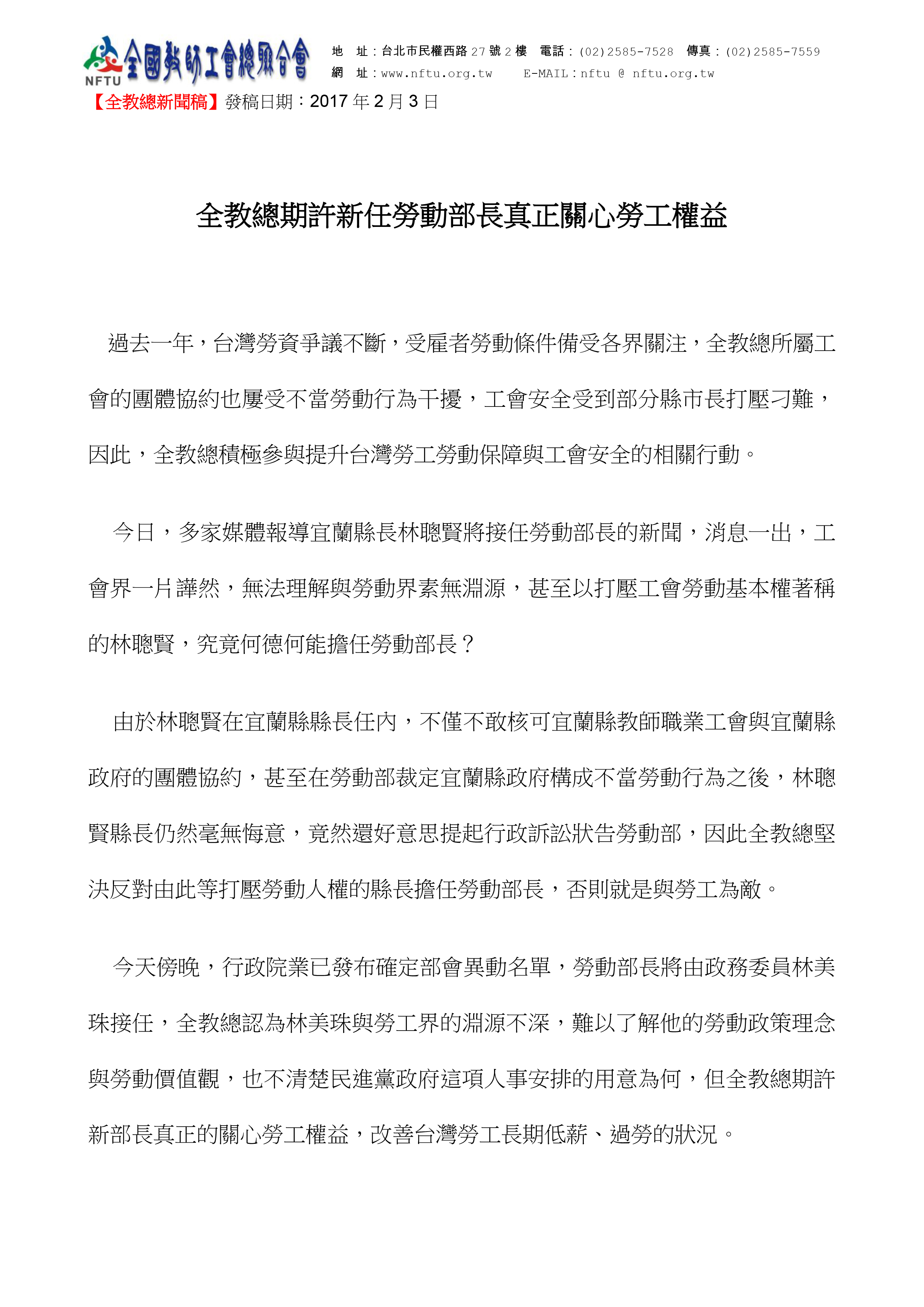 20170203【新聞稿】全教總期許新任勞動部長真正關心勞工權益