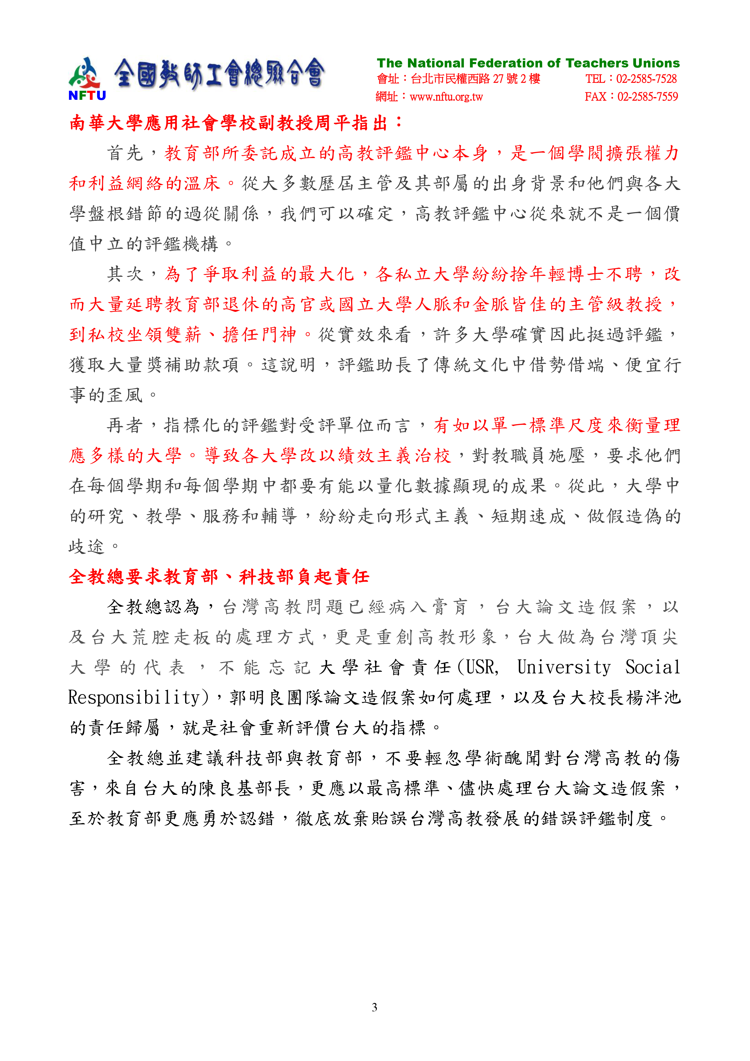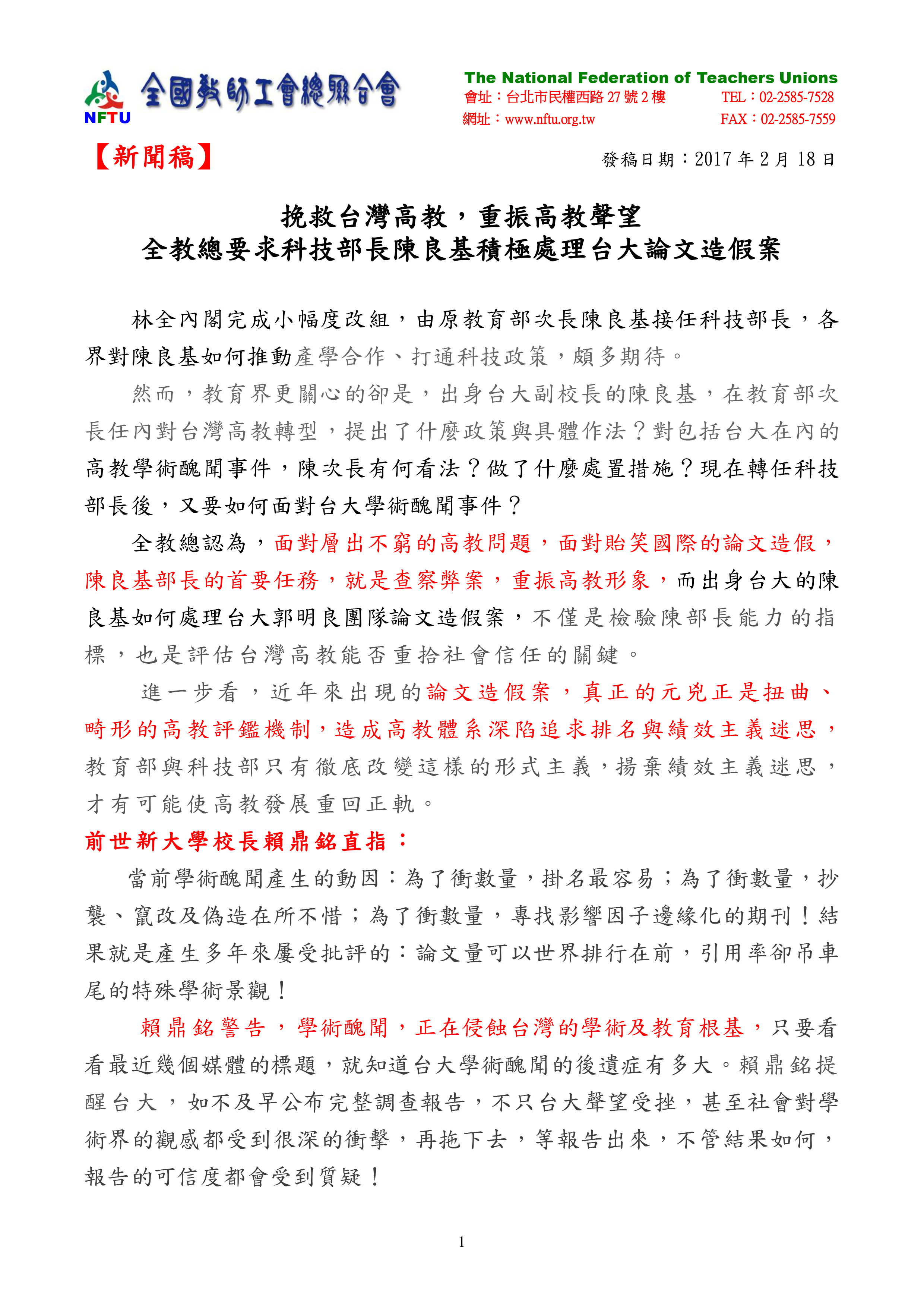 20170218【新聞稿】挽救台灣高教,重振高教聲望 全教總要求科技部長陳良基積極處理台大論文造假案